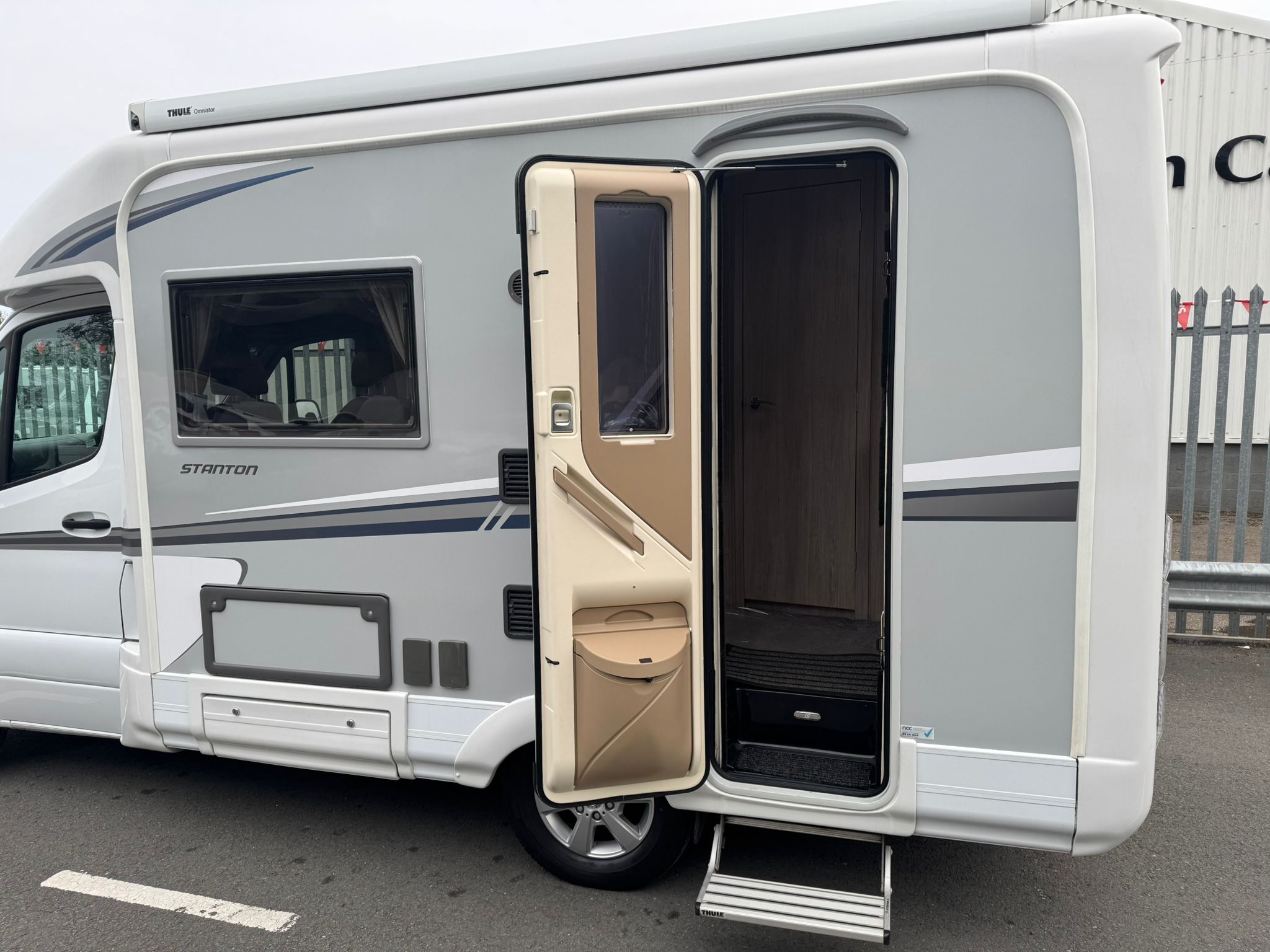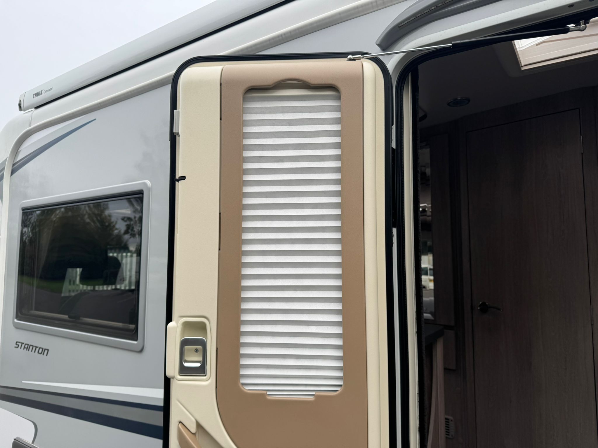 - Exterior Features: The Stanton is as practical on the outside as it is comfortable on the inside. It comes with a fitted Thule Omnistor wind-out awning to provide a sheltered outdoor space, and an electric entrance step for easy access. The smart alloy wheels complete the premium look.