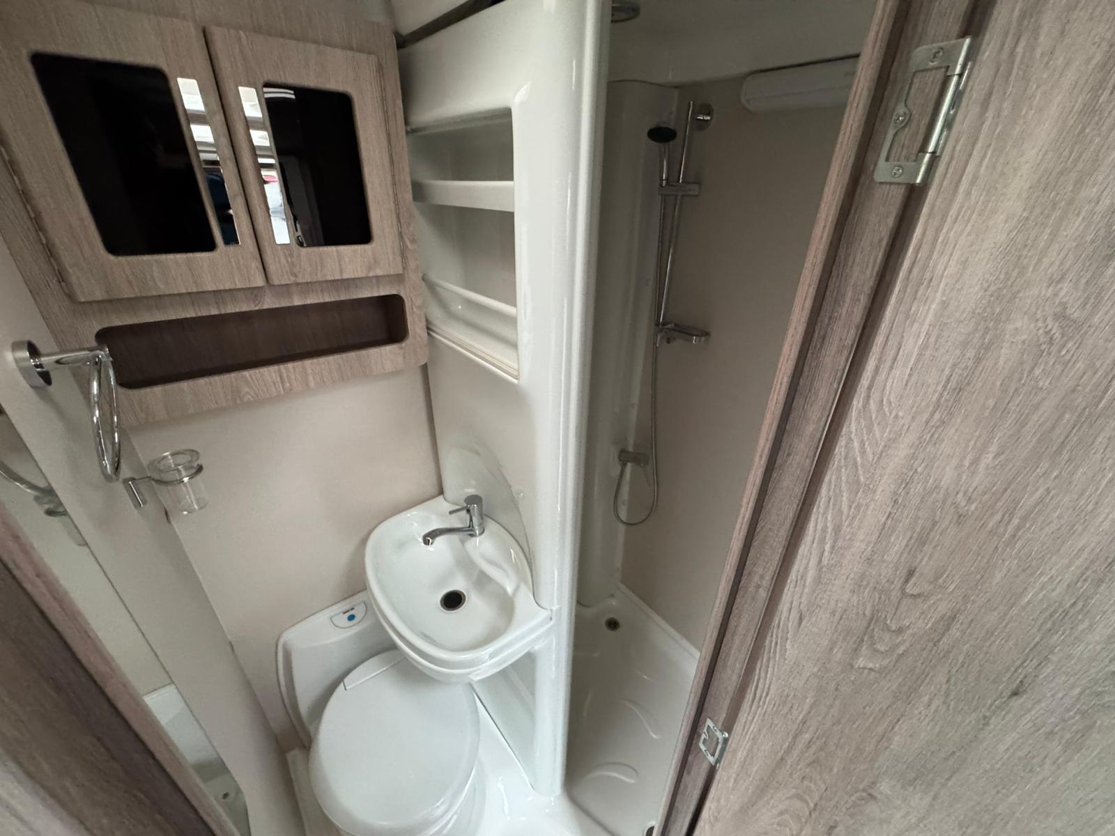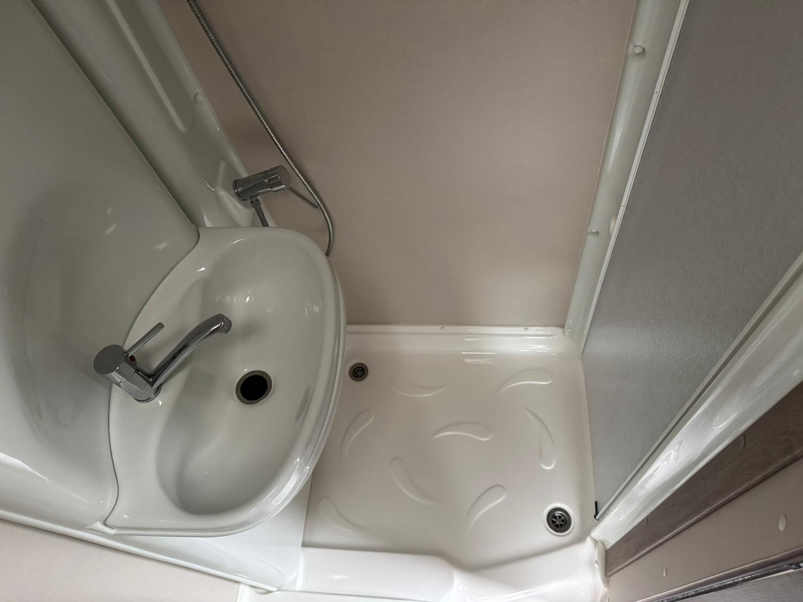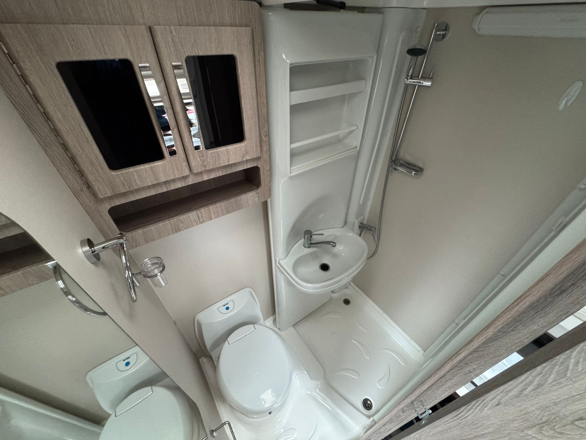 - Washroom: Spanning the full width at the rear is a surprisingly spacious washroom. It contains a combined toilet and shower area, a washbasin, and good storage, giving you a proper, private bathroom.