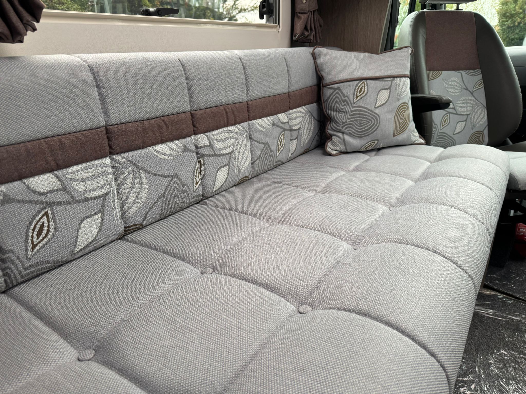 - Lounge & Sleeping Area: The front of the motorhome is dedicated to a spacious and comfortable lounge with two parallel sofas. The cab seats swivel to create a large social space, and the upholstery is a stylish combination of leather and textile. We find this layout is incredibly versatile, as the sofas can be used as two single beds or can easily be converted into a large double.