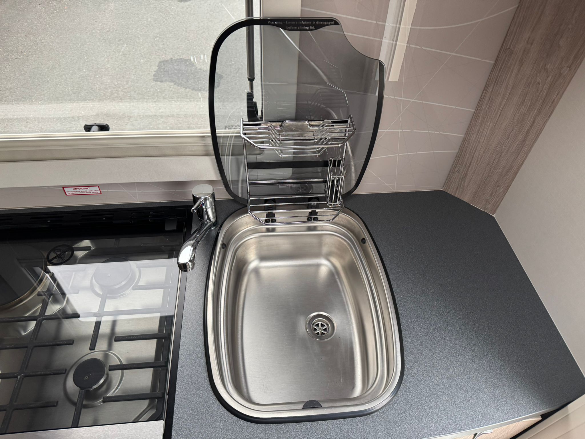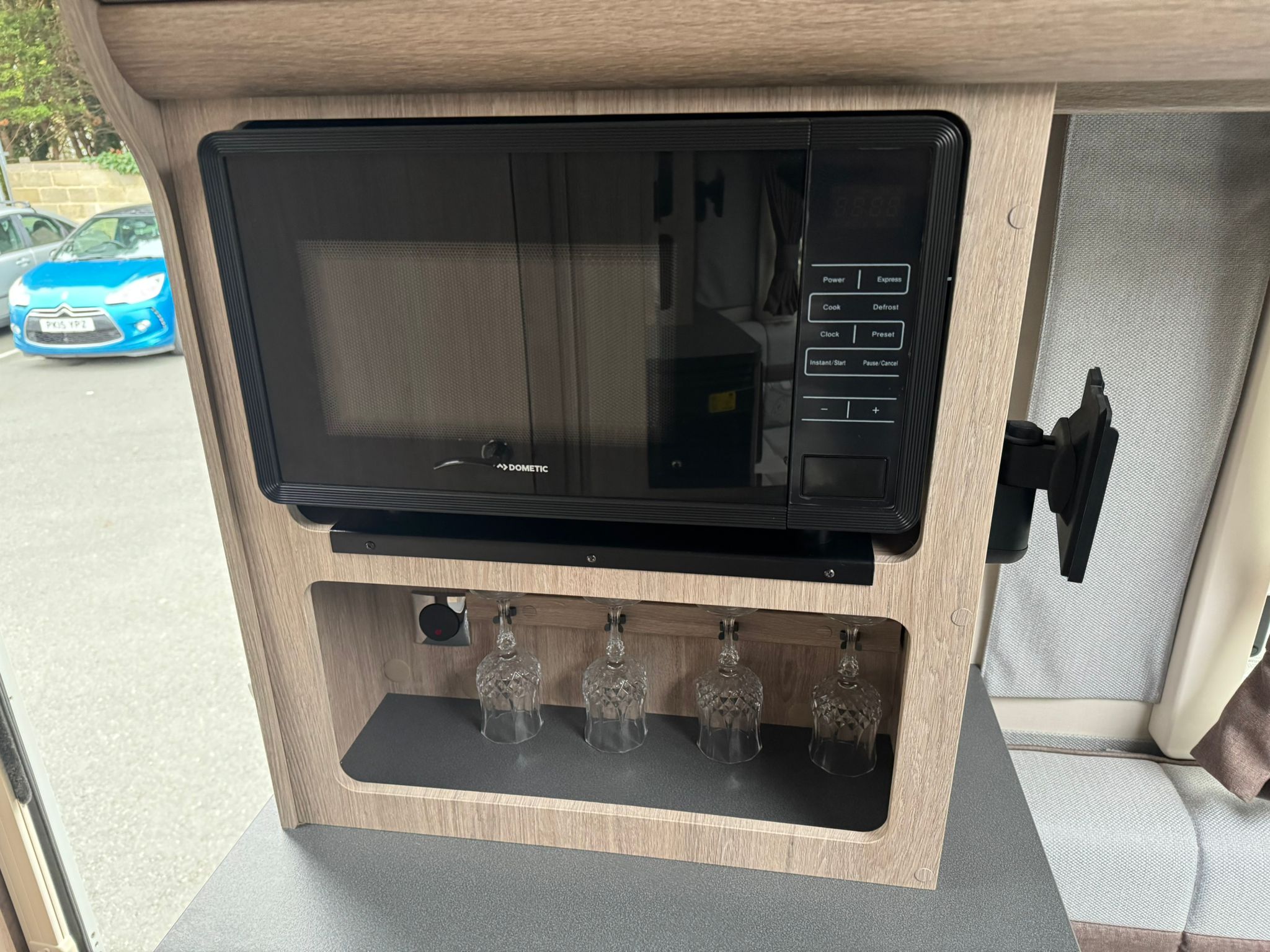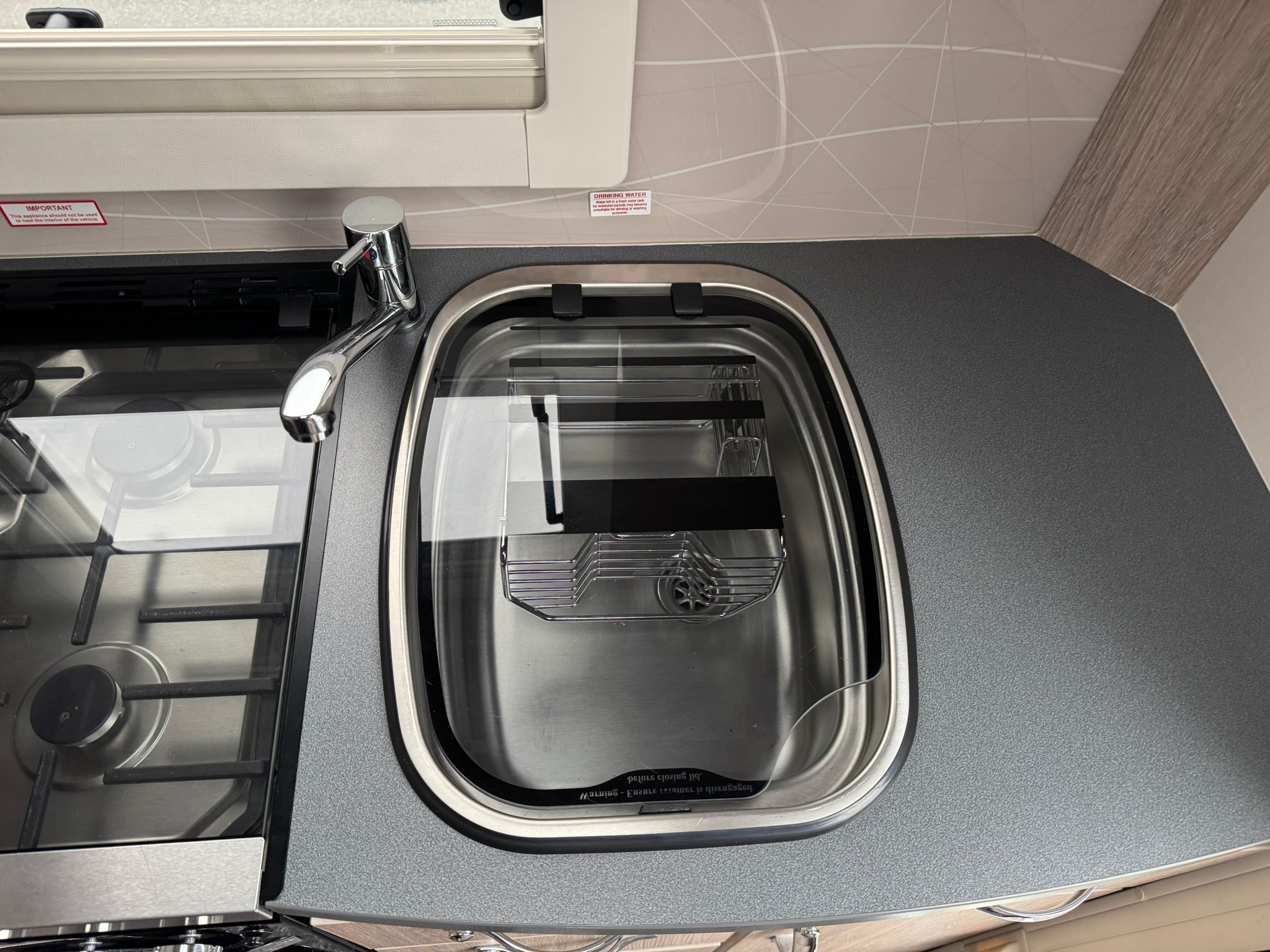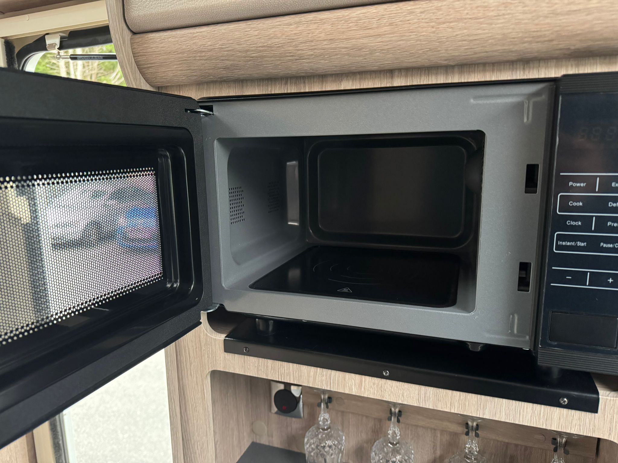 - Kitchen: You get a very well-equipped kitchen with everything you need for touring. It features a gas oven with a grill, a dual-fuel hob with three gas burners and an electric hotplate, a Dometic microwave, a Dometic fridge, and a sink with a glass cover.