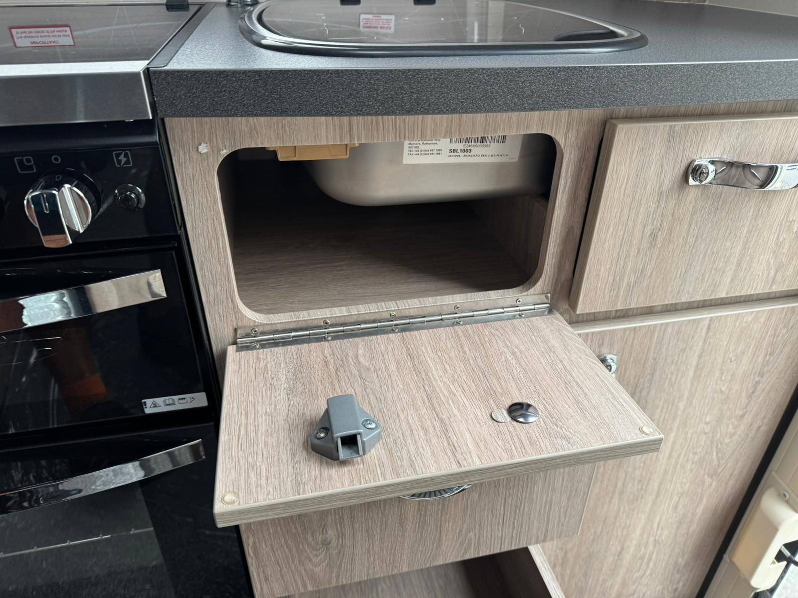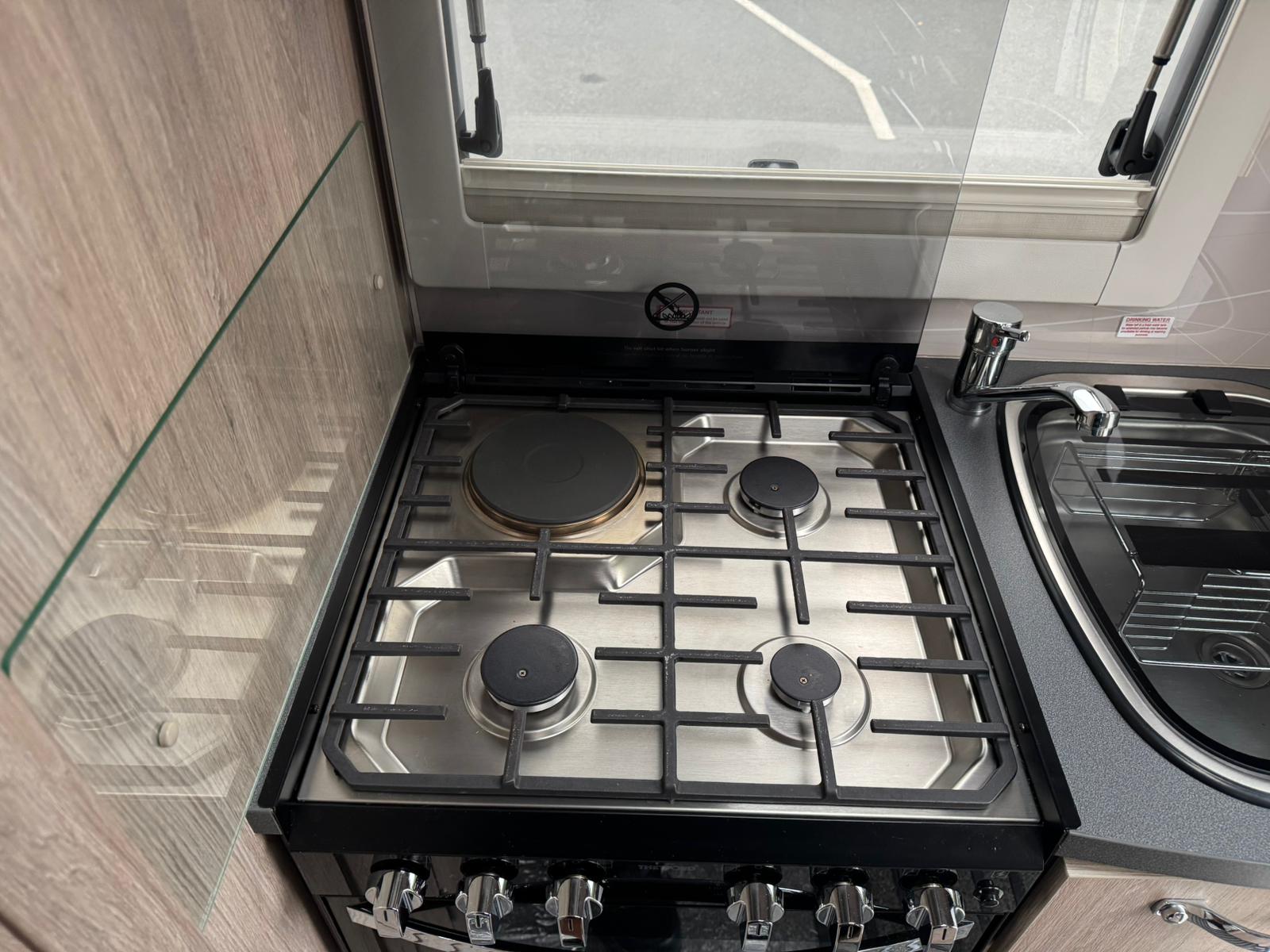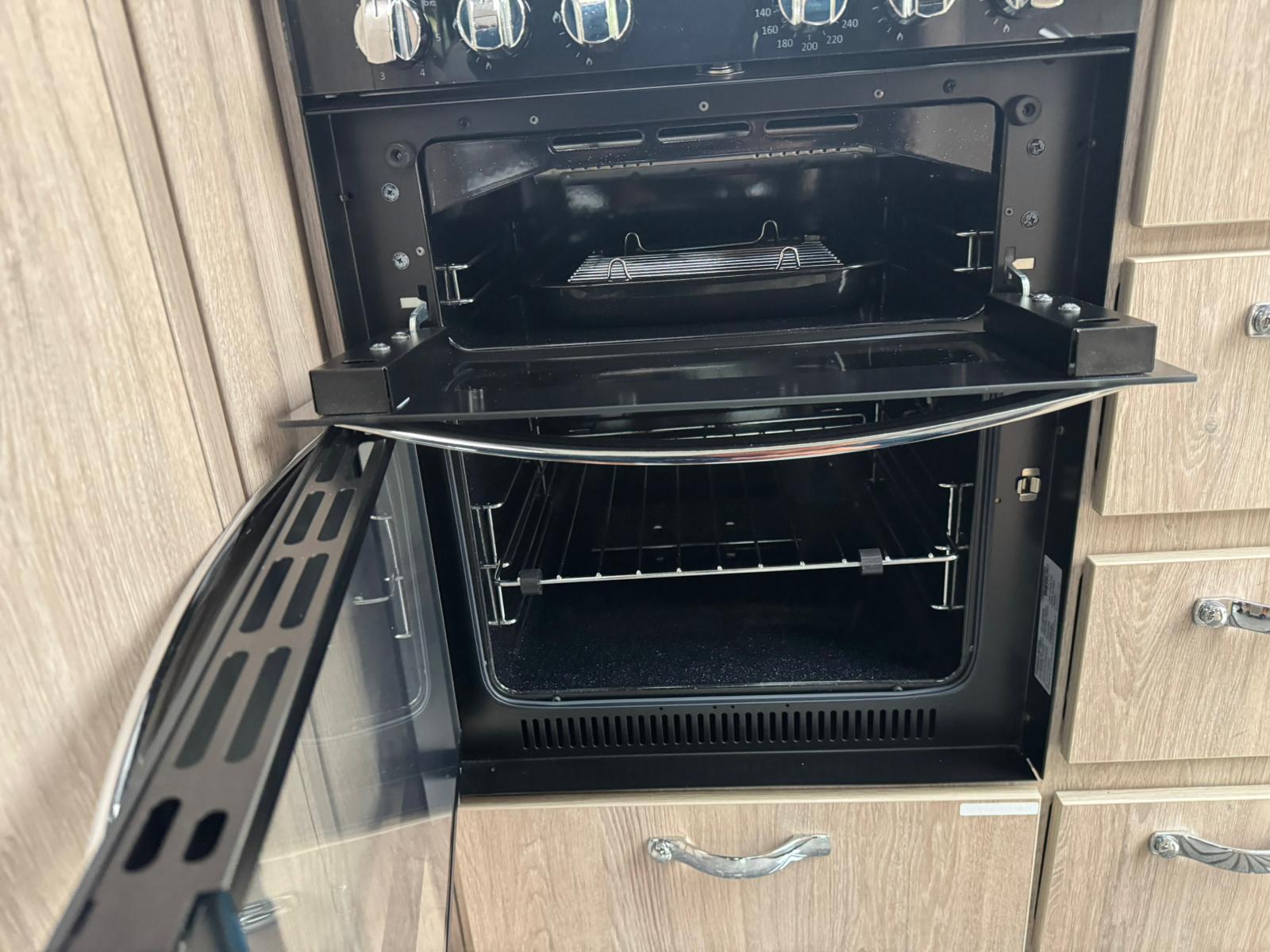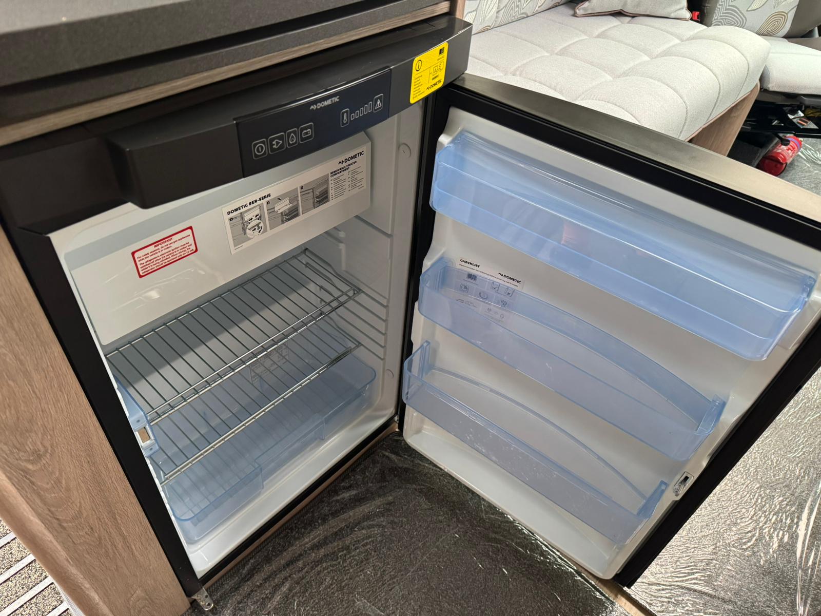 - Kitchen: You get a very well-equipped kitchen with everything you need for touring. It features a gas oven with a grill, a dual-fuel hob with three gas burners and an electric hotplate, a Dometic microwave, a Dometic fridge, and a sink with a glass cover.