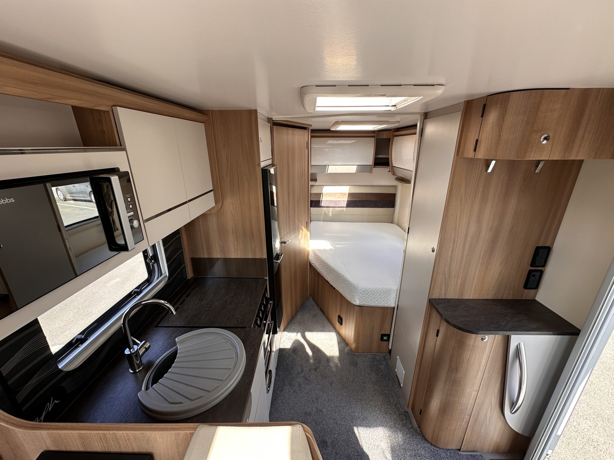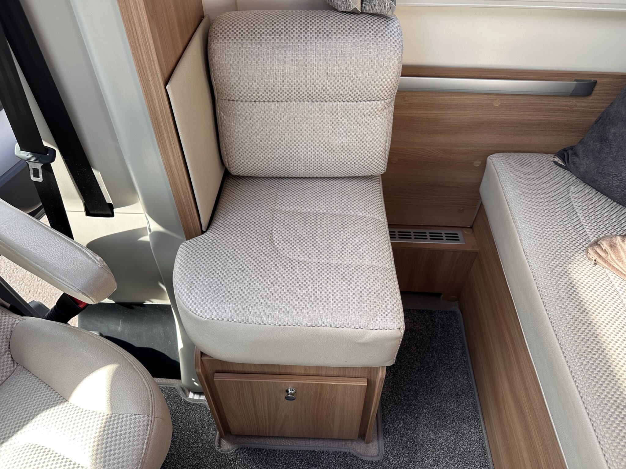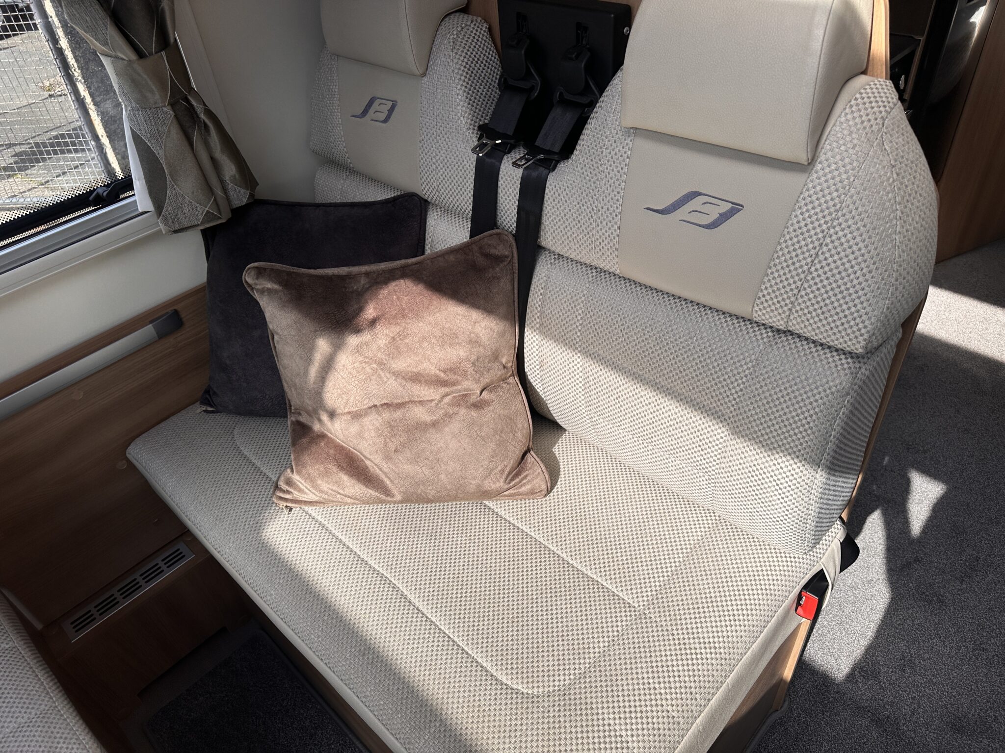 • Living Space & Travel: A bright, spacious front lounge that provides ample room for dining and relaxing. This area easily converts to provide a second large double bed. It also features 4 belted travel seats, making it highly practical for families or couples travelling with guests.