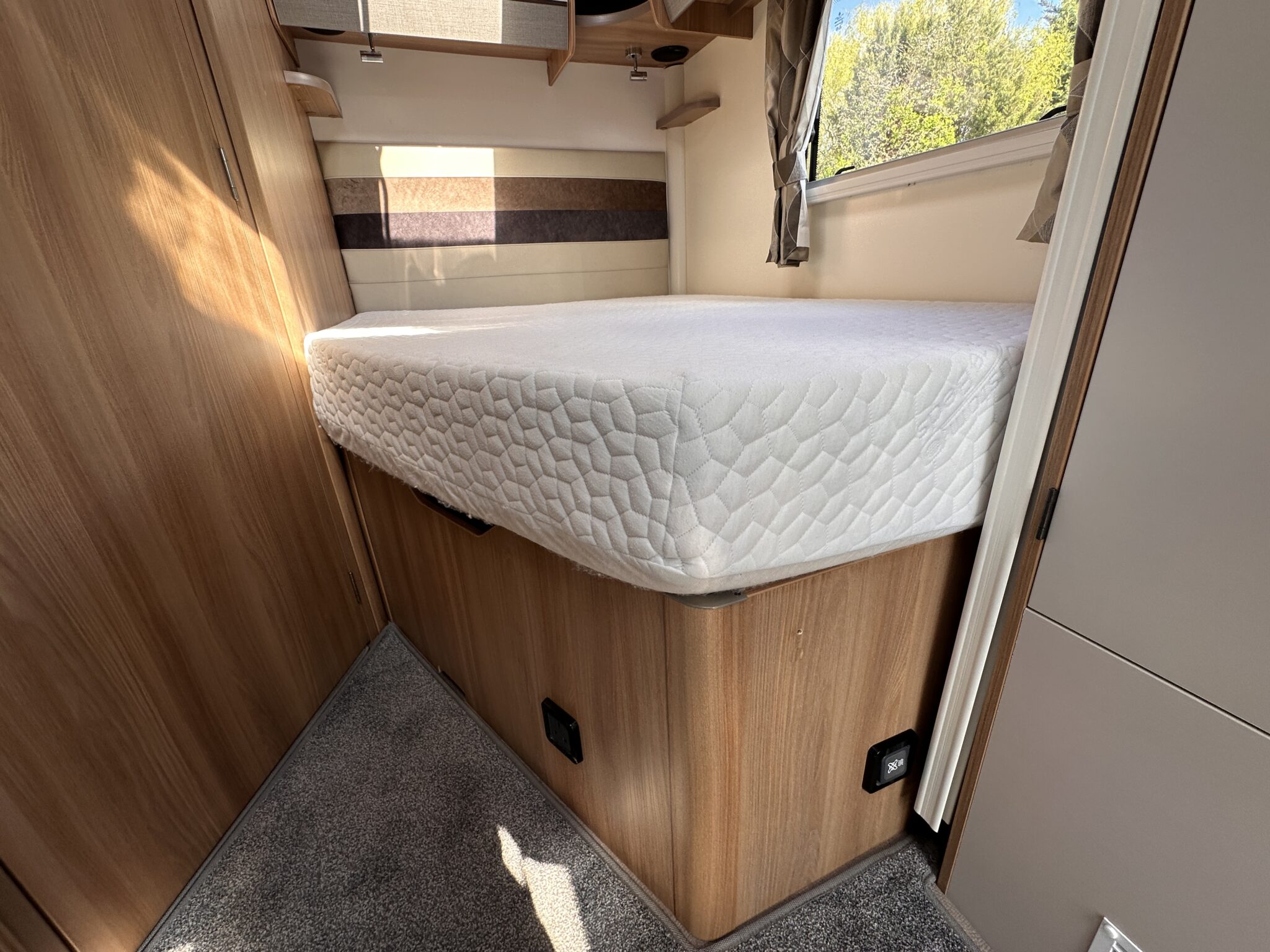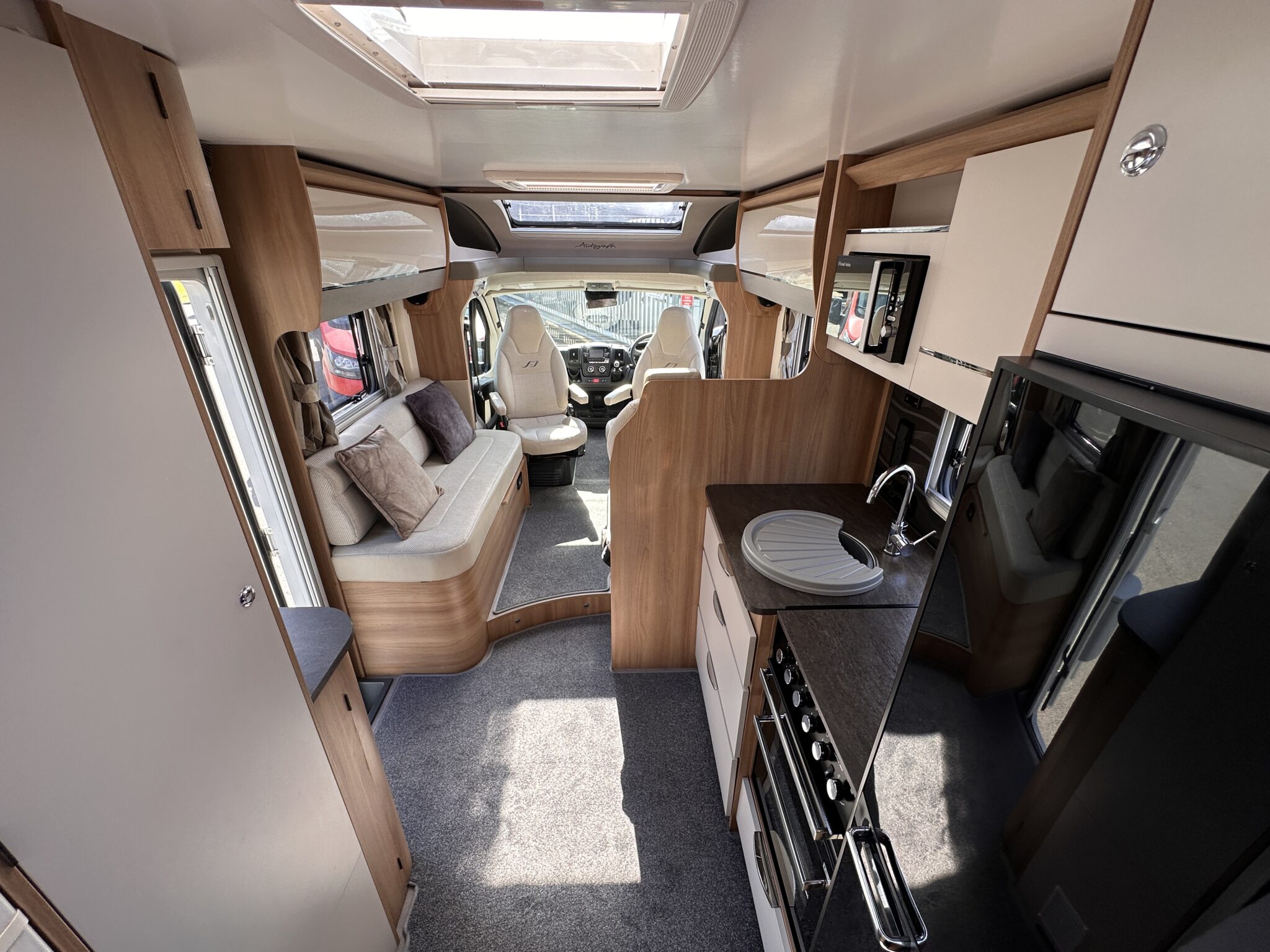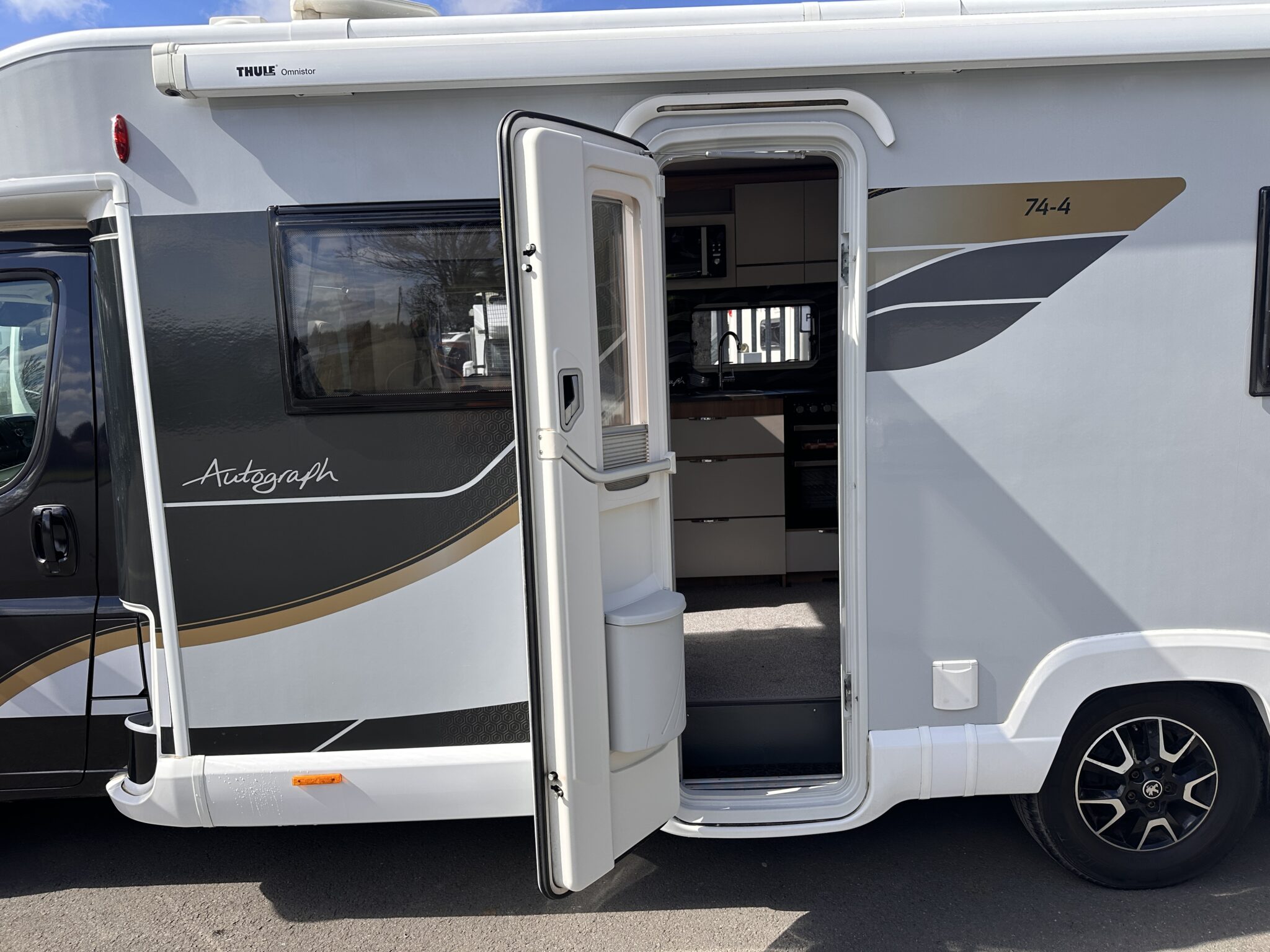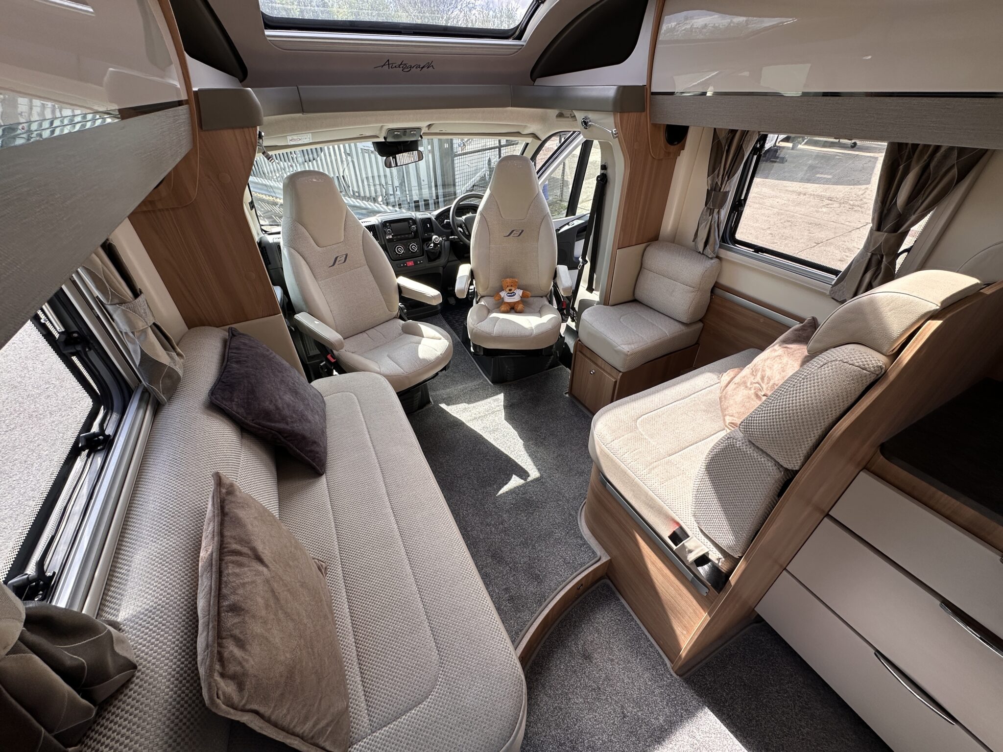 1. What is the bed layout? The Autograph 74-4 features a permanent, fixed French double bed at the rear nearside, meaning you don’t have to assemble your main bed from scratch every night. The front lounge seating also converts into a second large double bed.