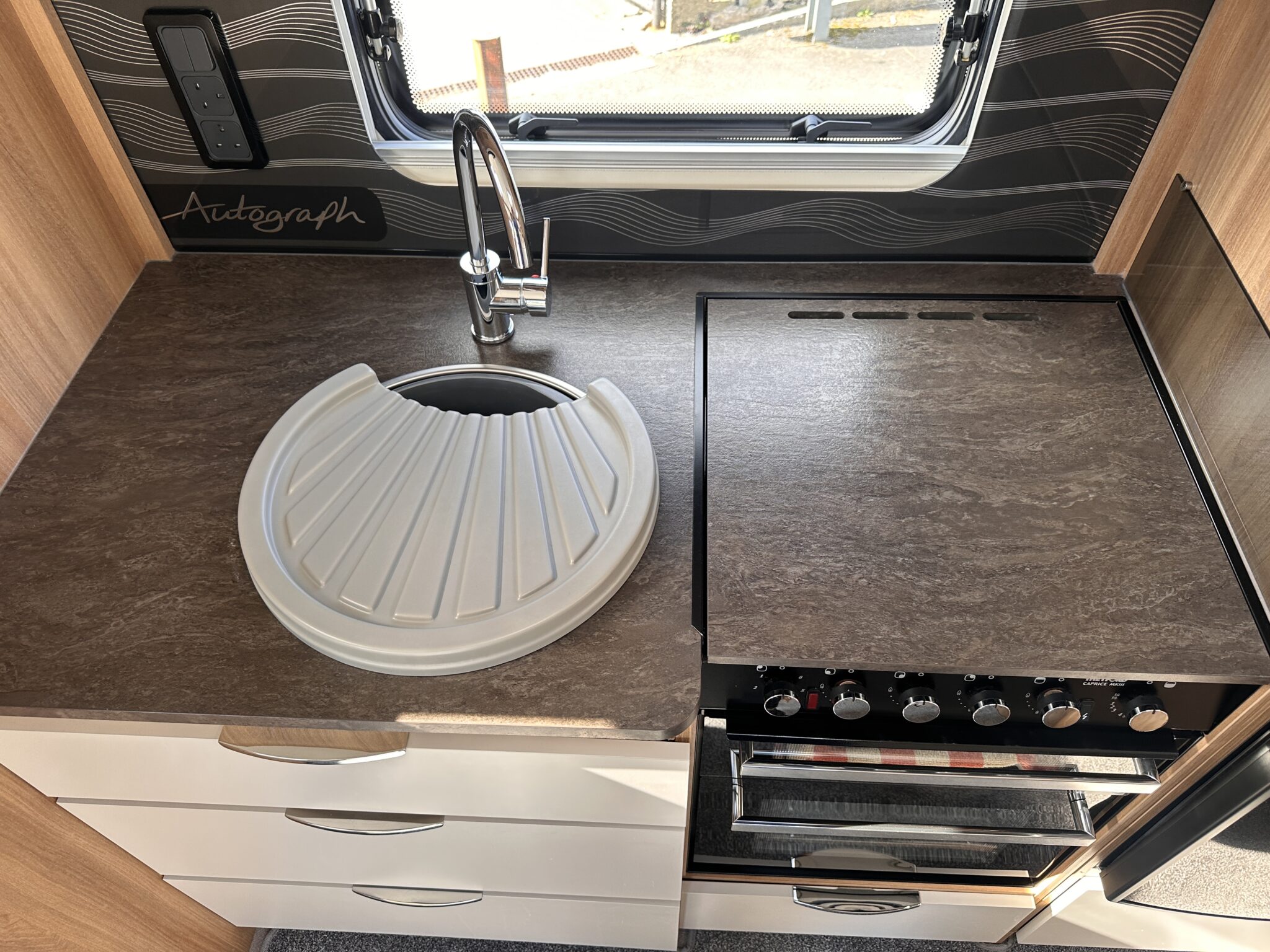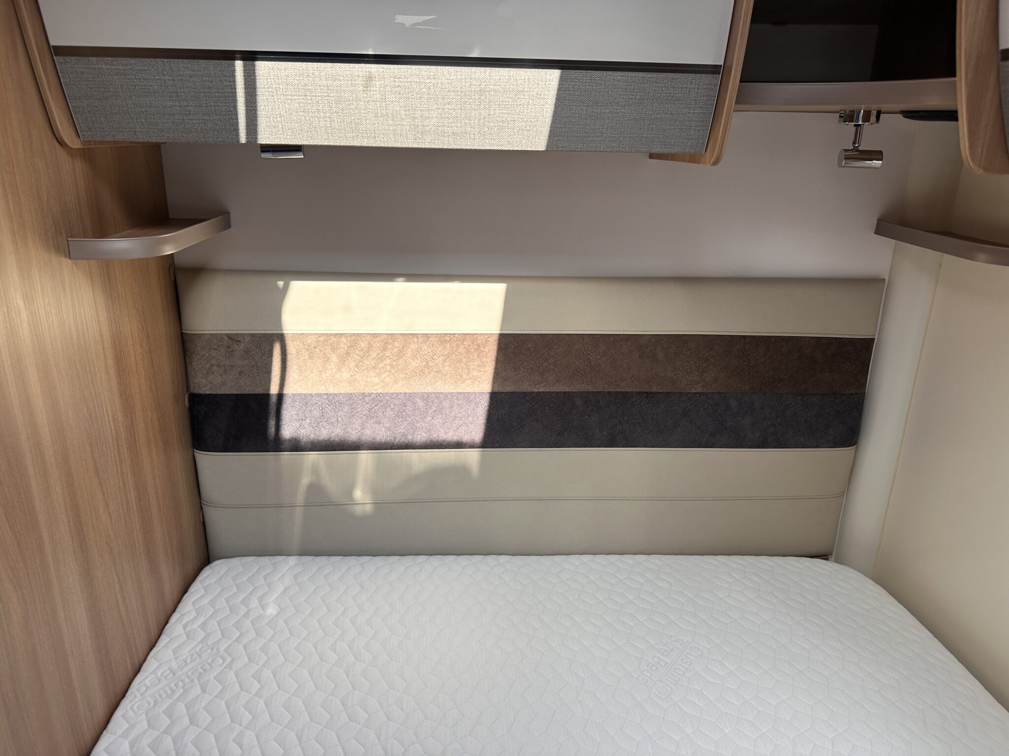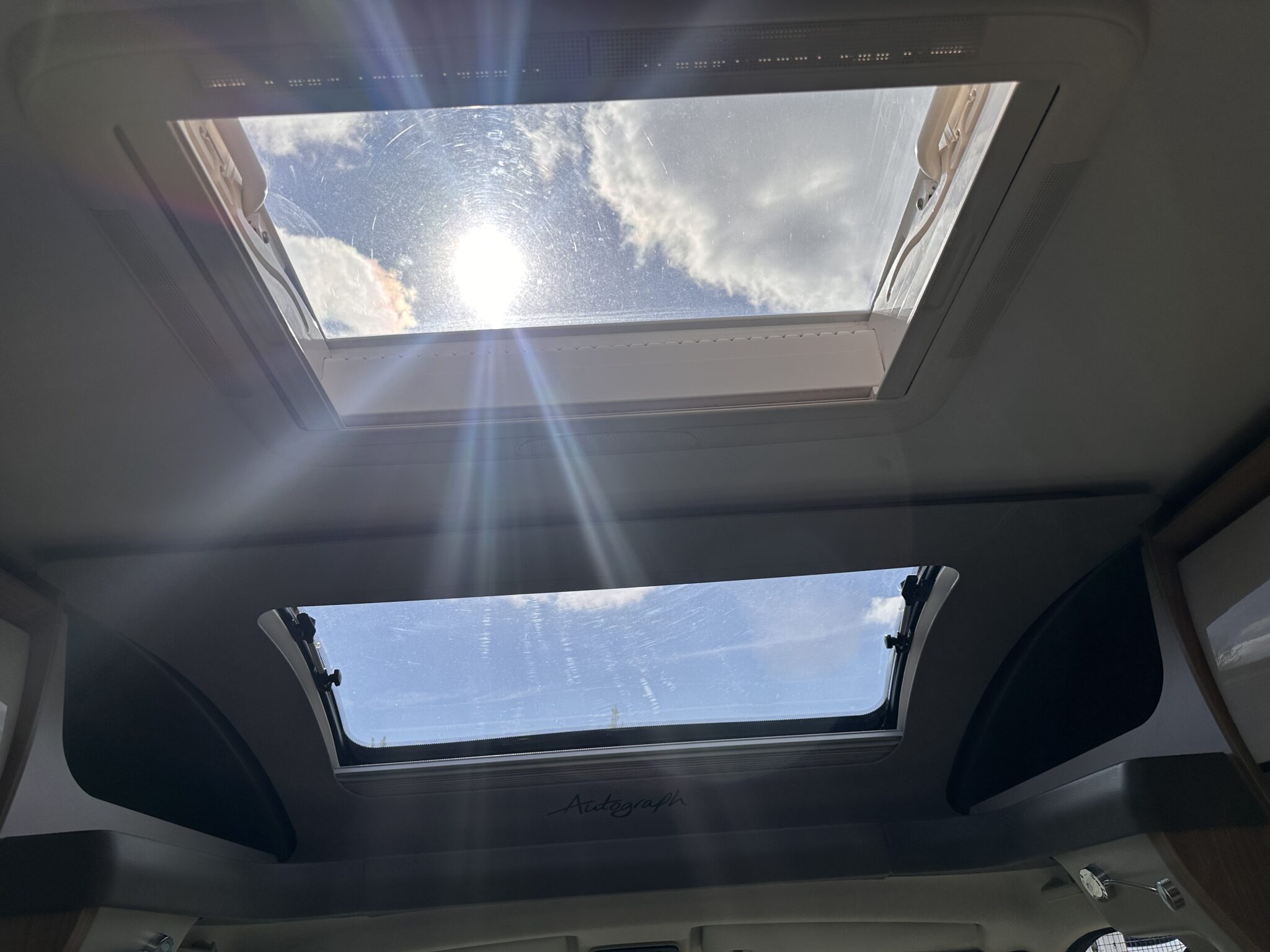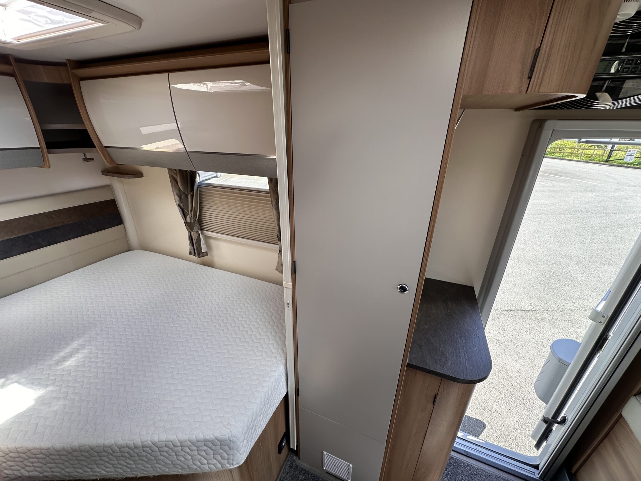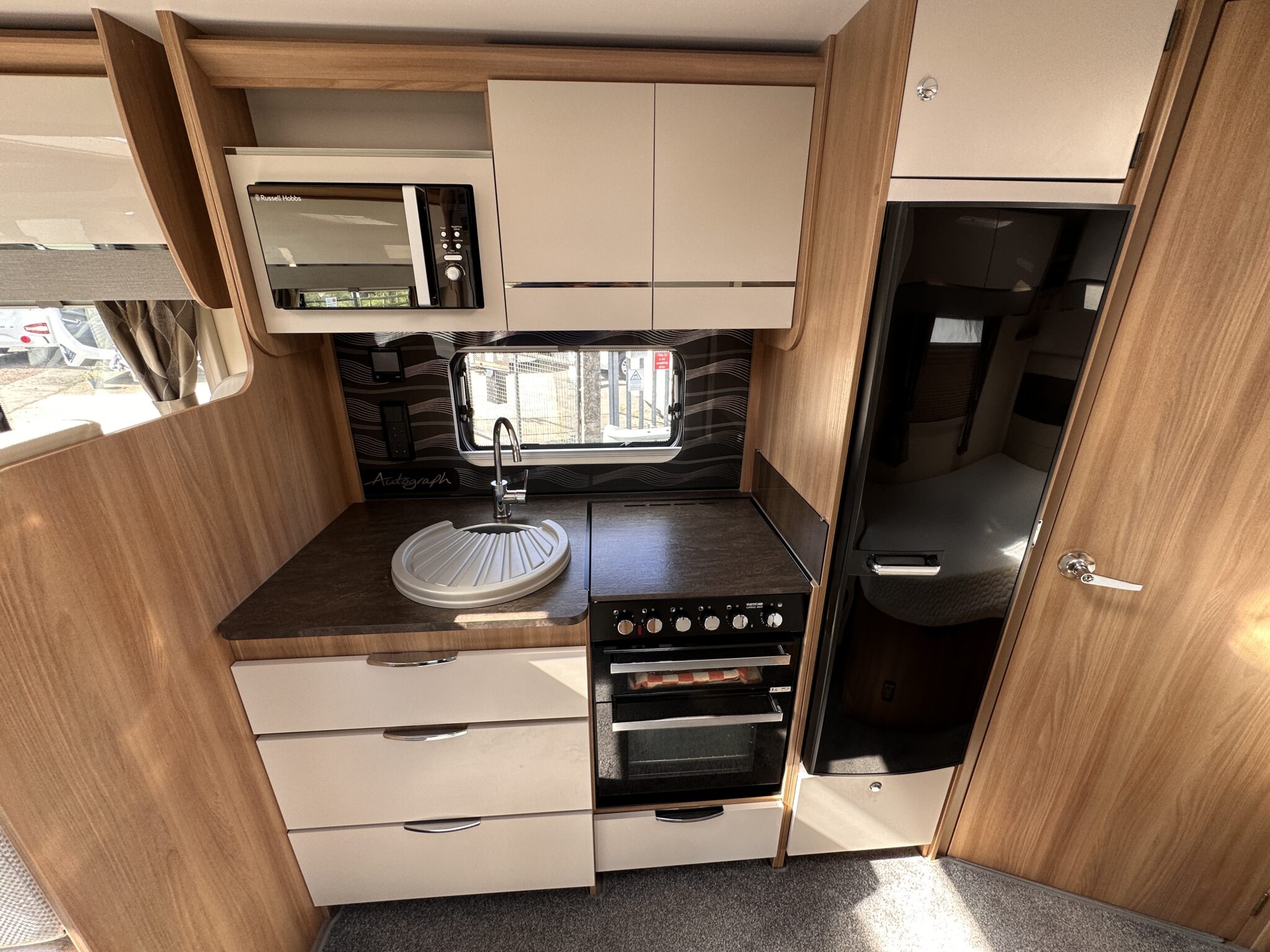 1. What is the bed layout? The Autograph 74-4 features a permanent, fixed French double bed at the rear nearside, meaning you don’t have to assemble your main bed from scratch every night. The front lounge seating also converts into a second large double bed.