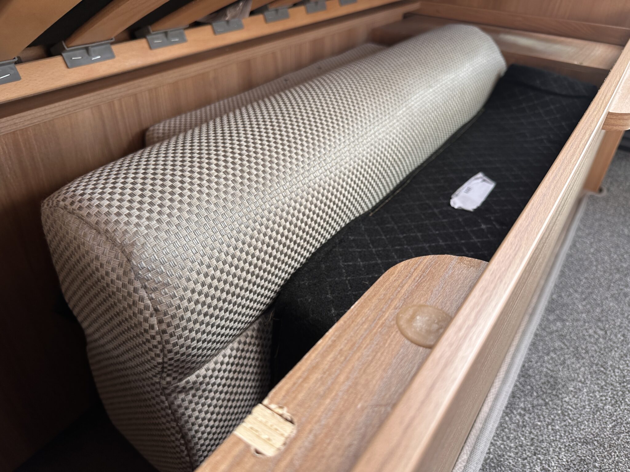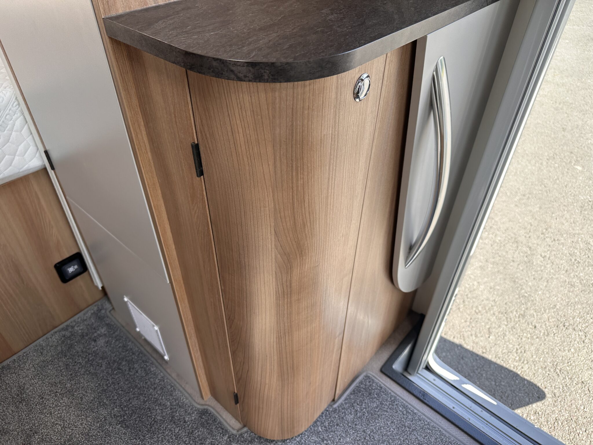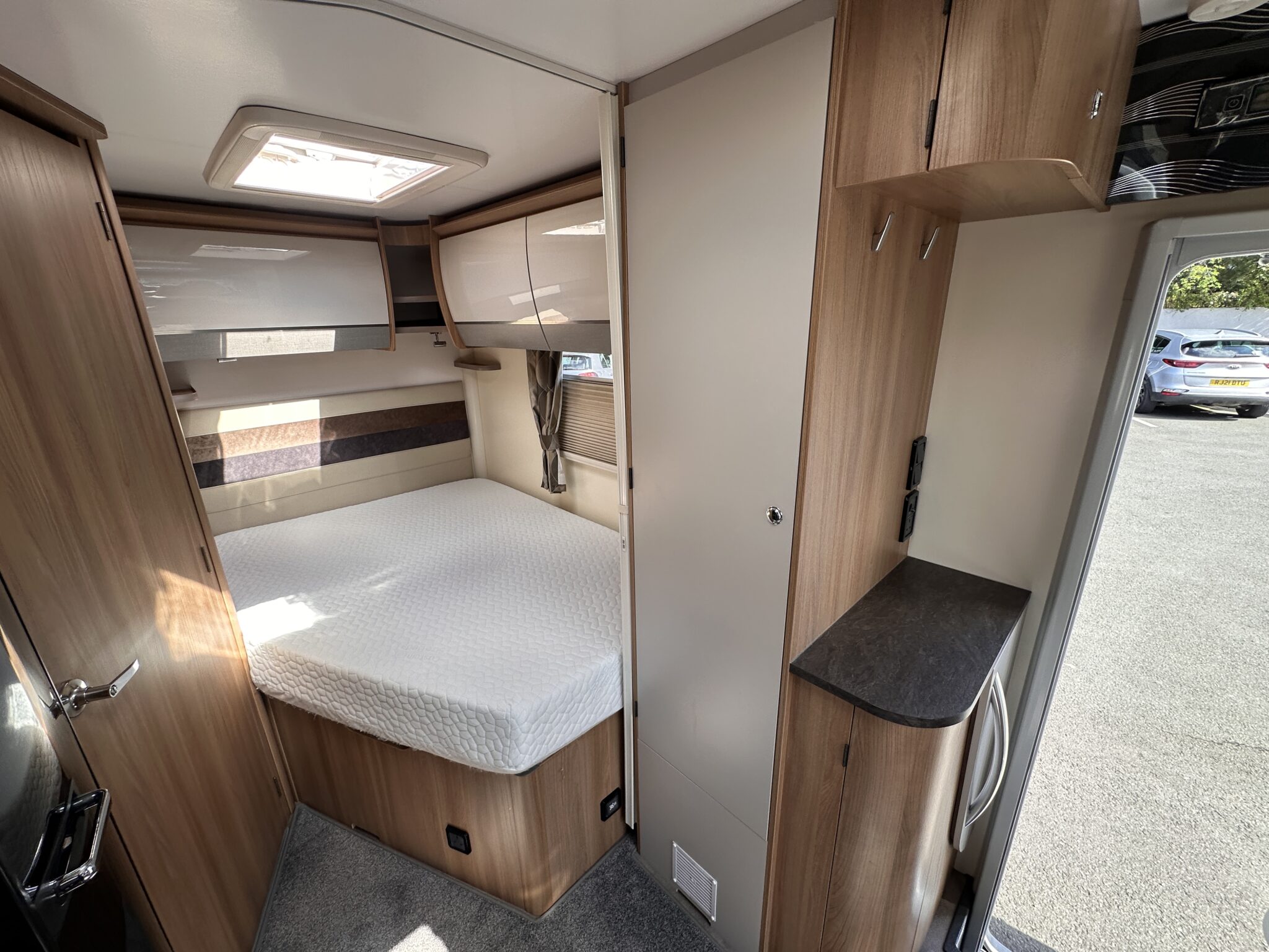 • Bedroom: Showcases a fantastic fixed French double bed positioned at the rear nearside. This provides a supremely comfortable, permanent sleeping area without the hassle of making up a bed every night, plus it lifts to reveal massive under-bed storage.