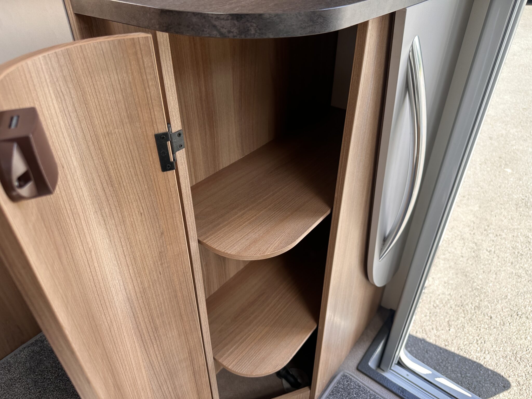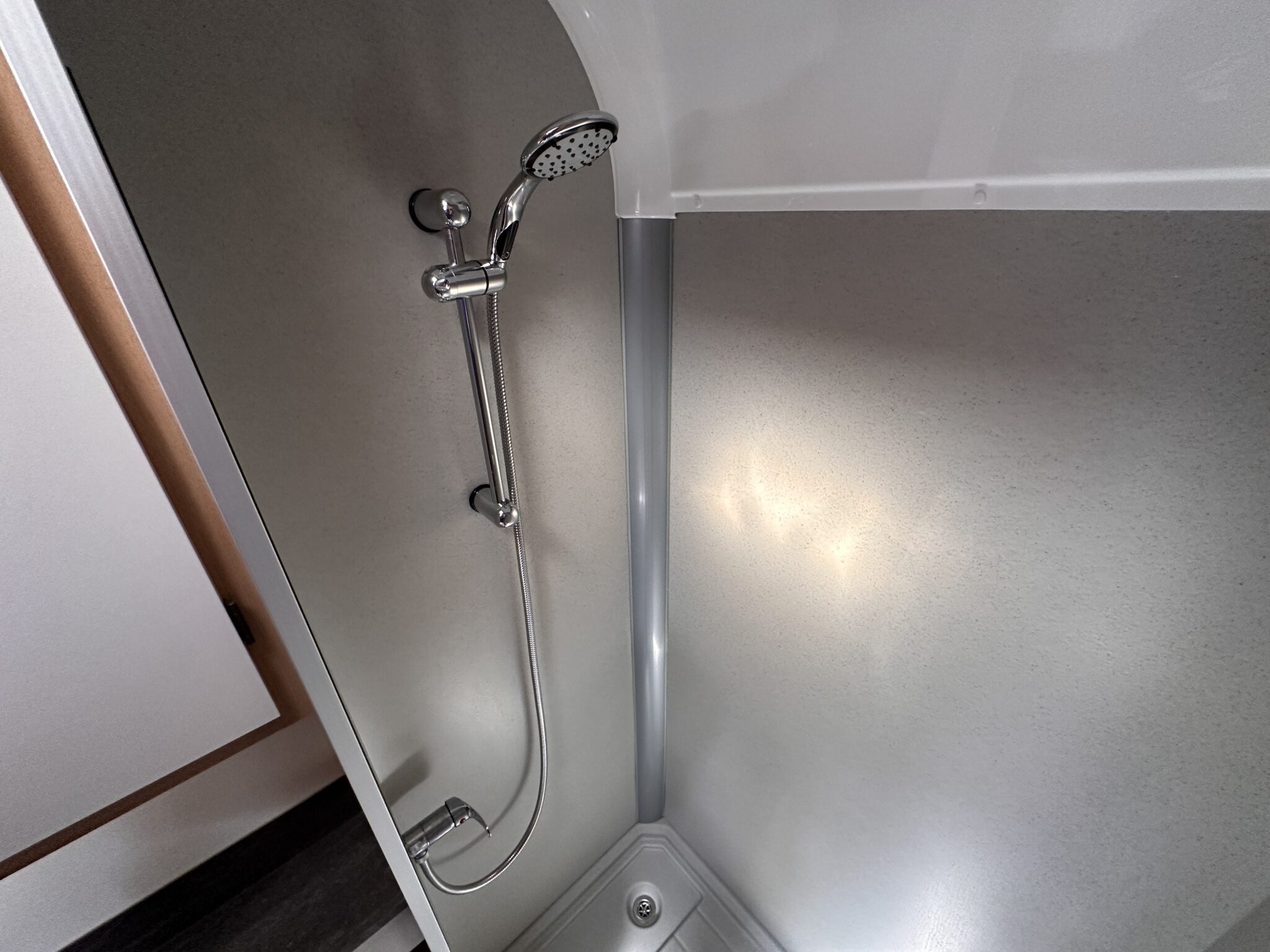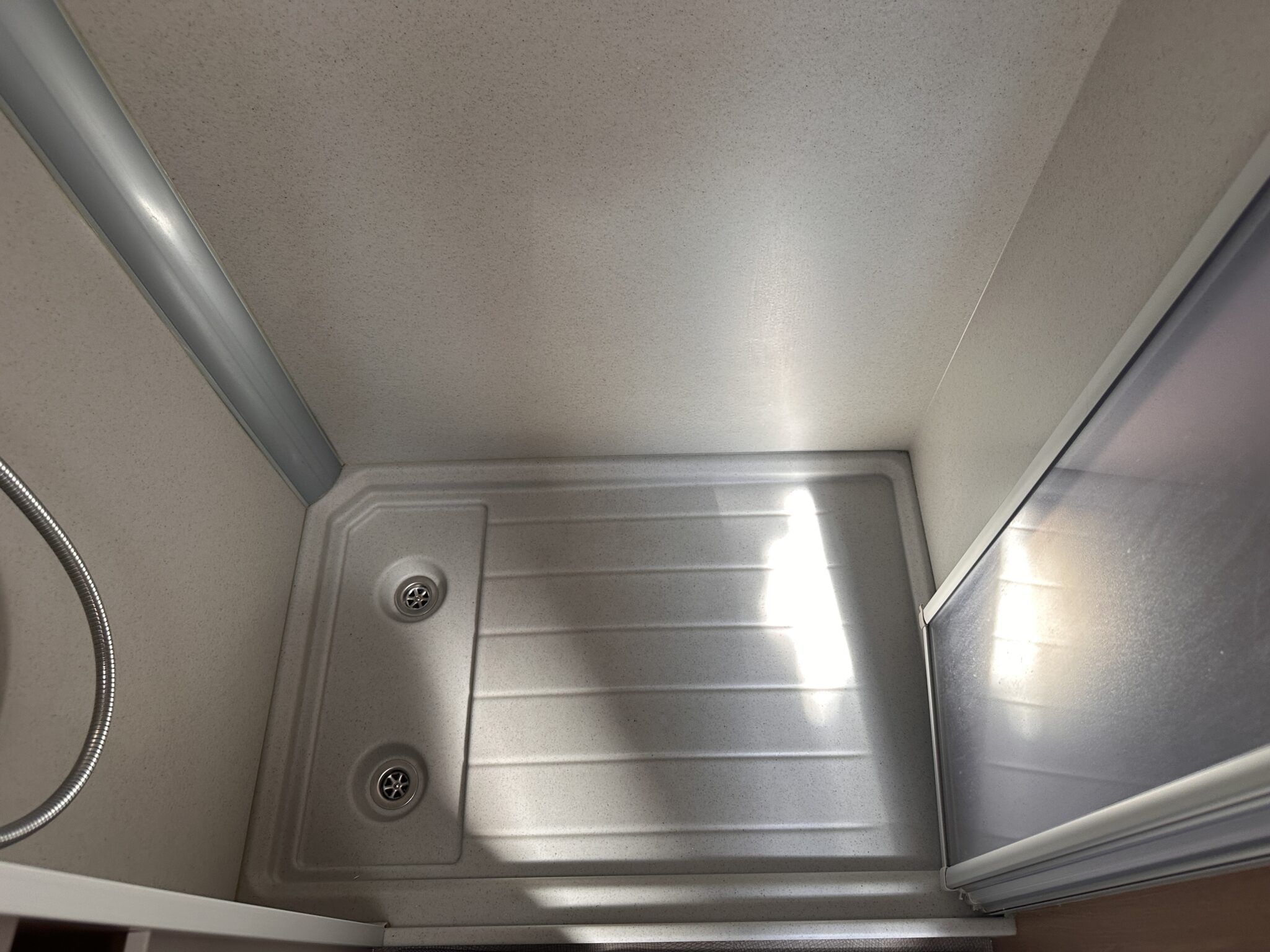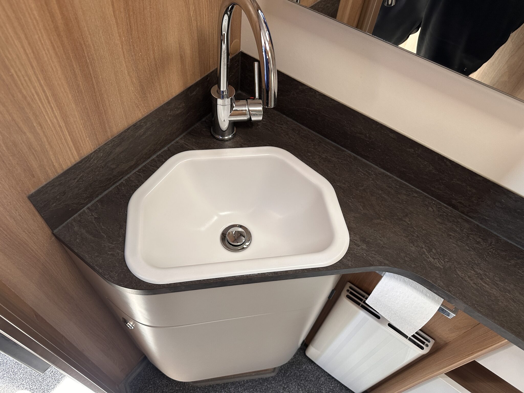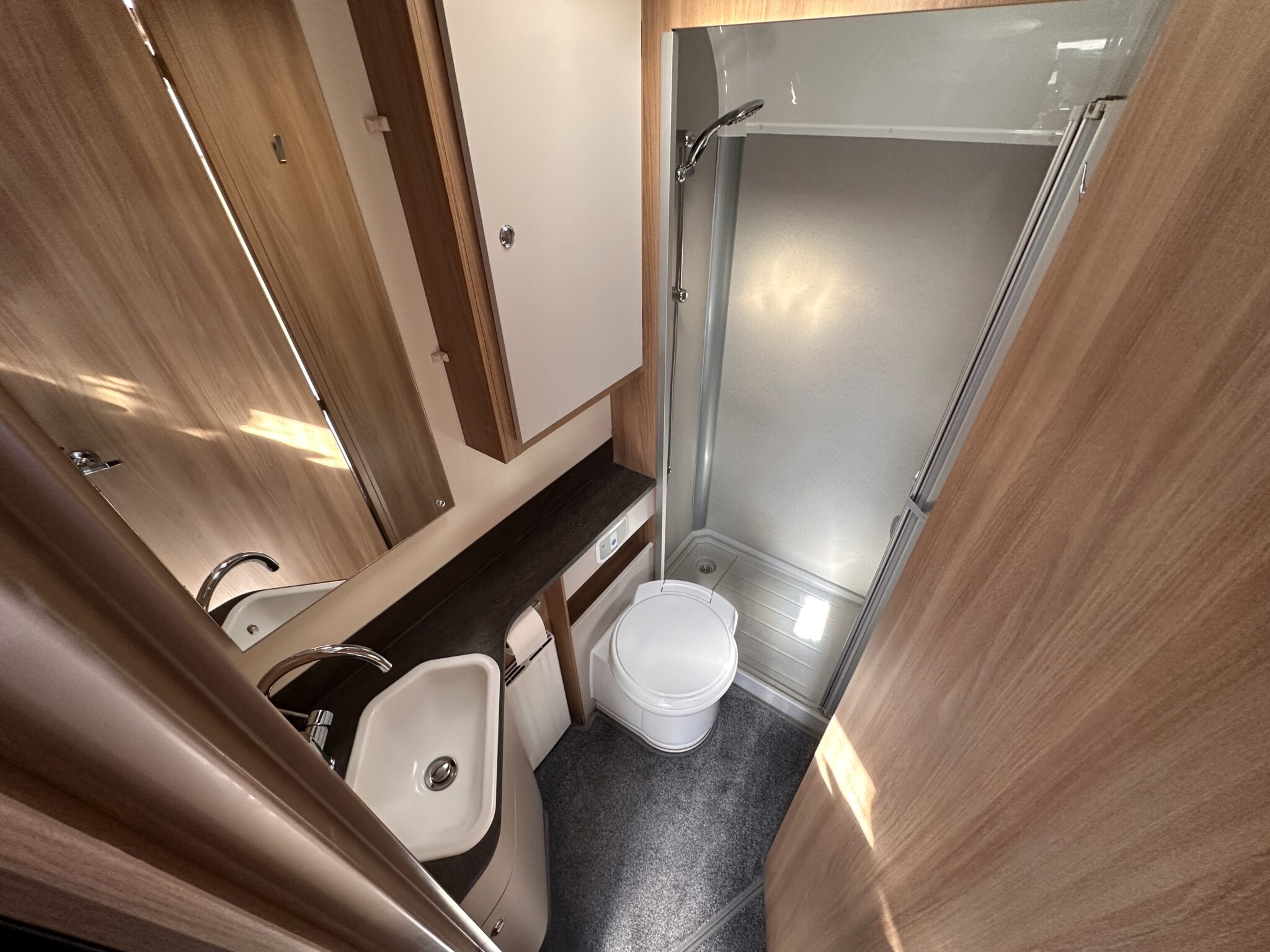 • Washroom: A highly practical rear corner washroom situated seamlessly alongside the French bed, featuring a shower, cassette toilet, and washbasin.