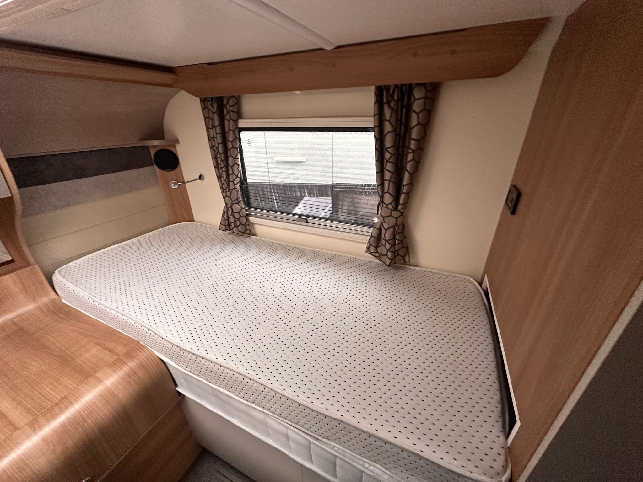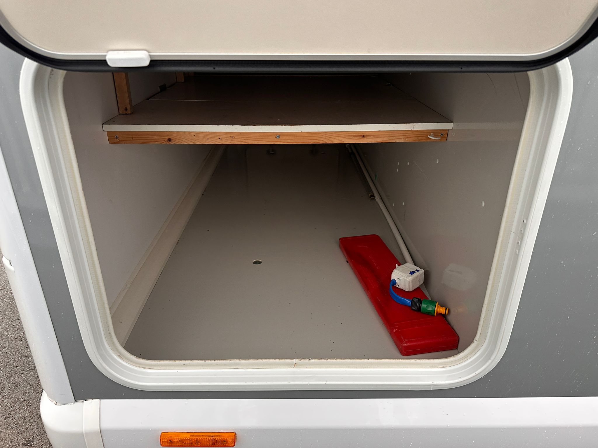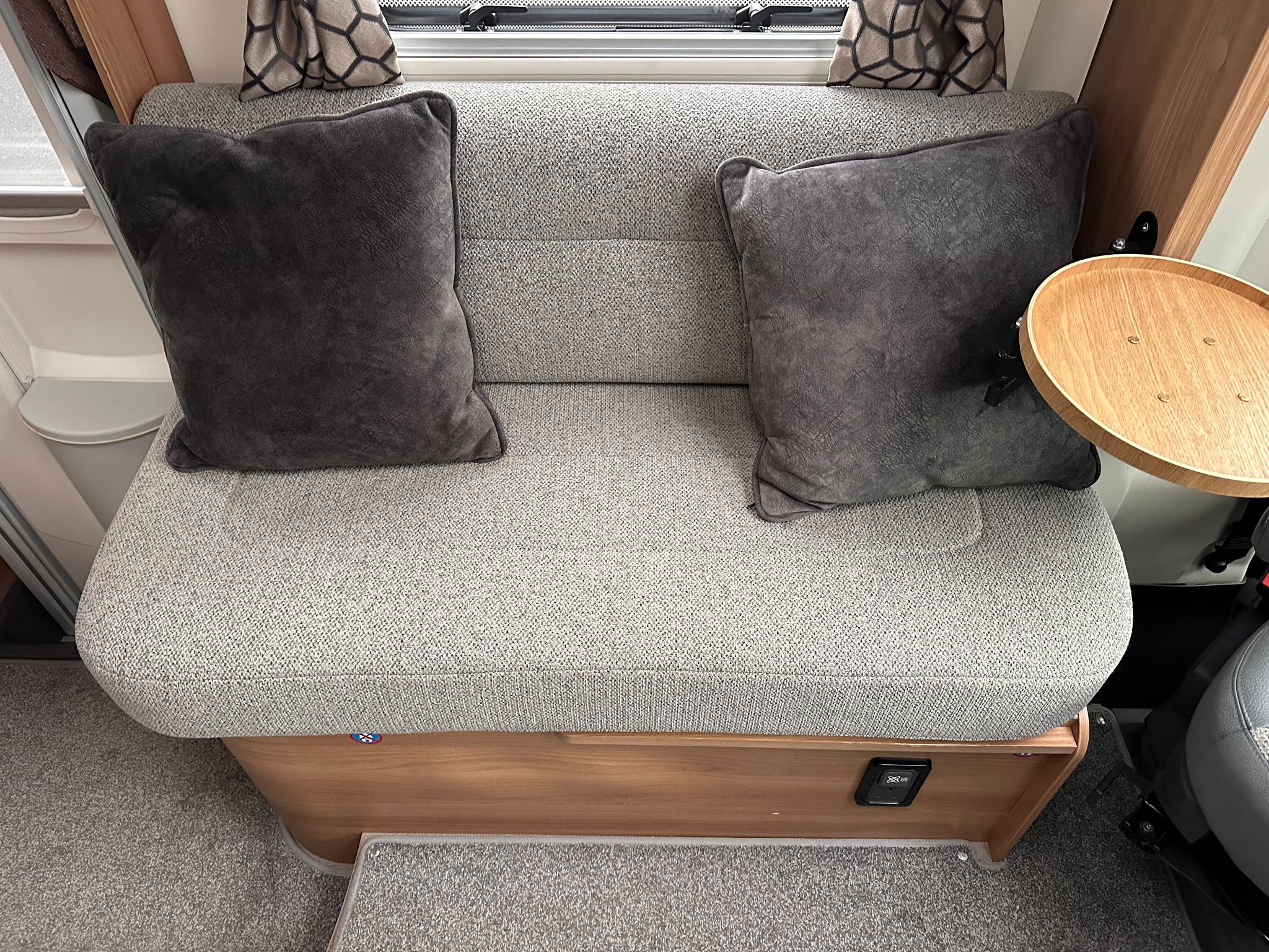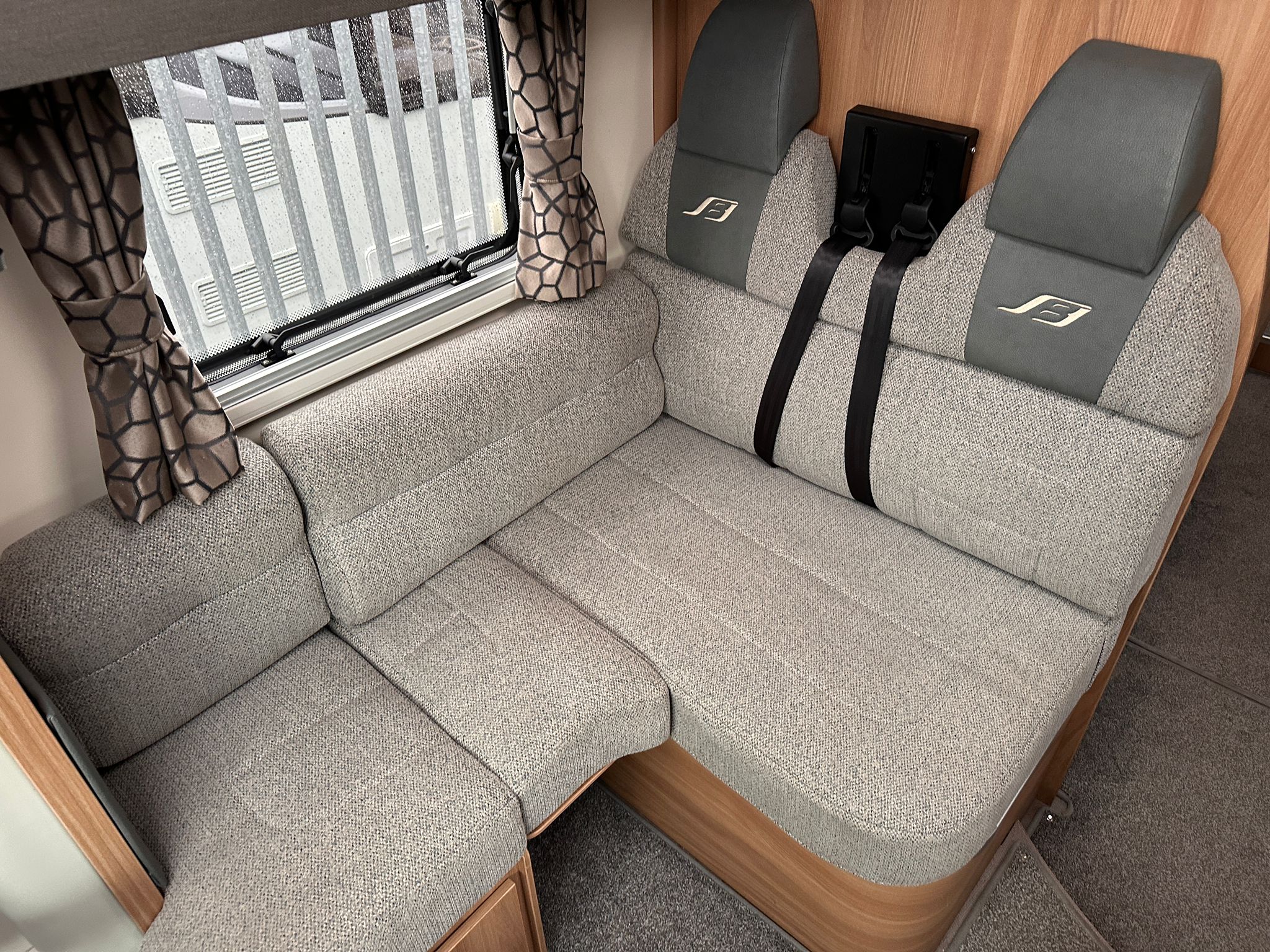 2. What is the bed layout? This model features two fixed single beds at the rear, which sit above the large garage space. The front lounge seating also converts into a comfortable double bed.