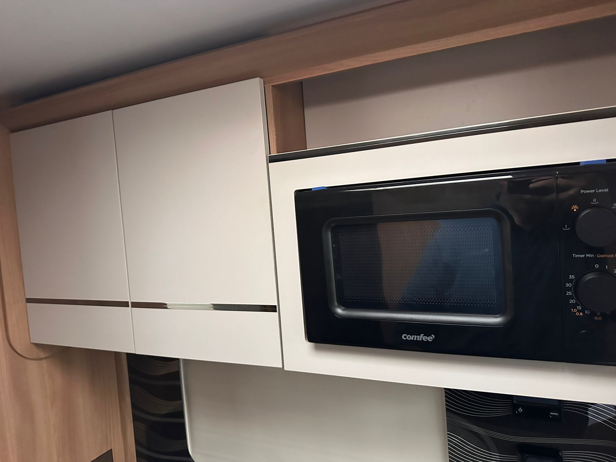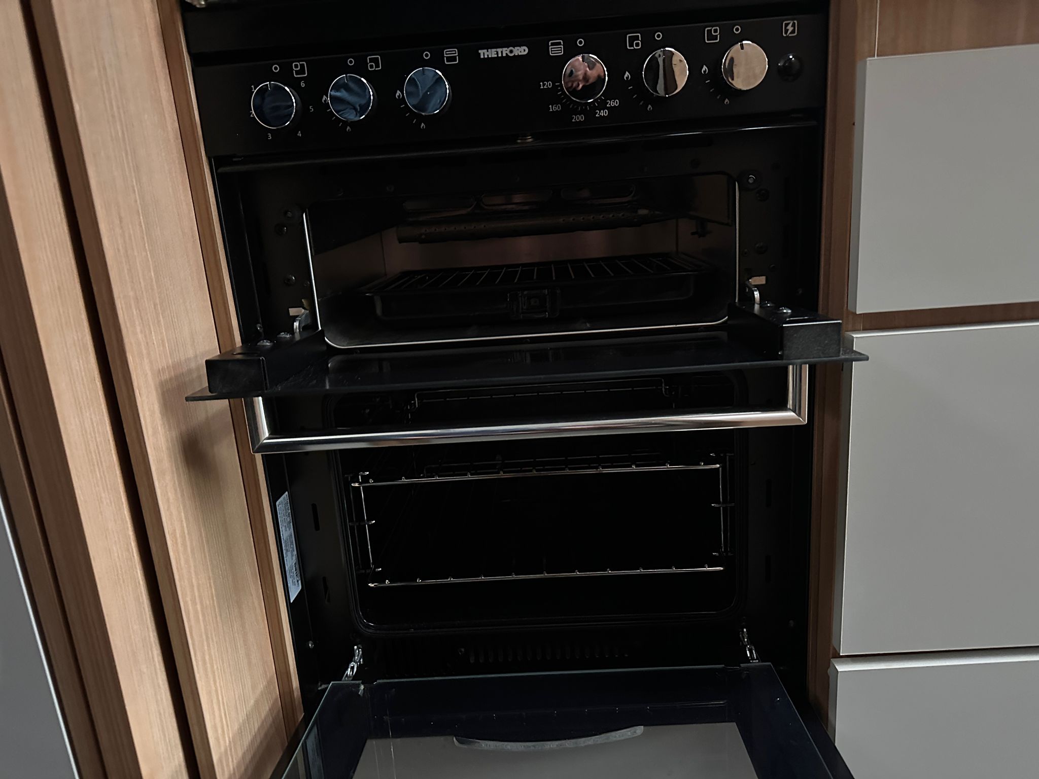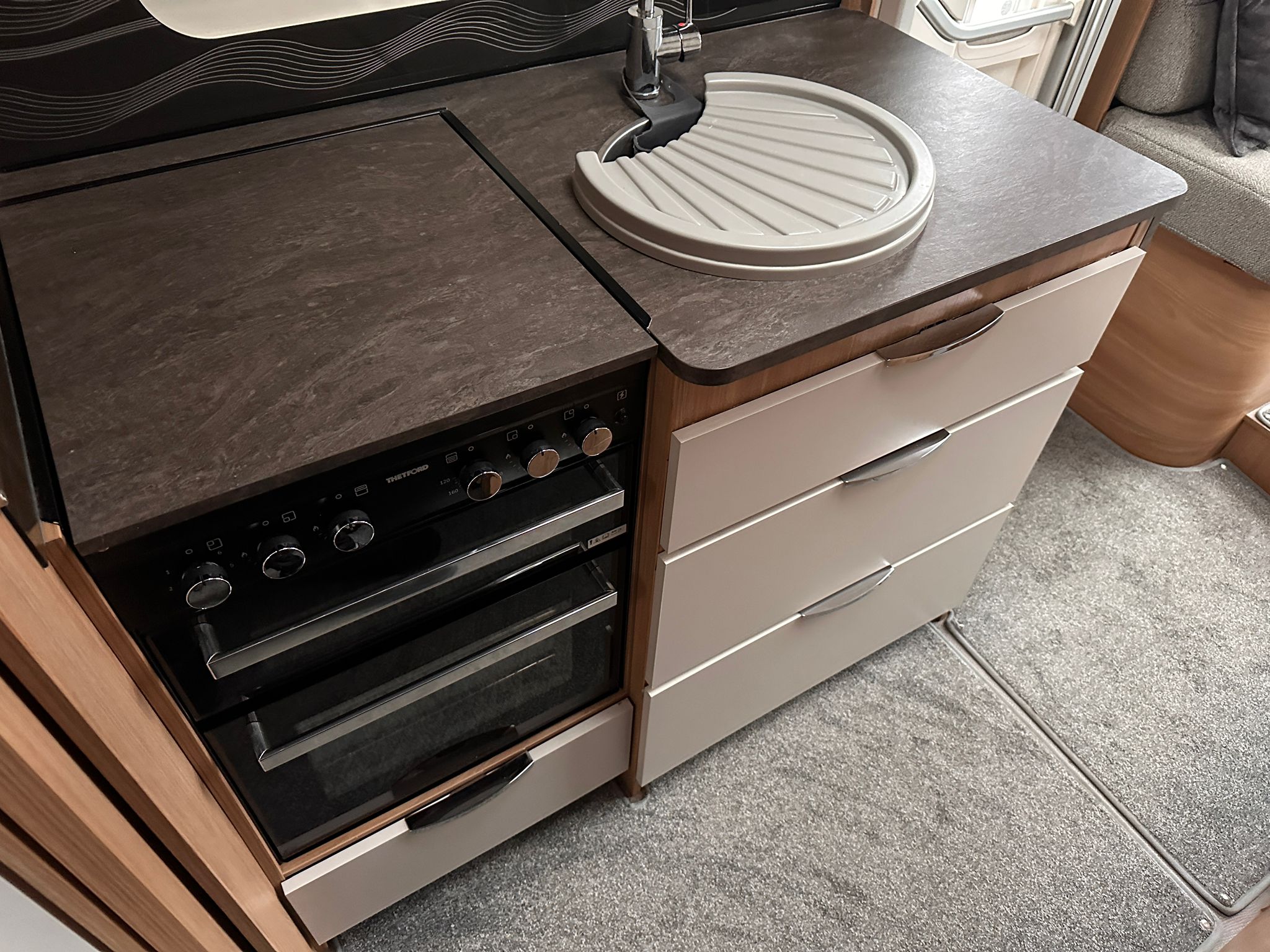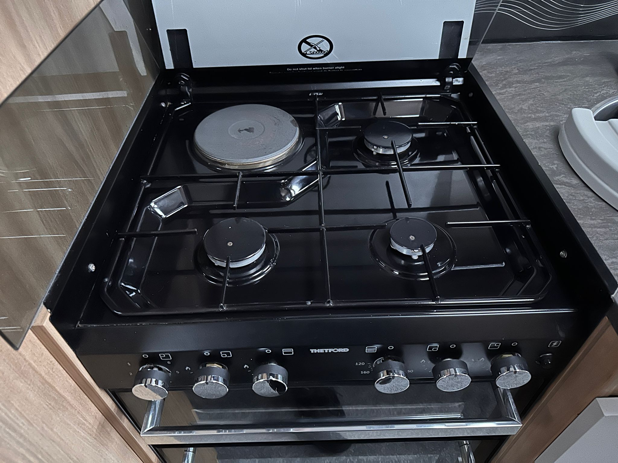 • Kitchen: A brilliantly equipped central kitchen featuring a Thetford K-Series oven, grill, and a 3-burner gas hob with one electric hotplate. It also includes a microwave and a massive 153-litre Dometic dual-opening fridge freezer.