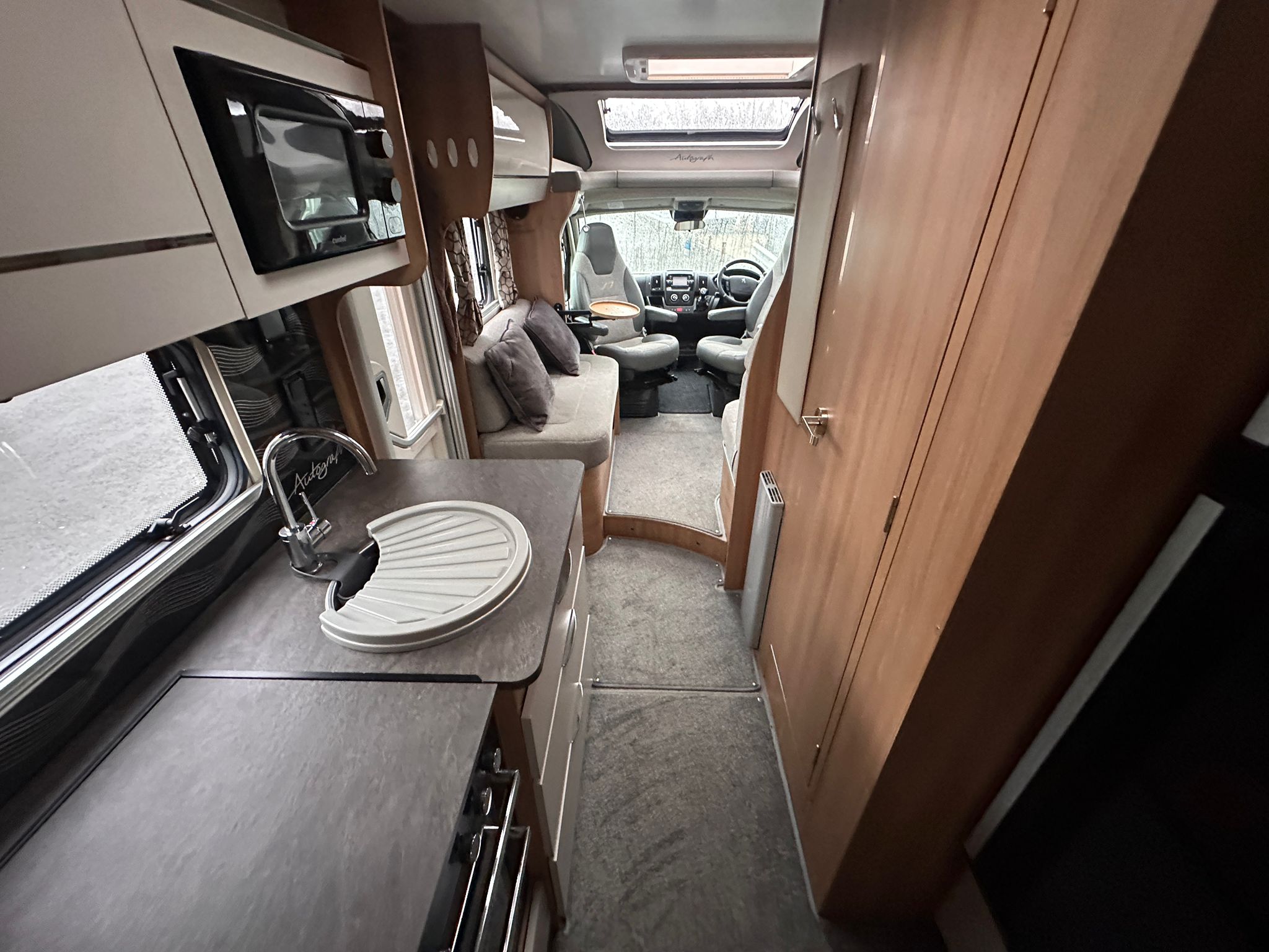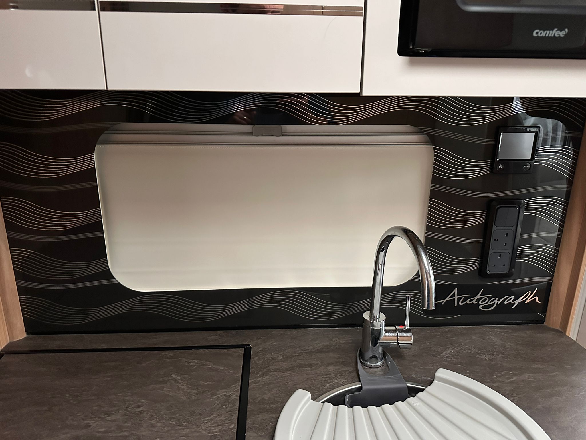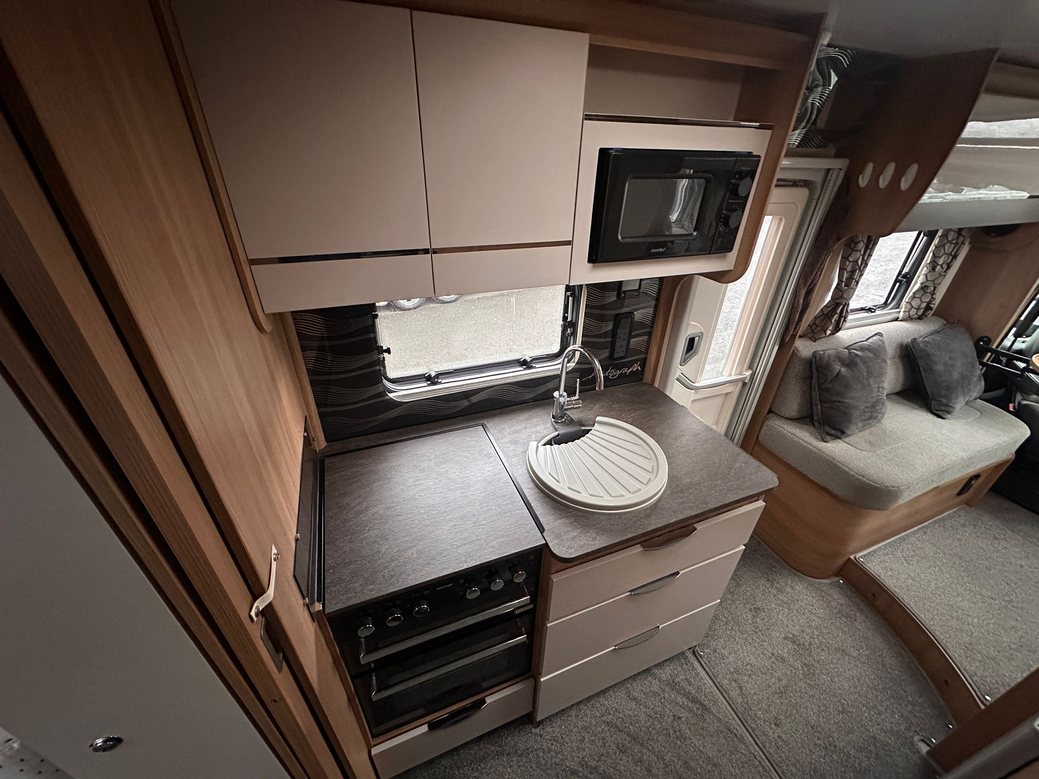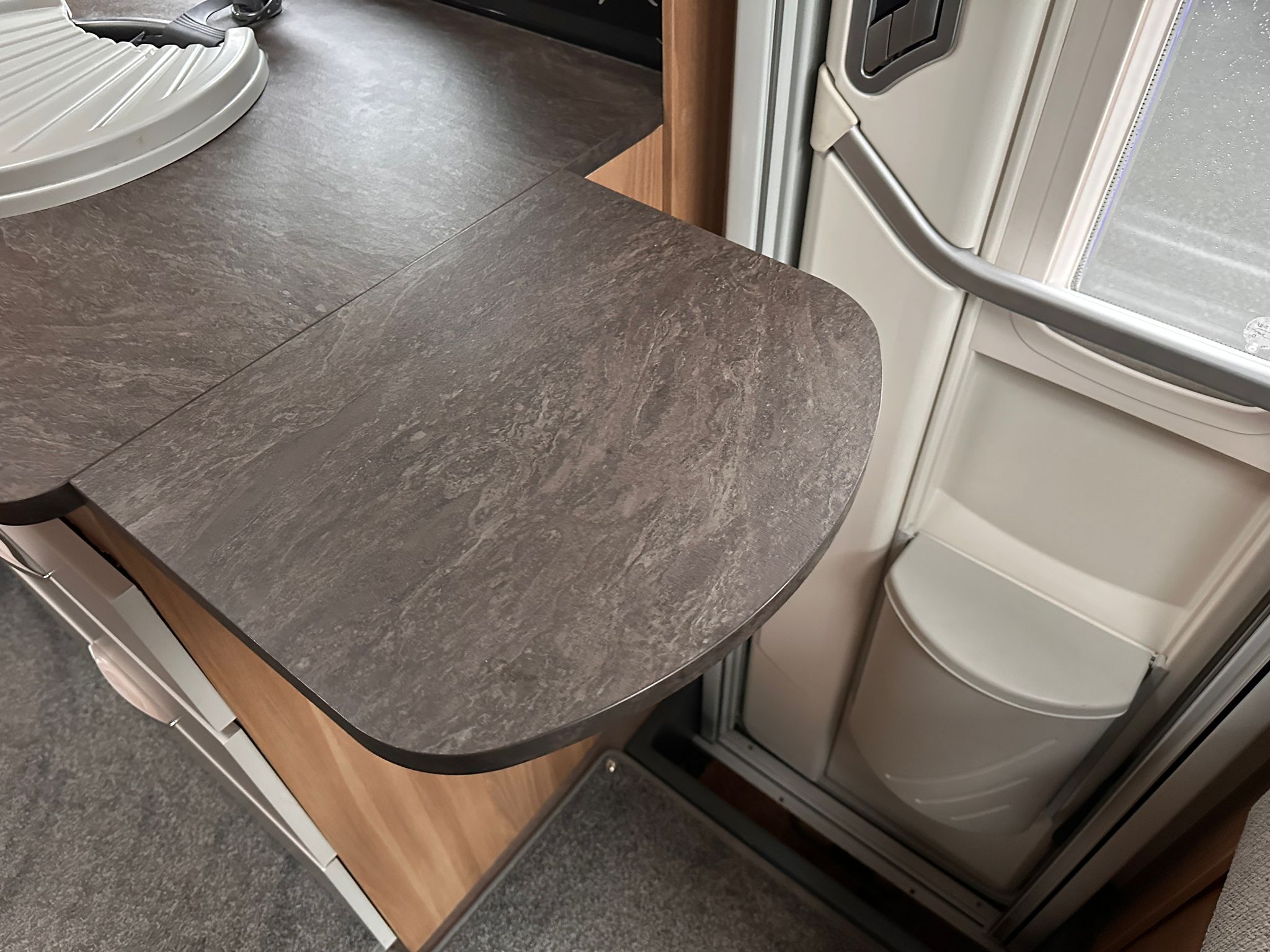 • Kitchen: A brilliantly equipped central kitchen featuring a Thetford K-Series oven, grill, and a 3-burner gas hob with one electric hotplate. It also includes a microwave and a massive 153-litre Dometic dual-opening fridge freezer.