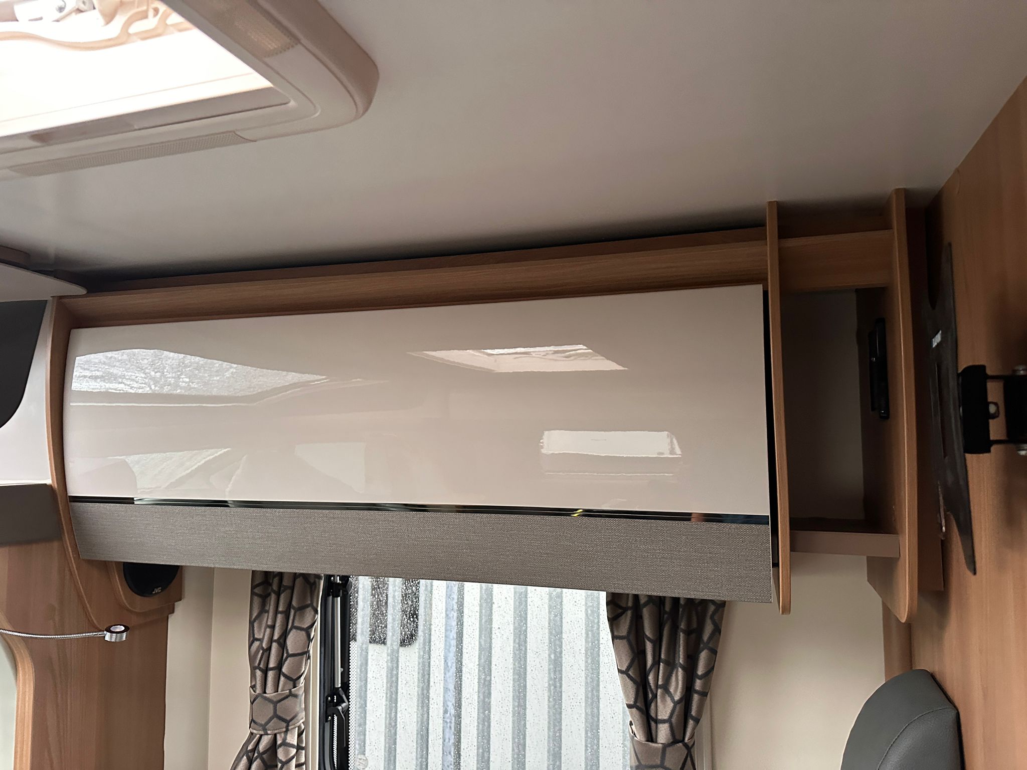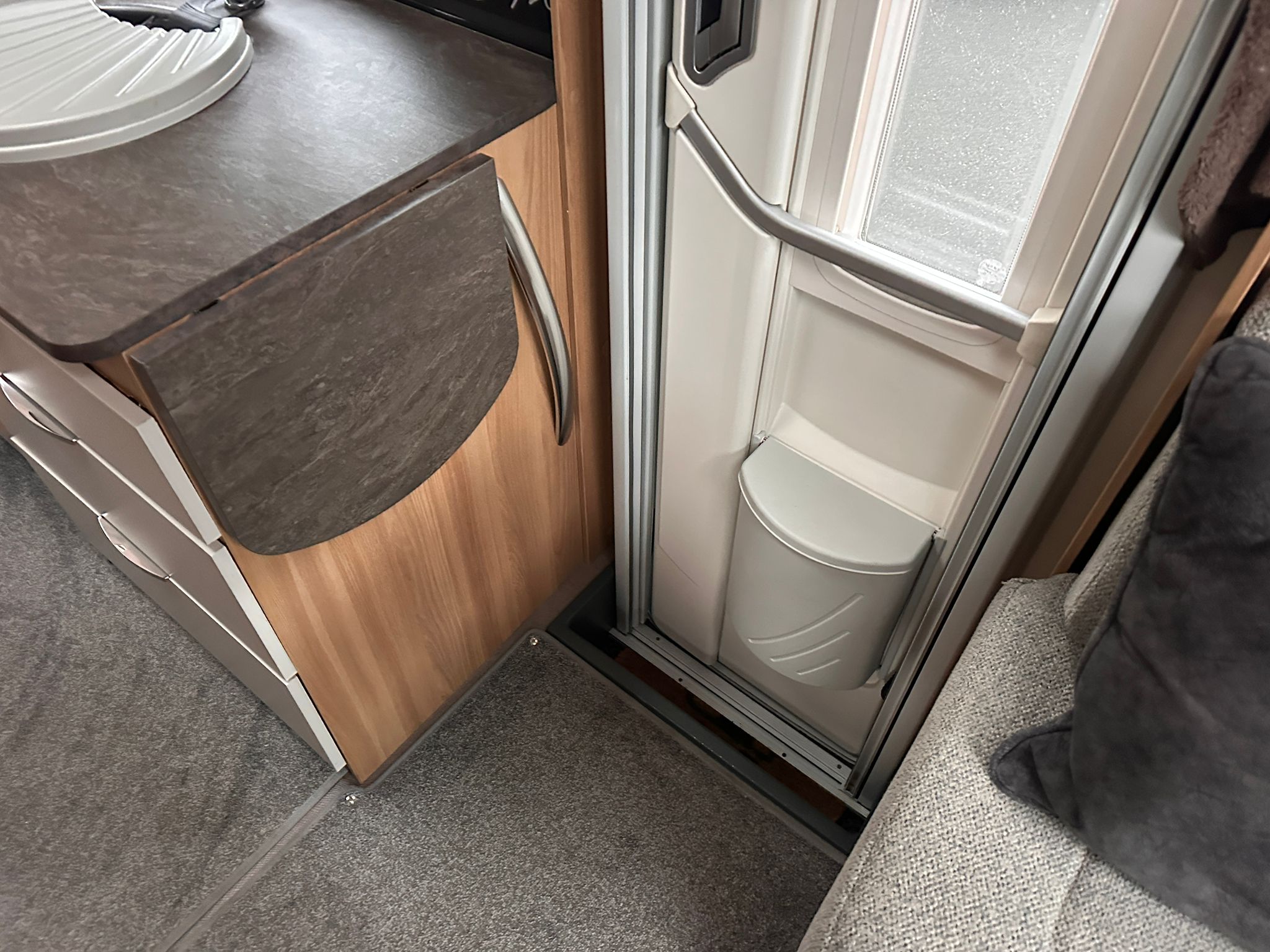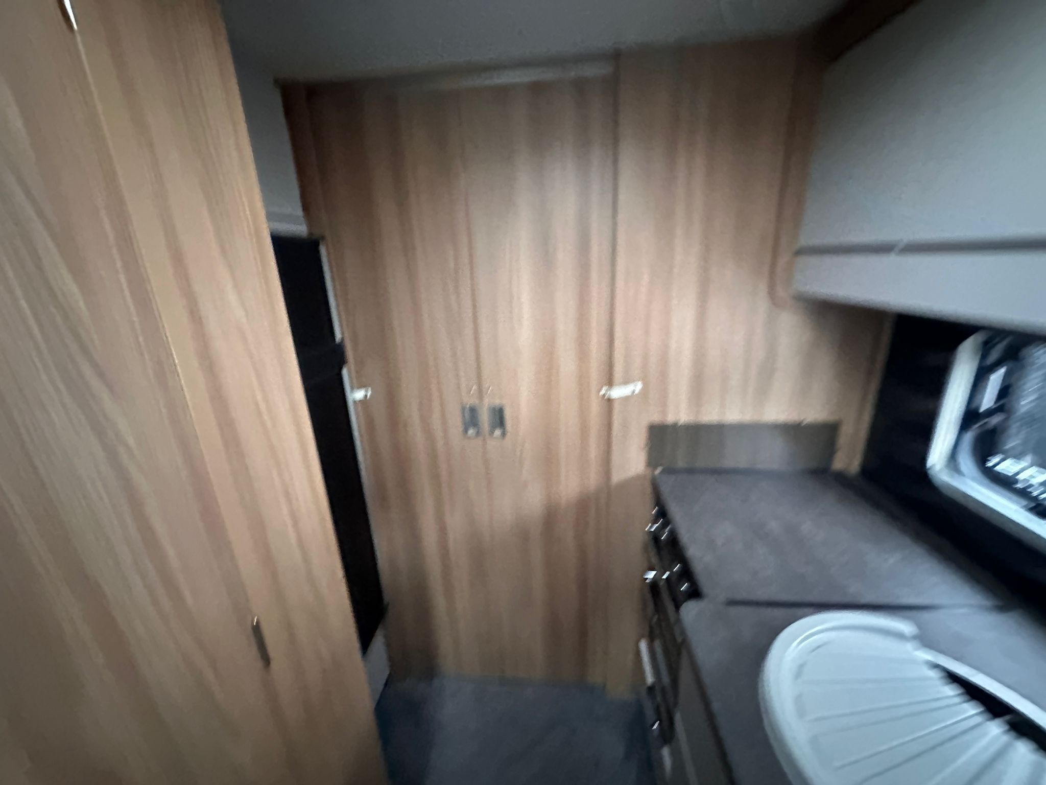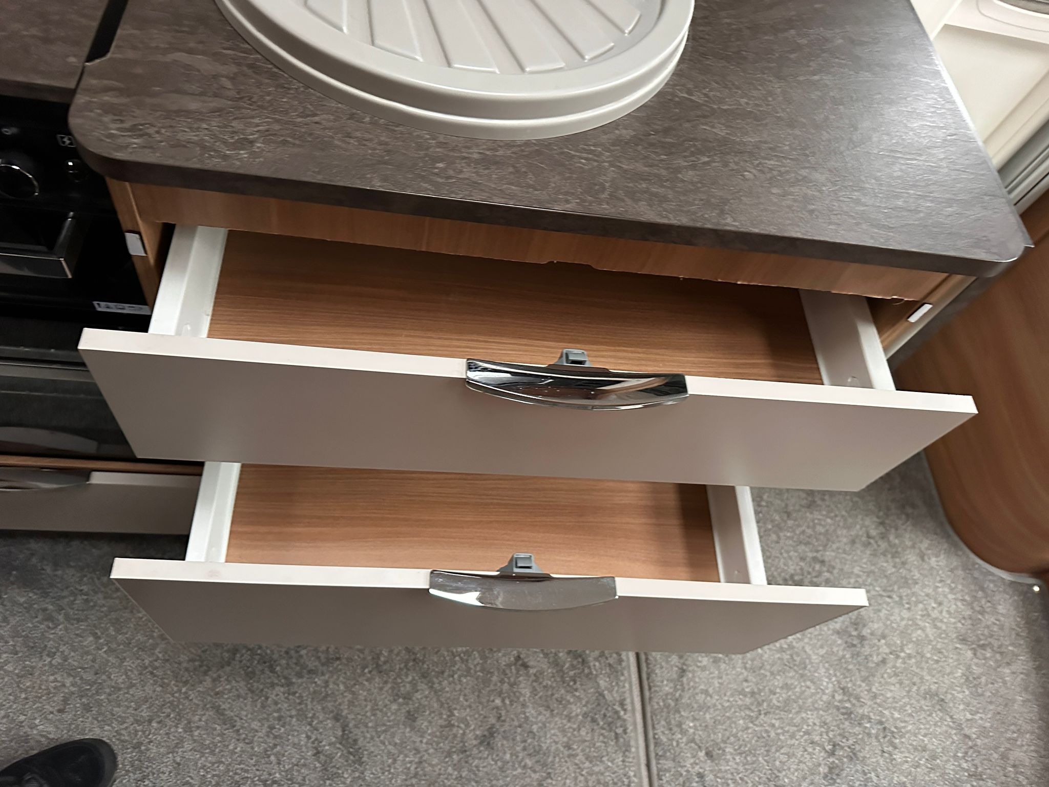 • Kitchen: A brilliantly equipped central kitchen featuring a Thetford K-Series oven, grill, and a 3-burner gas hob with one electric hotplate. It also includes a microwave and a massive 153-litre Dometic dual-opening fridge freezer.