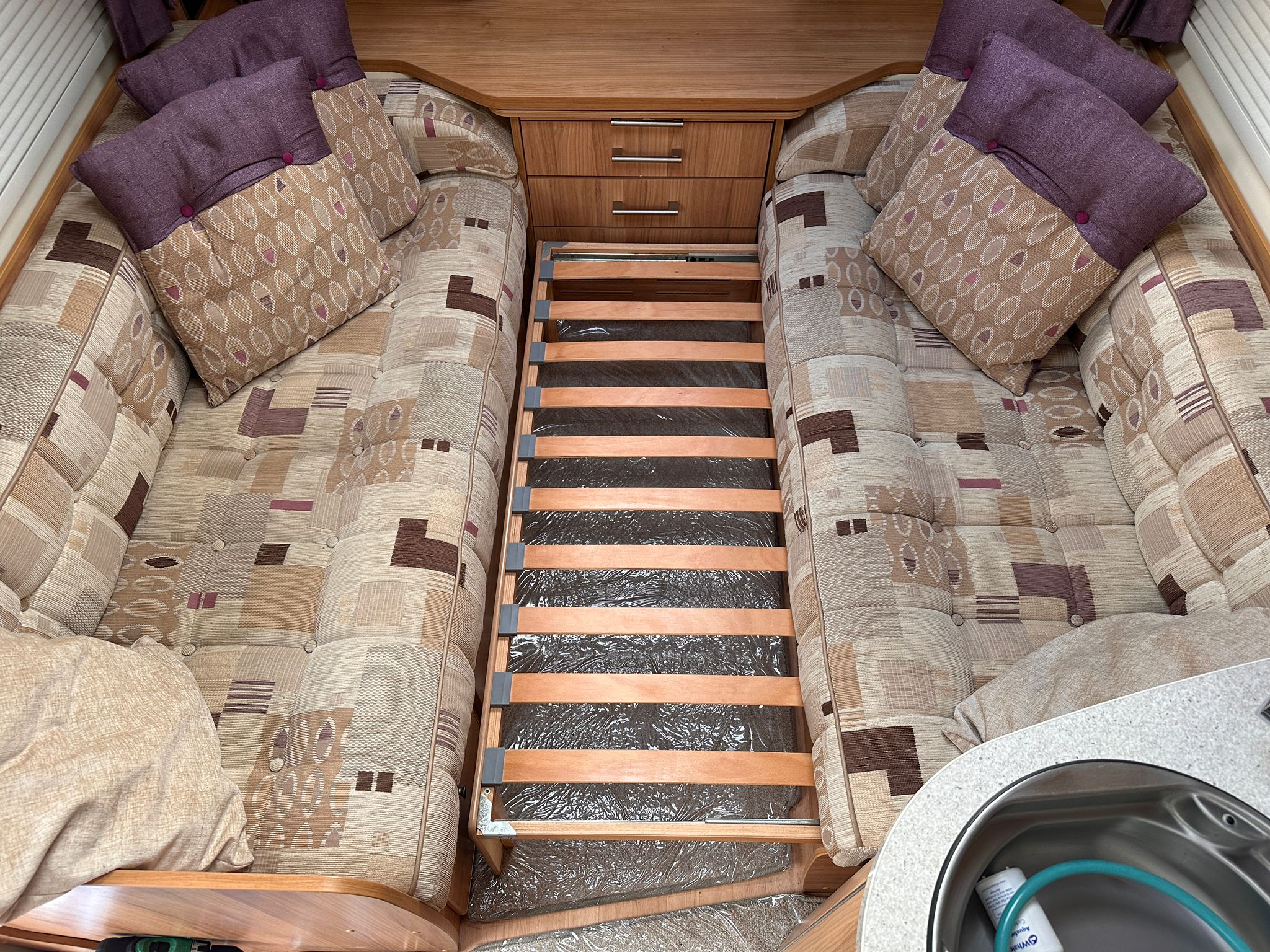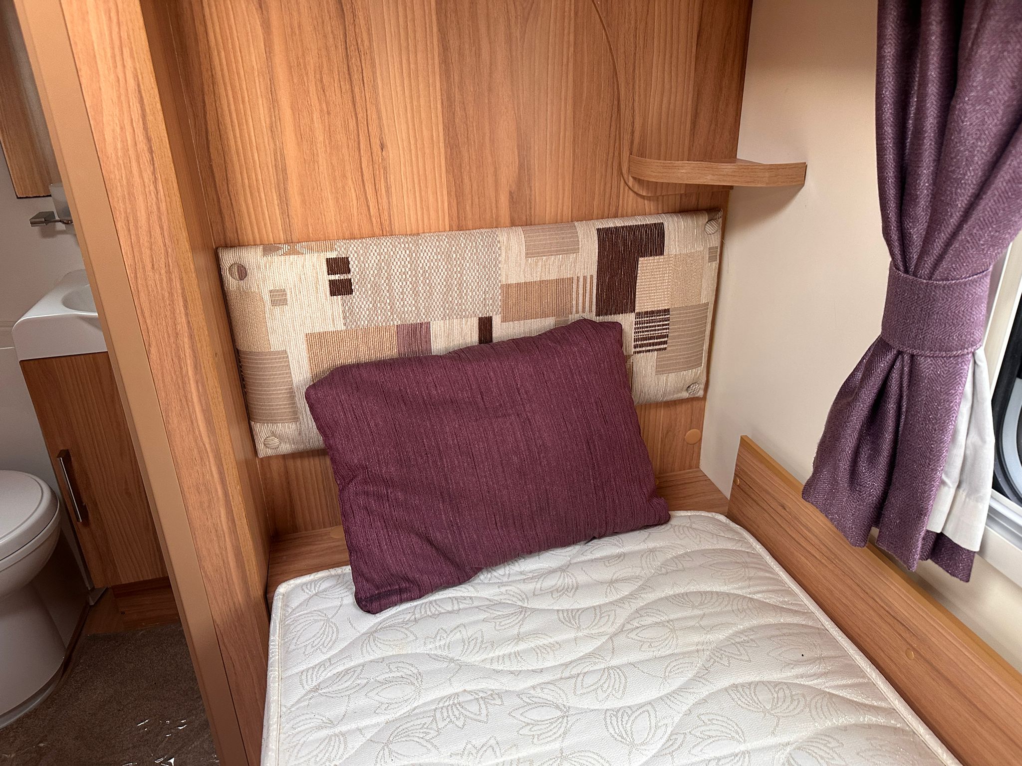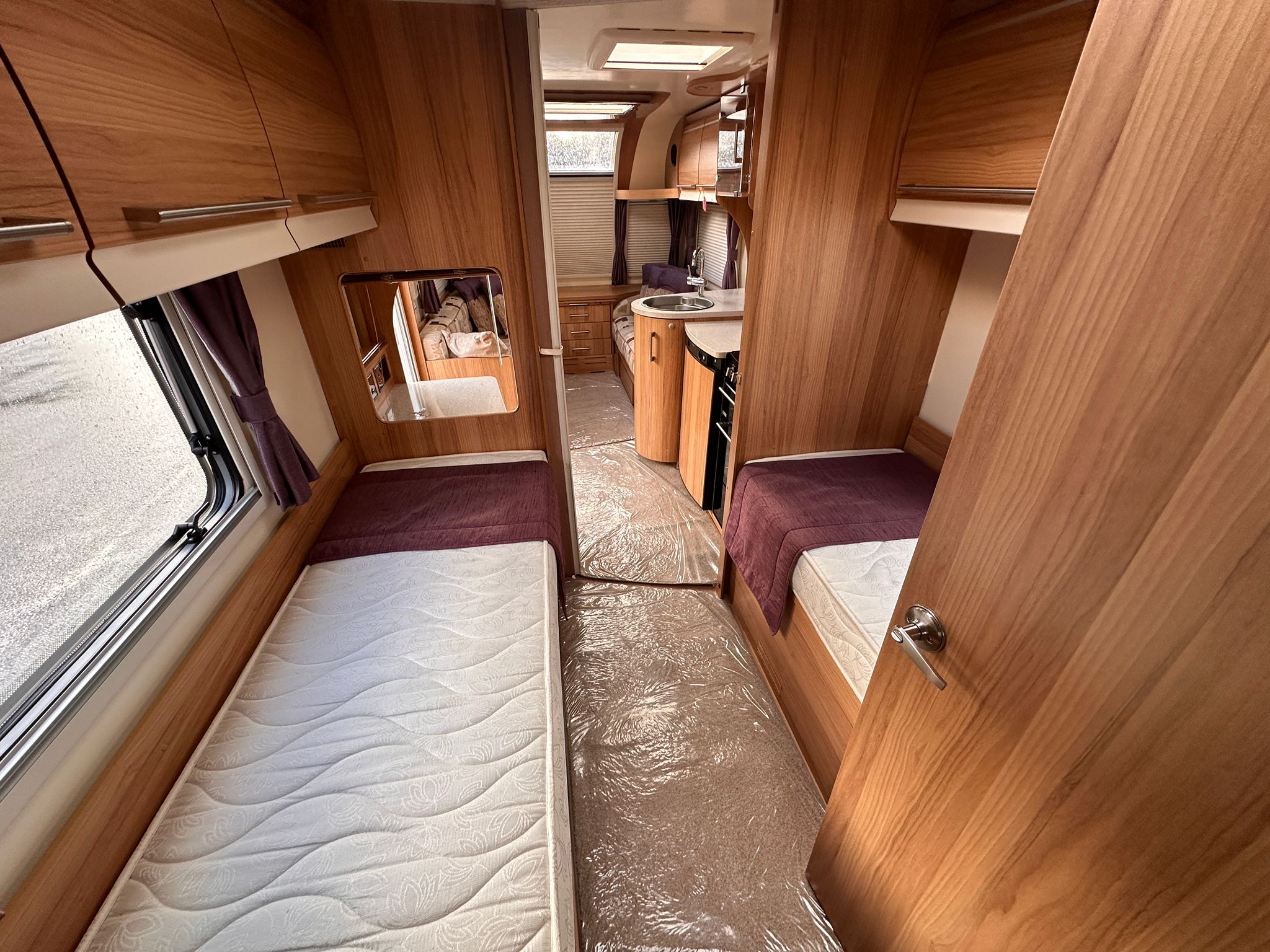 1. What is the layout? The Cadiz features twin fixed single beds in the rear bedroom, leading to a full-width end washroom. The front lounge converts into a double bed, making it a versatile 4-berth.