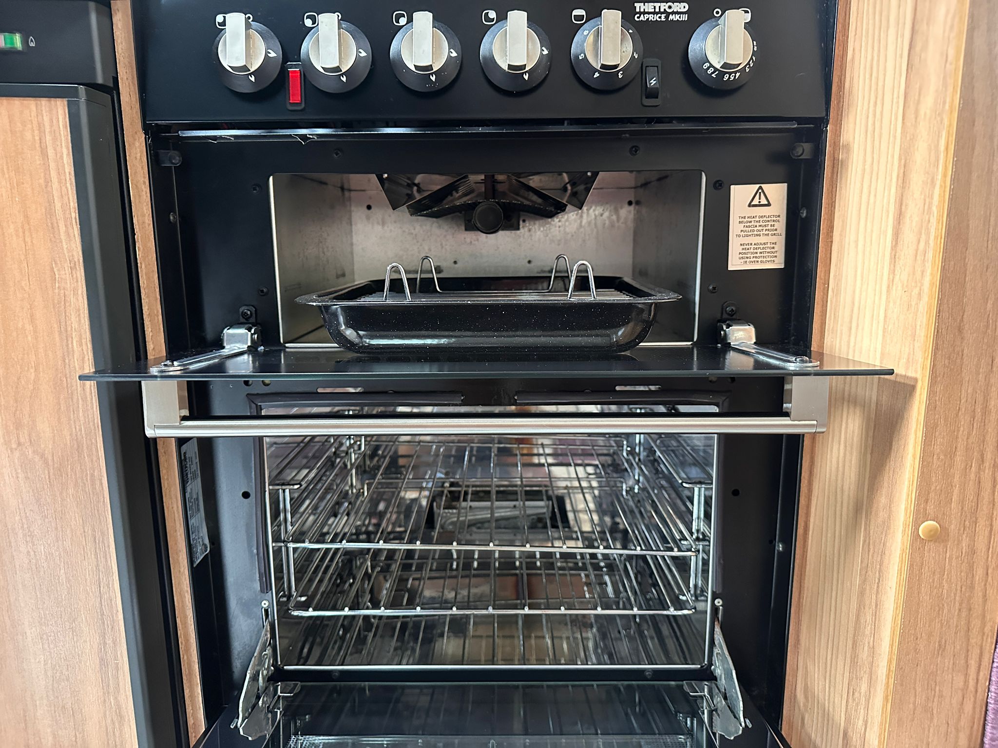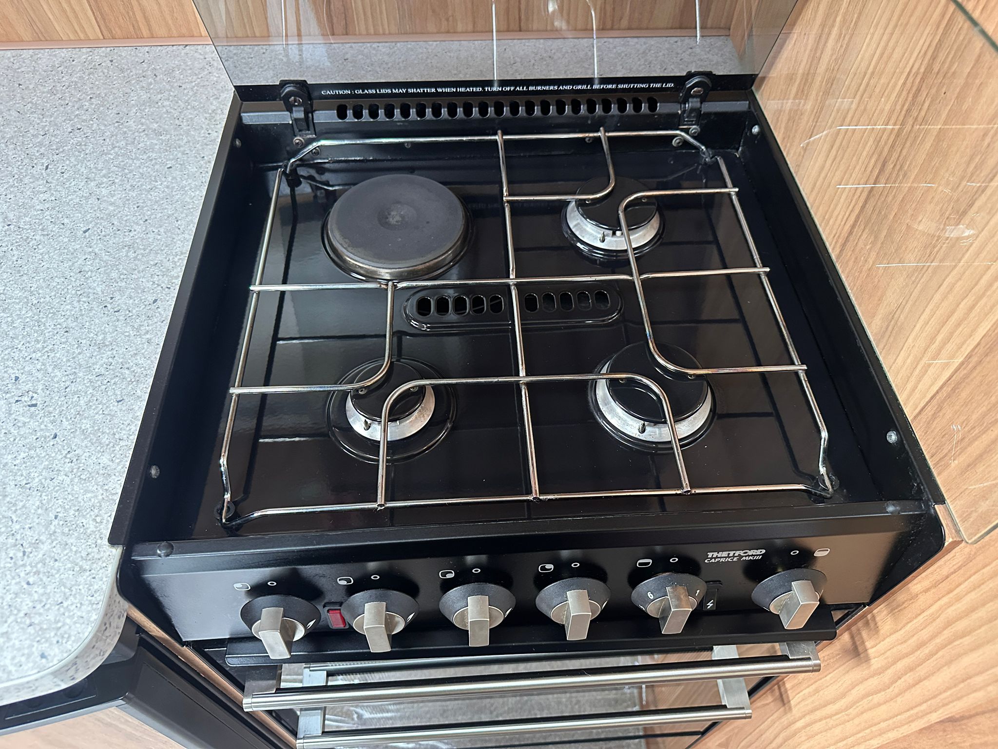 Kitchen: A premium workspace featuring a Thetford Caprice oven and grill, a dual-fuel hob (3 gas, 1 electric), and a microwave. It is fitted with a large Dometic fridge/freezer to keep you stocked up for longer trips.