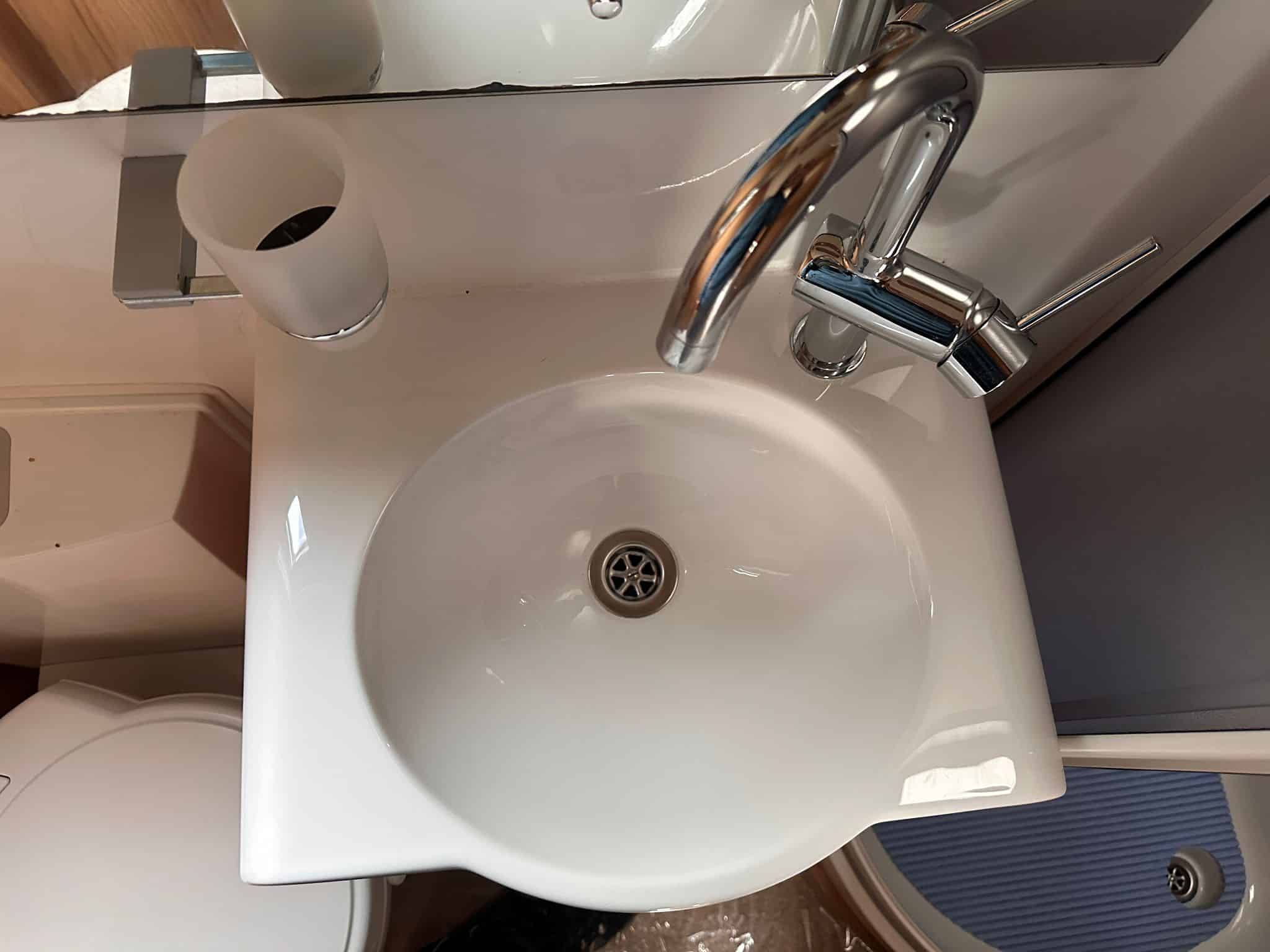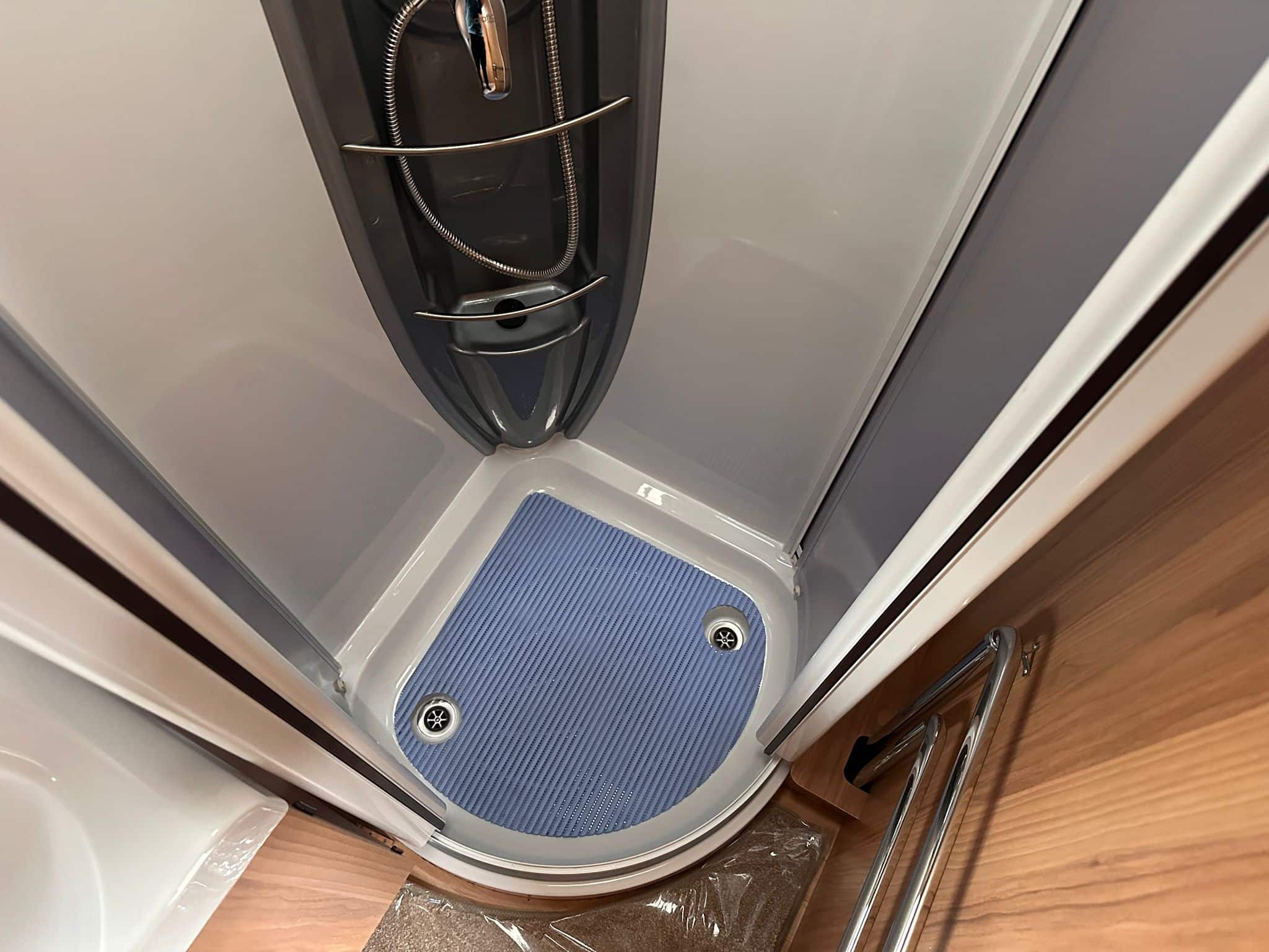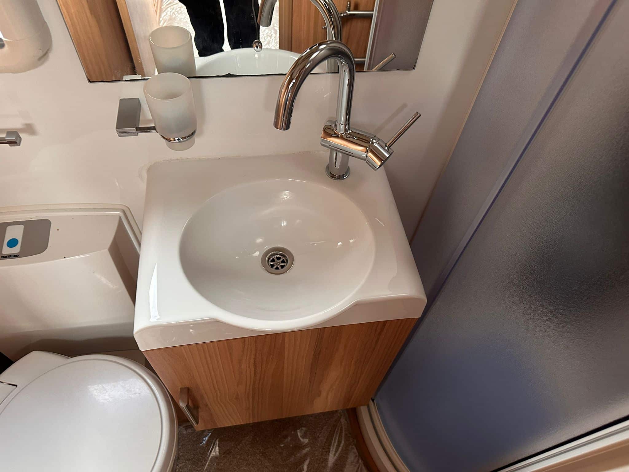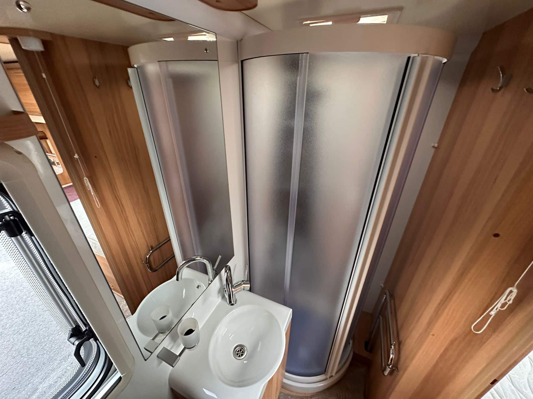 Washroom: The full-width end washroom serves as a private dressing area. It boasts a separate lined shower cubicle, a washbasin, a laundry basket, and a Thetford cassette toilet.