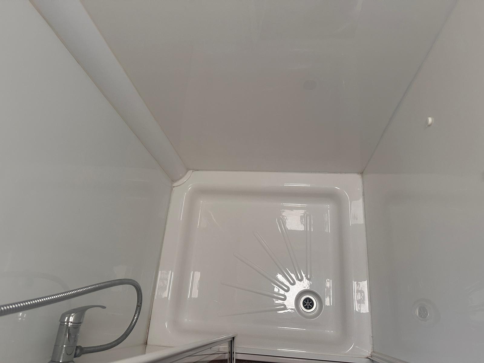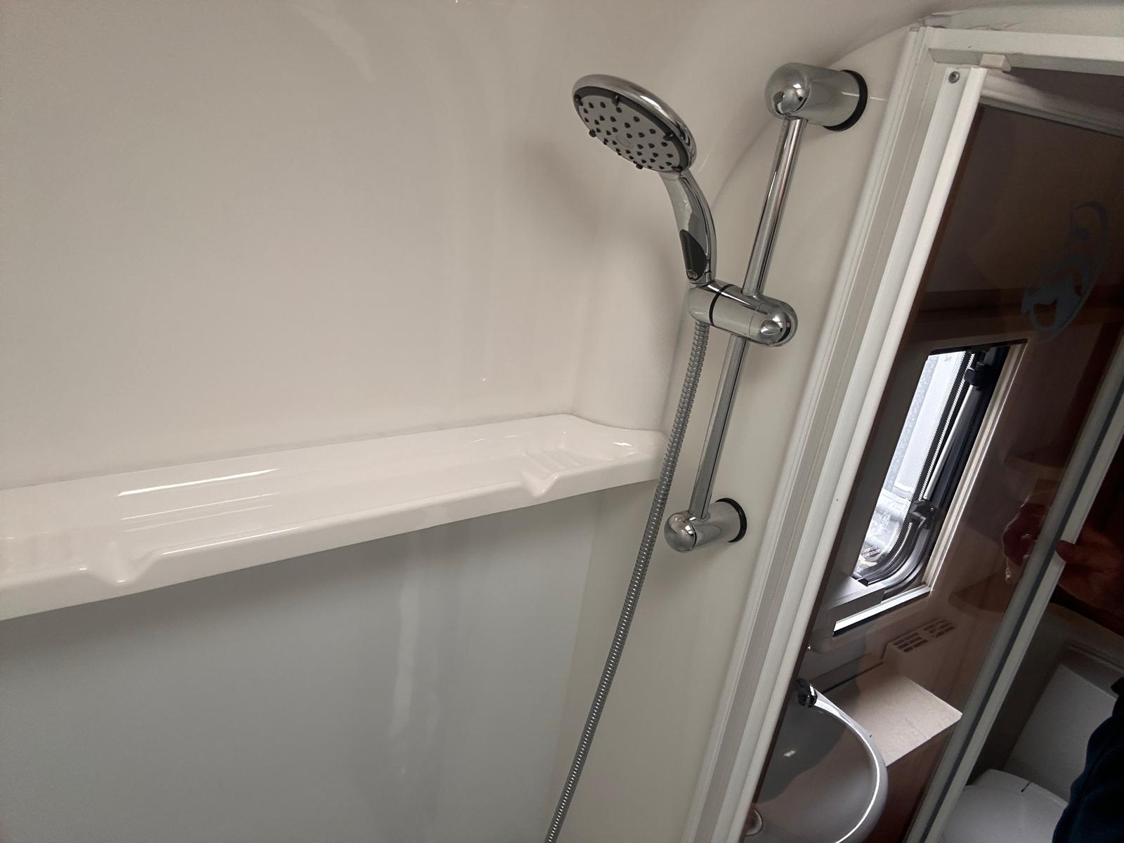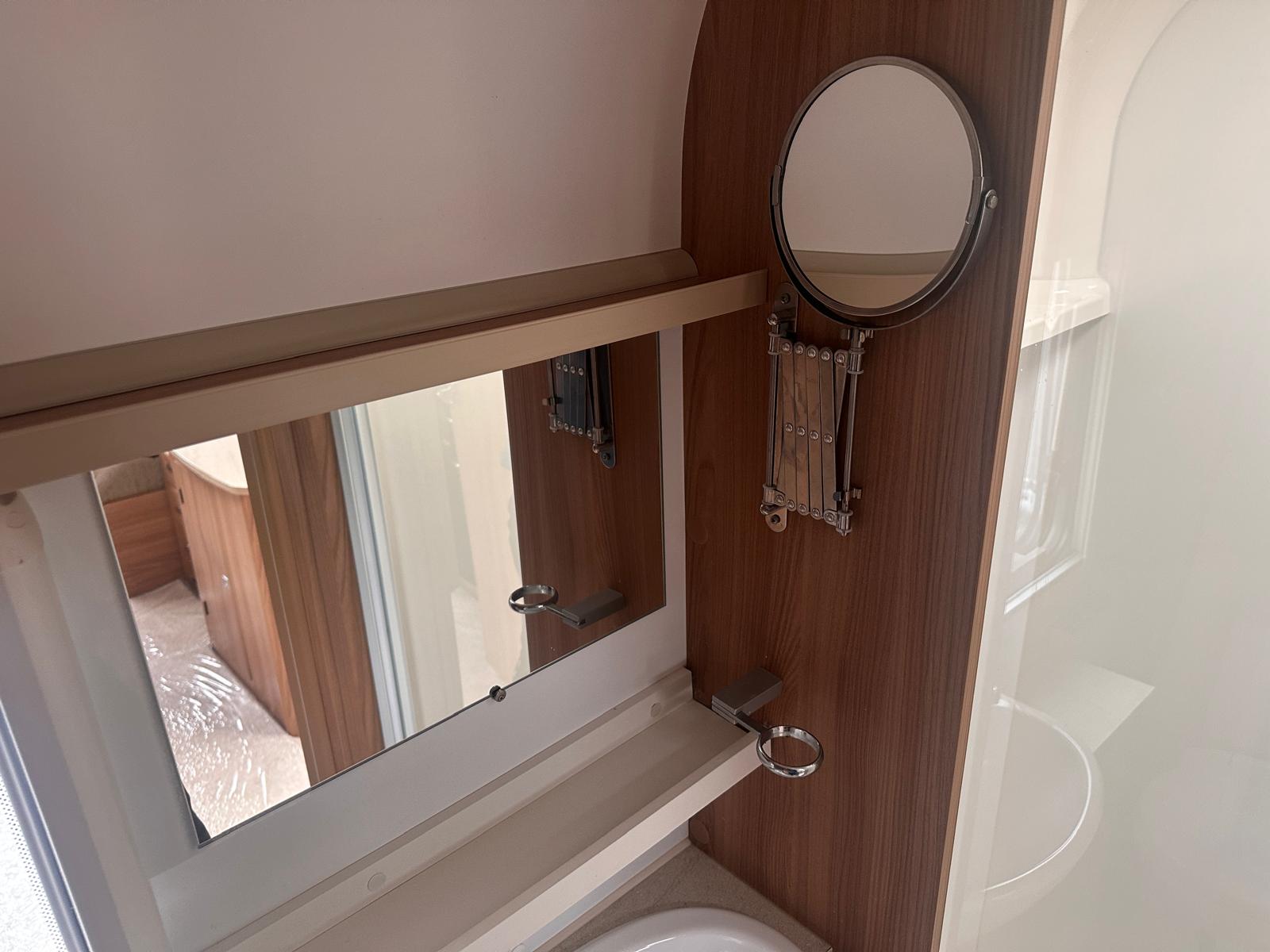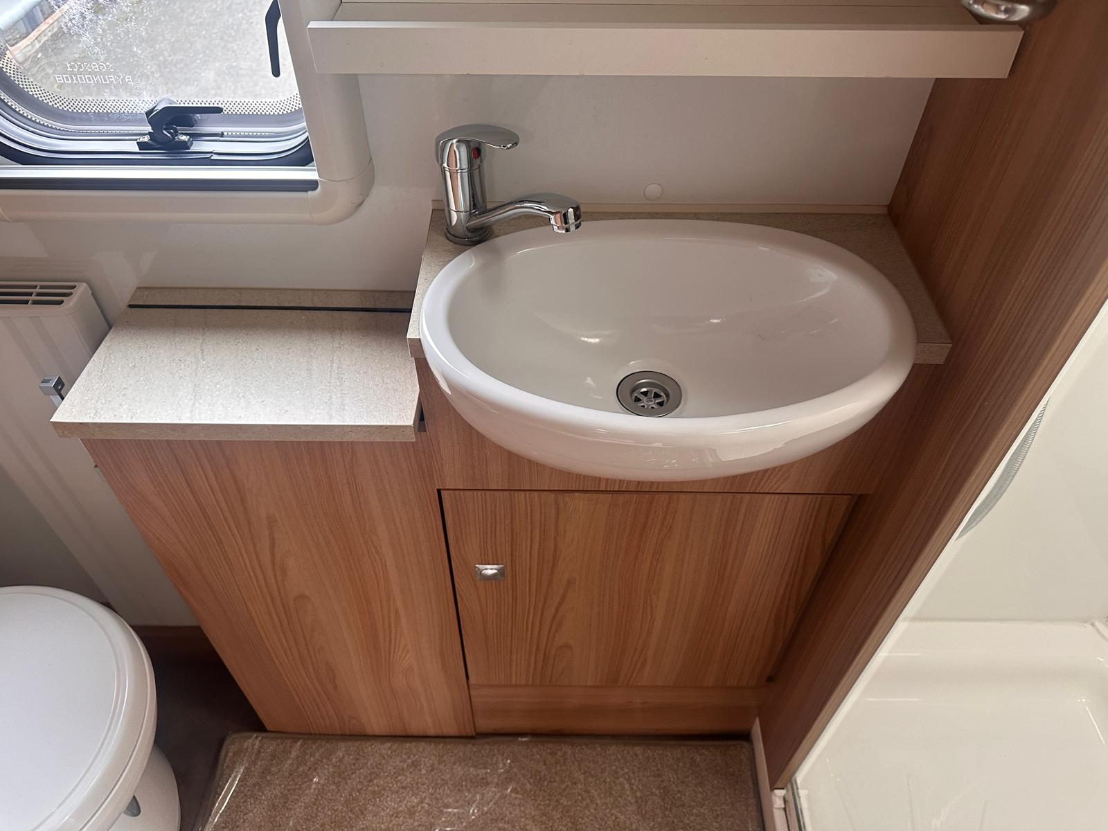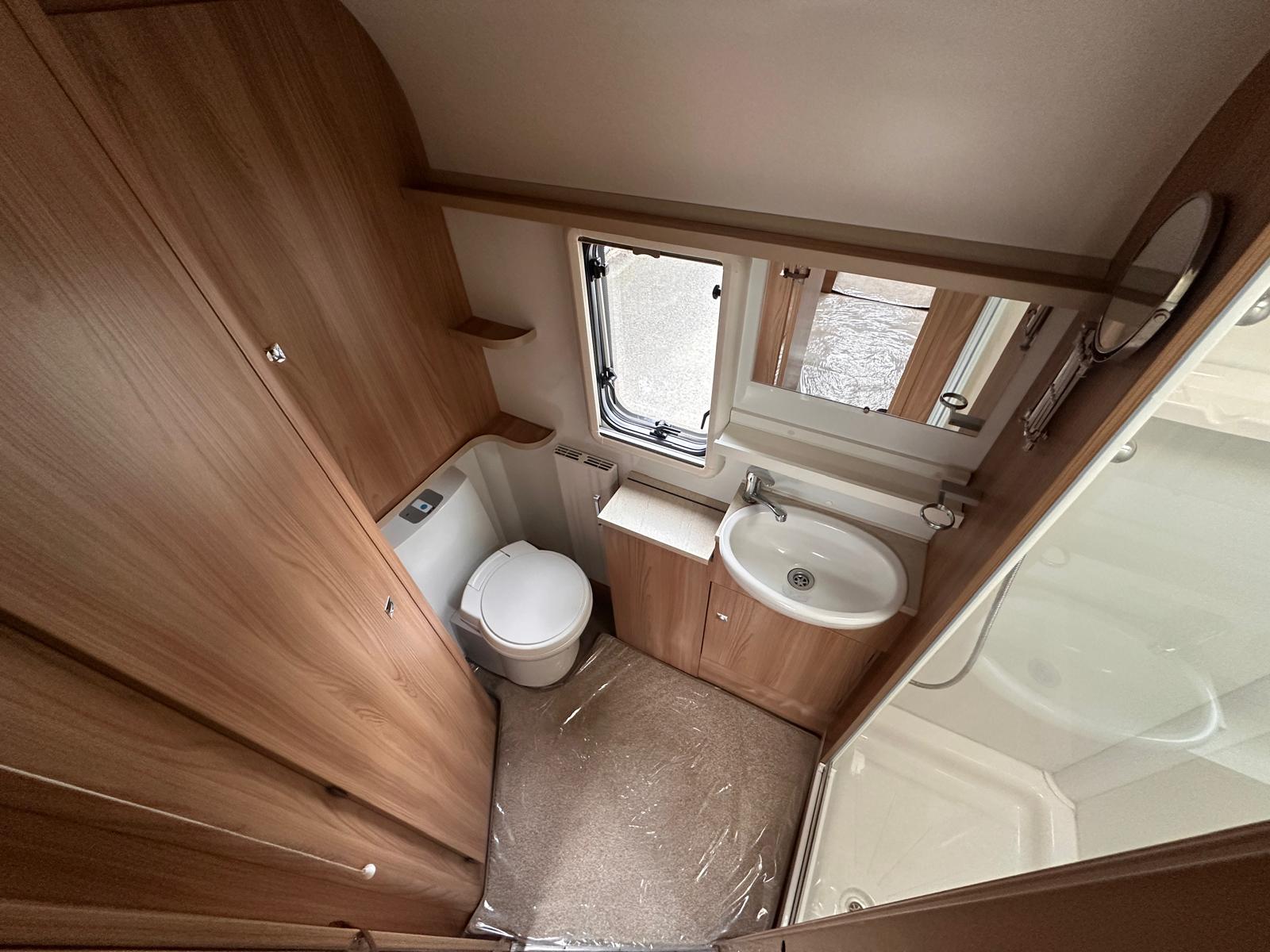 Washroom: A highly desirable, spacious full-width end washroom. It features a separate lined shower cubicle, a Thetford C-260 cassette toilet, a vanity unit, and excellent wardrobe space.