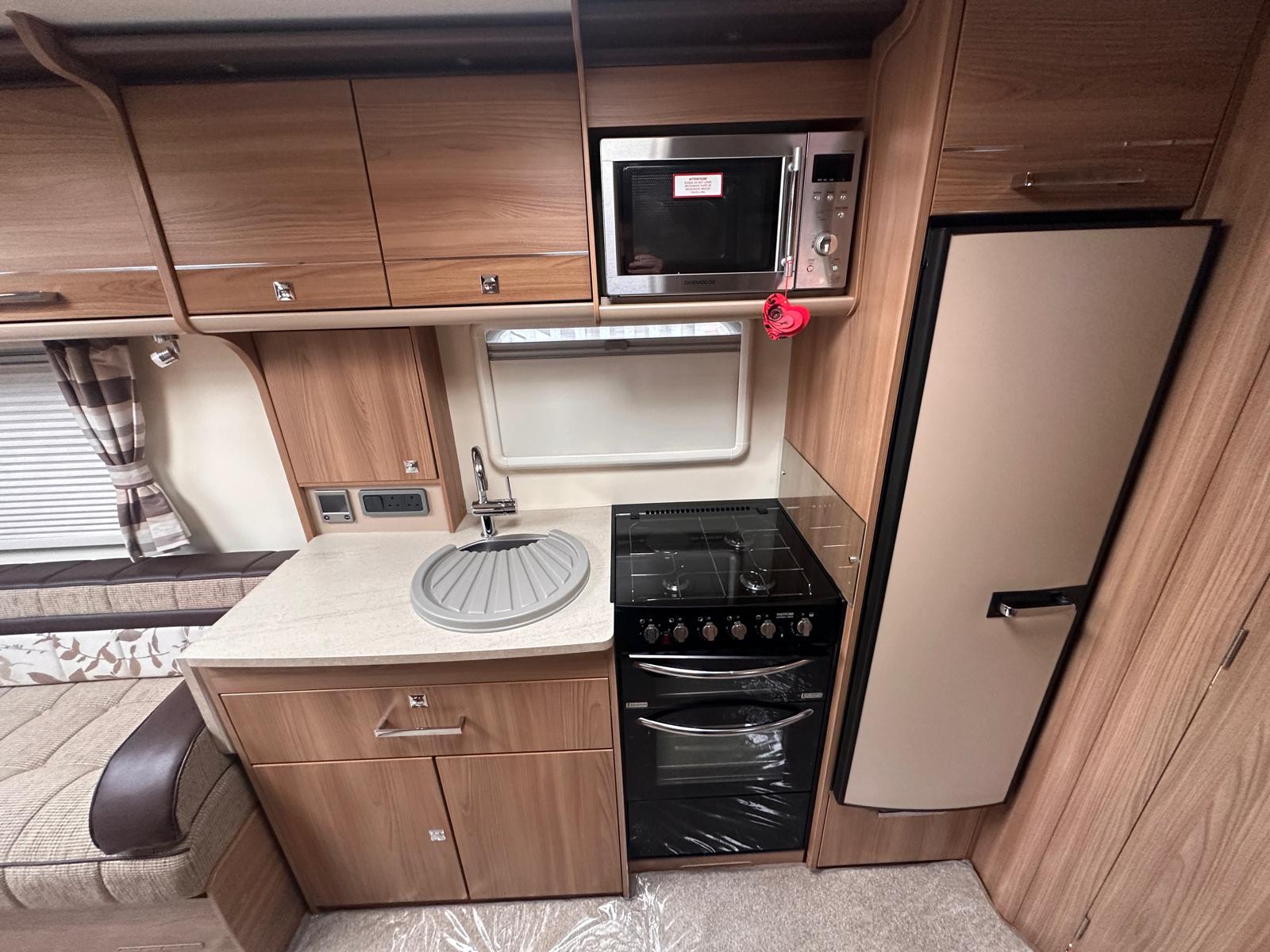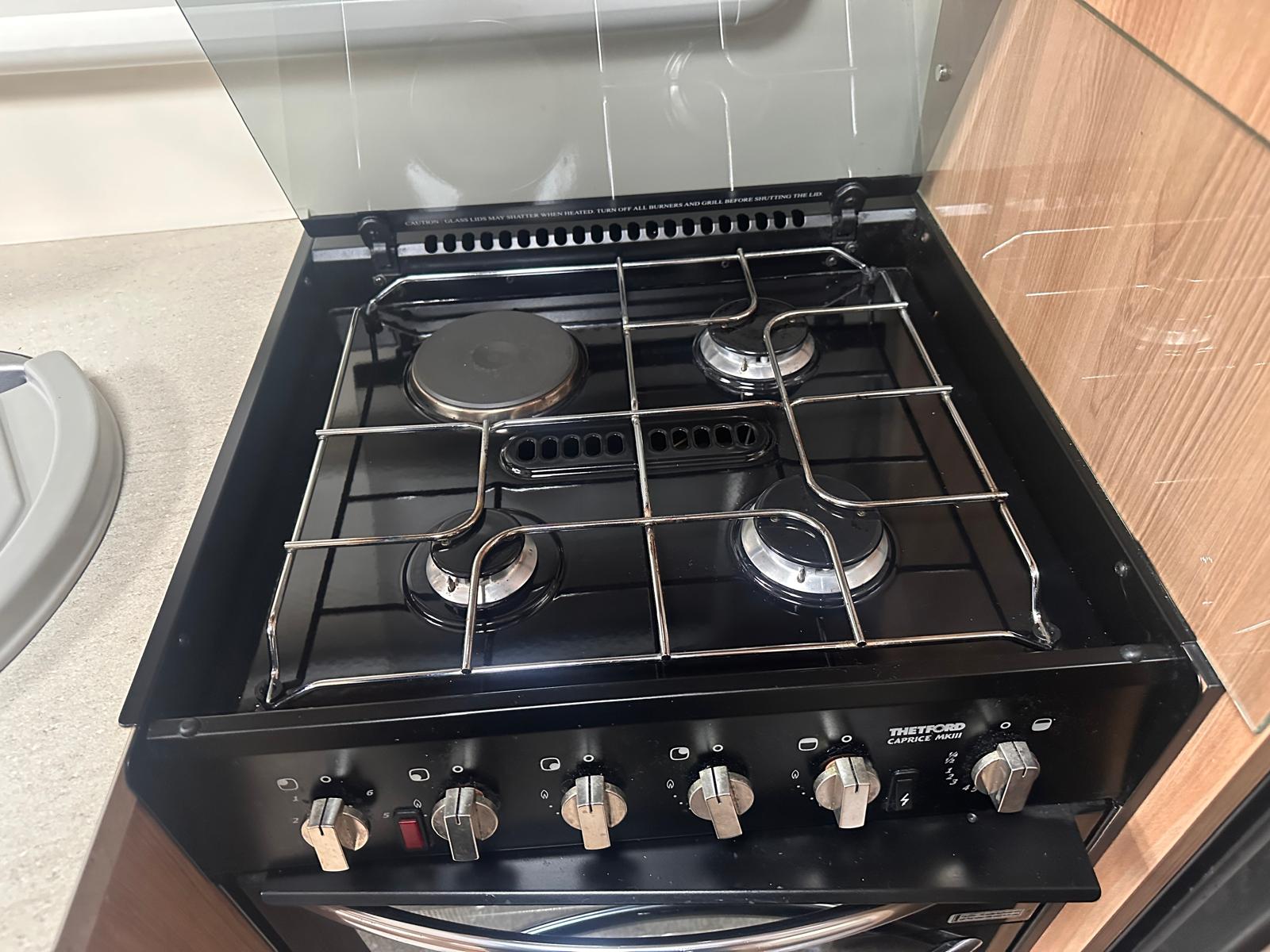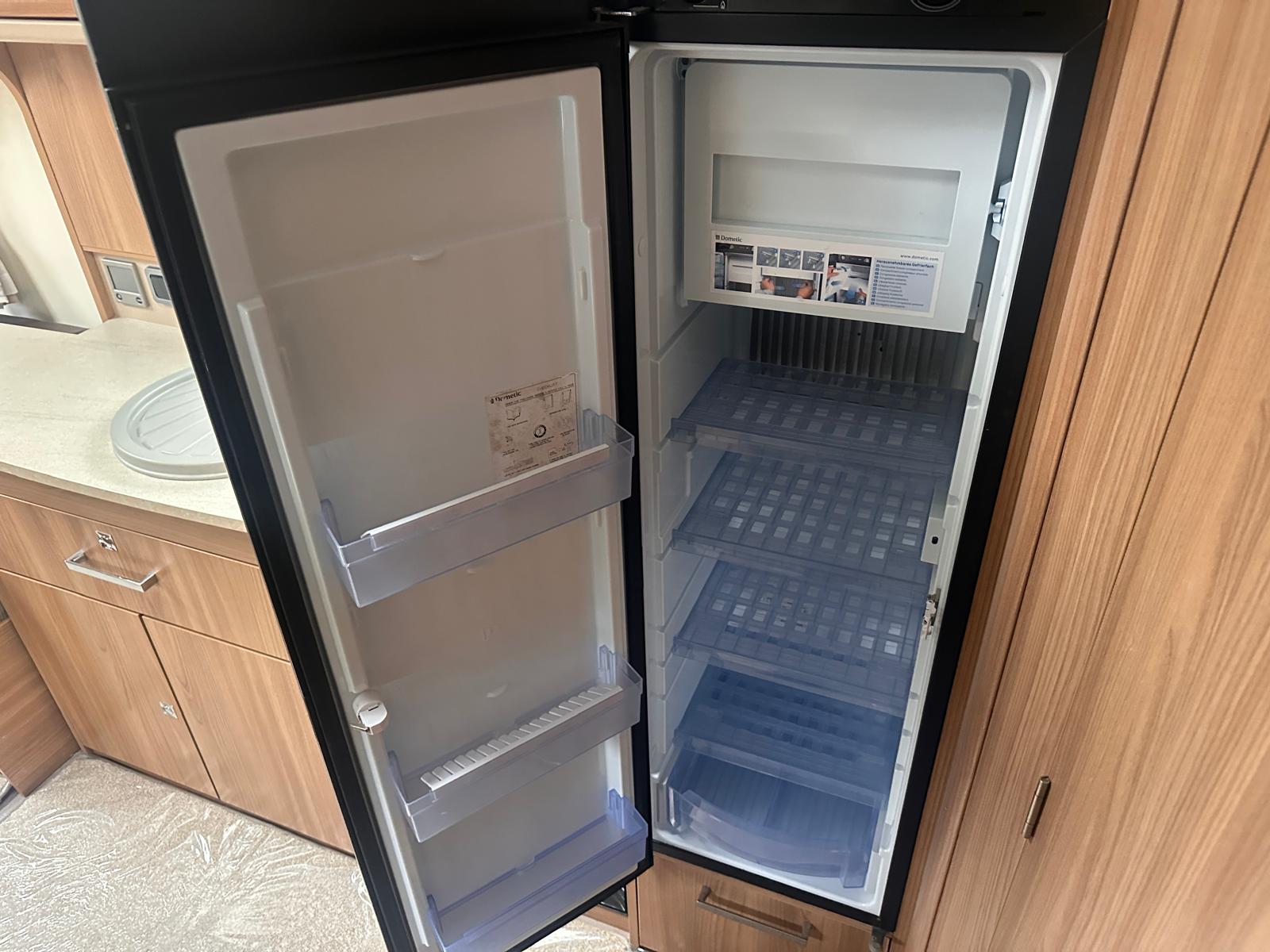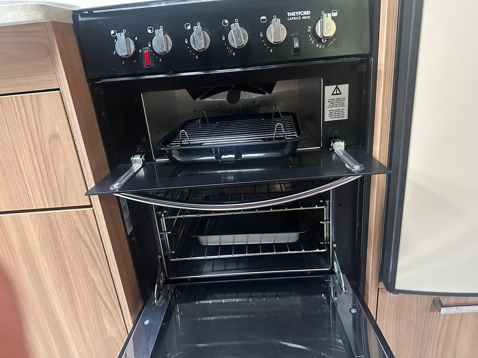 Kitchen: A well-appointed mid-ship kitchen equipped with a large 133-litre Dometic tower refrigerator, a Thetford Caprice oven and grill, a 4-burner hob (3 gas, 1 electric), and a built-in microwave.