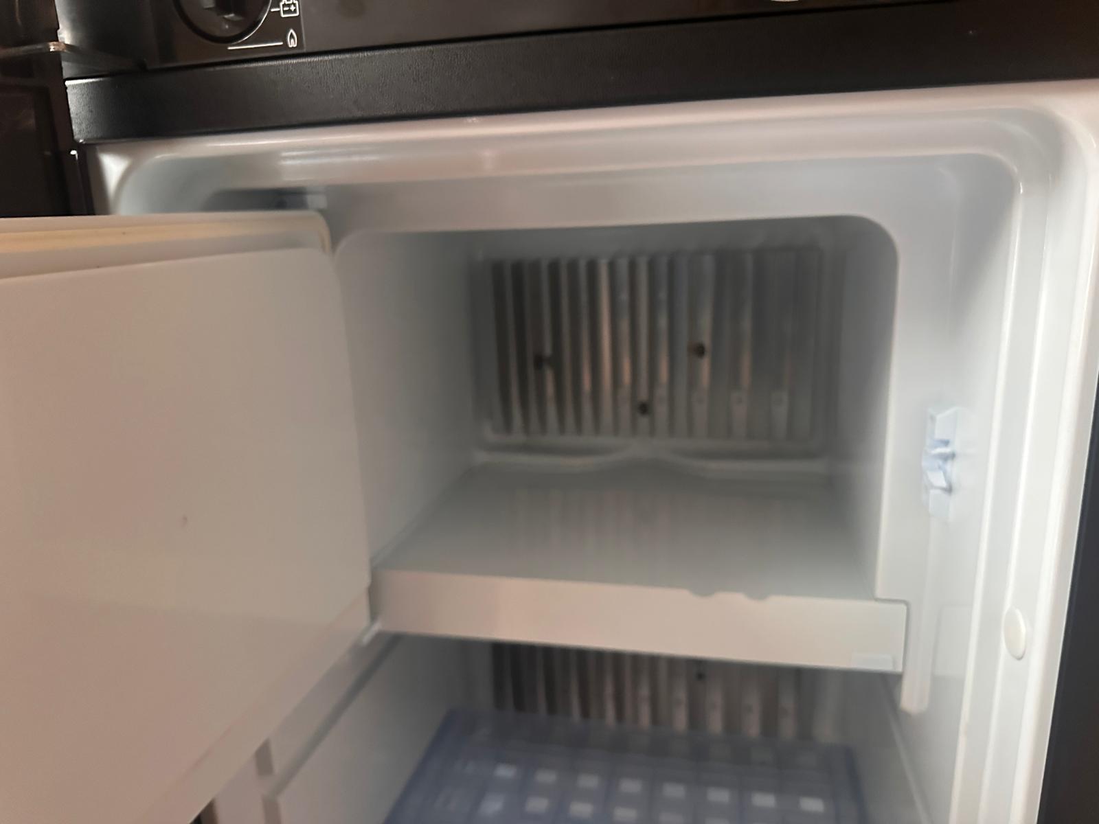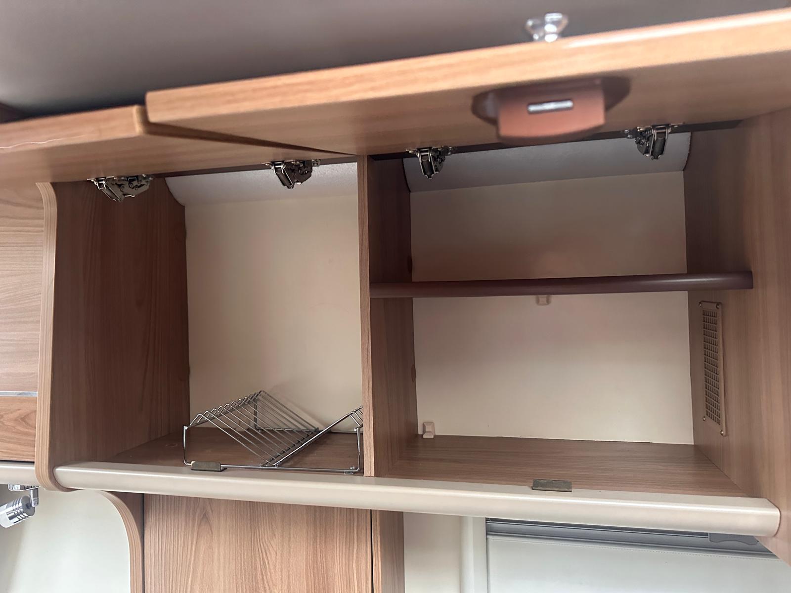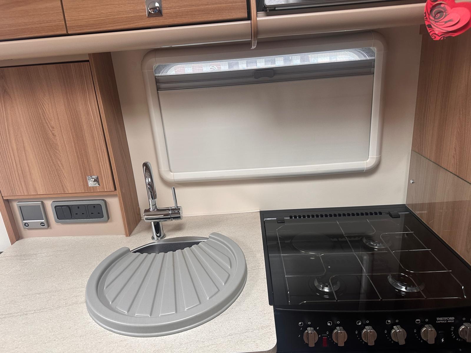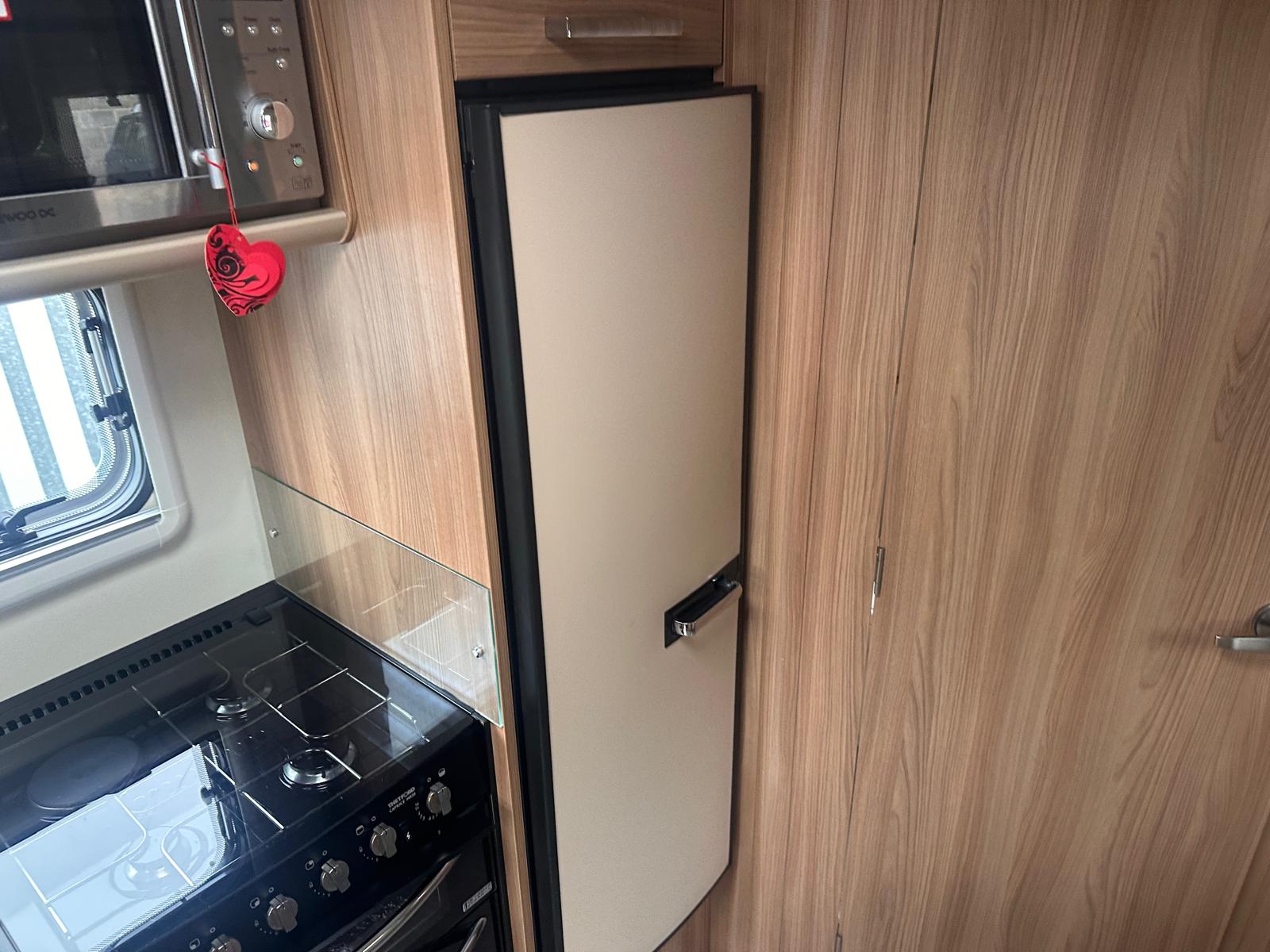 Kitchen: A well-appointed mid-ship kitchen equipped with a large 133-litre Dometic tower refrigerator, a Thetford Caprice oven and grill, a 4-burner hob (3 gas, 1 electric), and a built-in microwave.