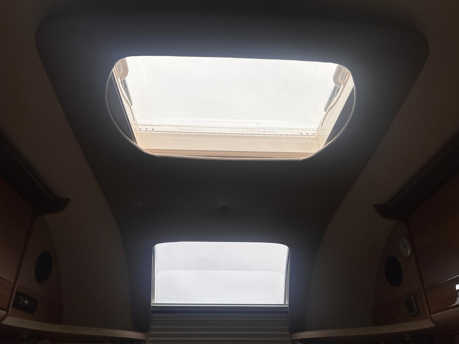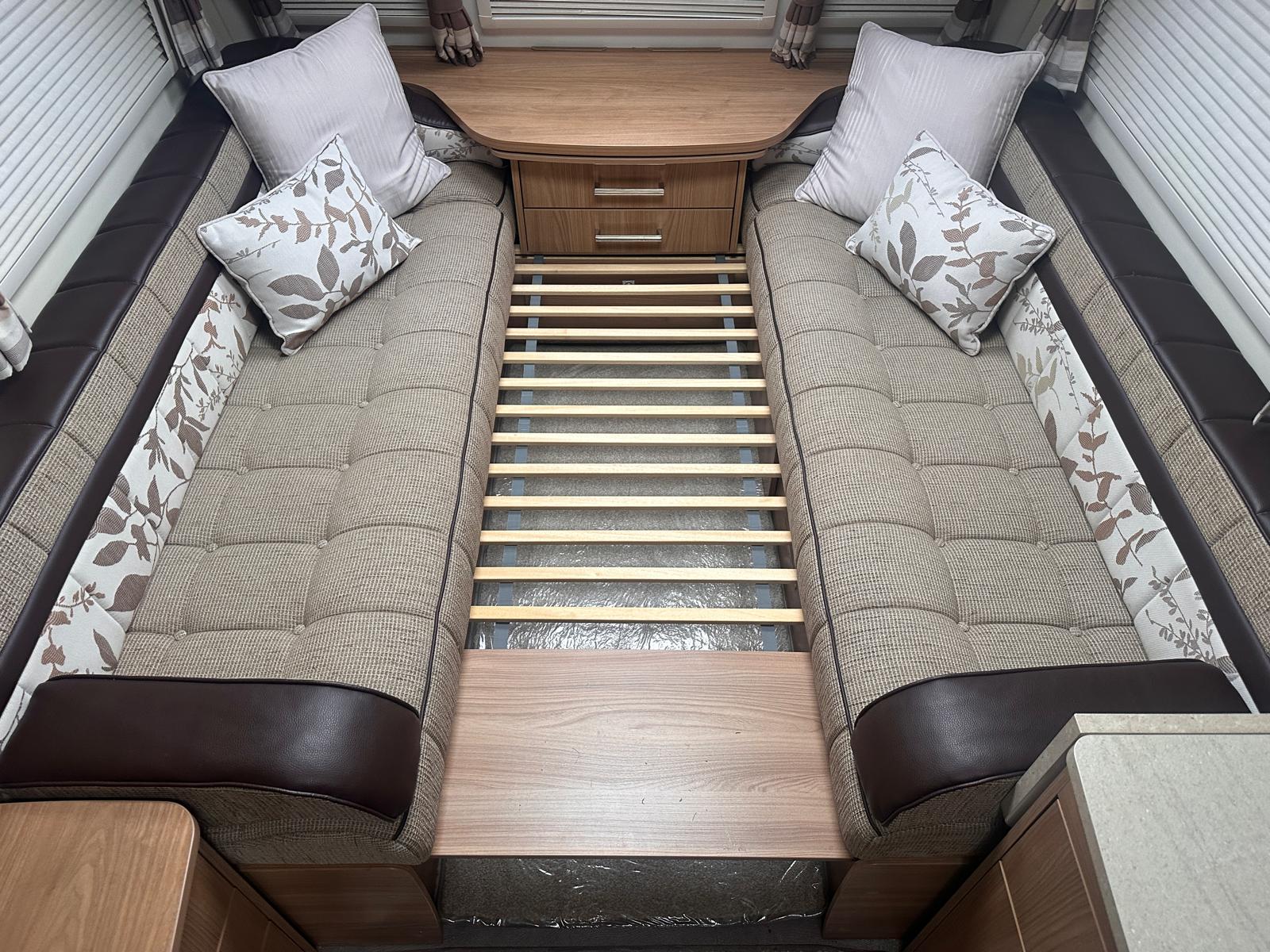 Lounge & Bed Layout: The front lounge features parallel seating flooded with light from the signature vertical front skylight. At night, this space converts into either two comfortable single beds or one exceptionally large double bed (approx. 6’6″ x 6’3″).