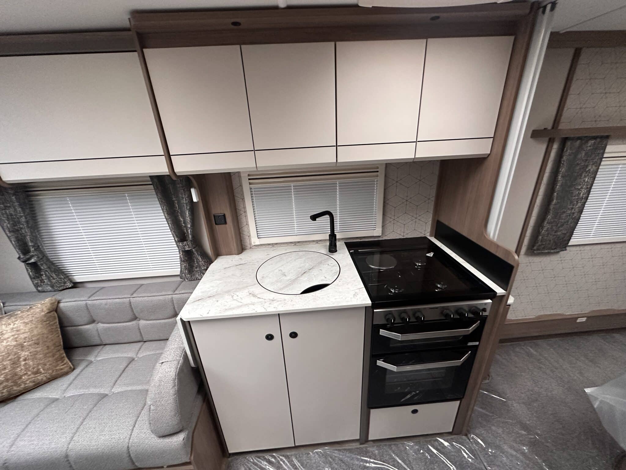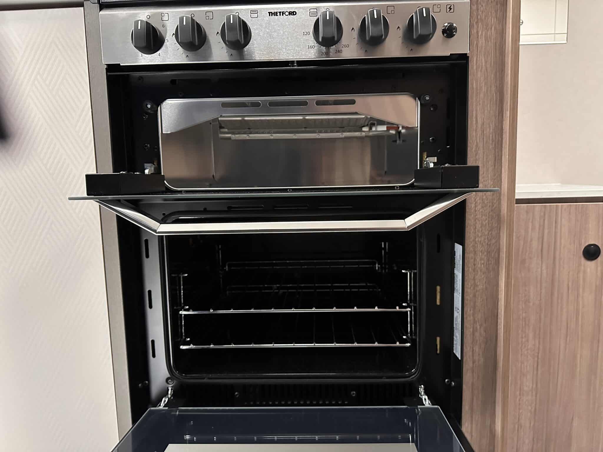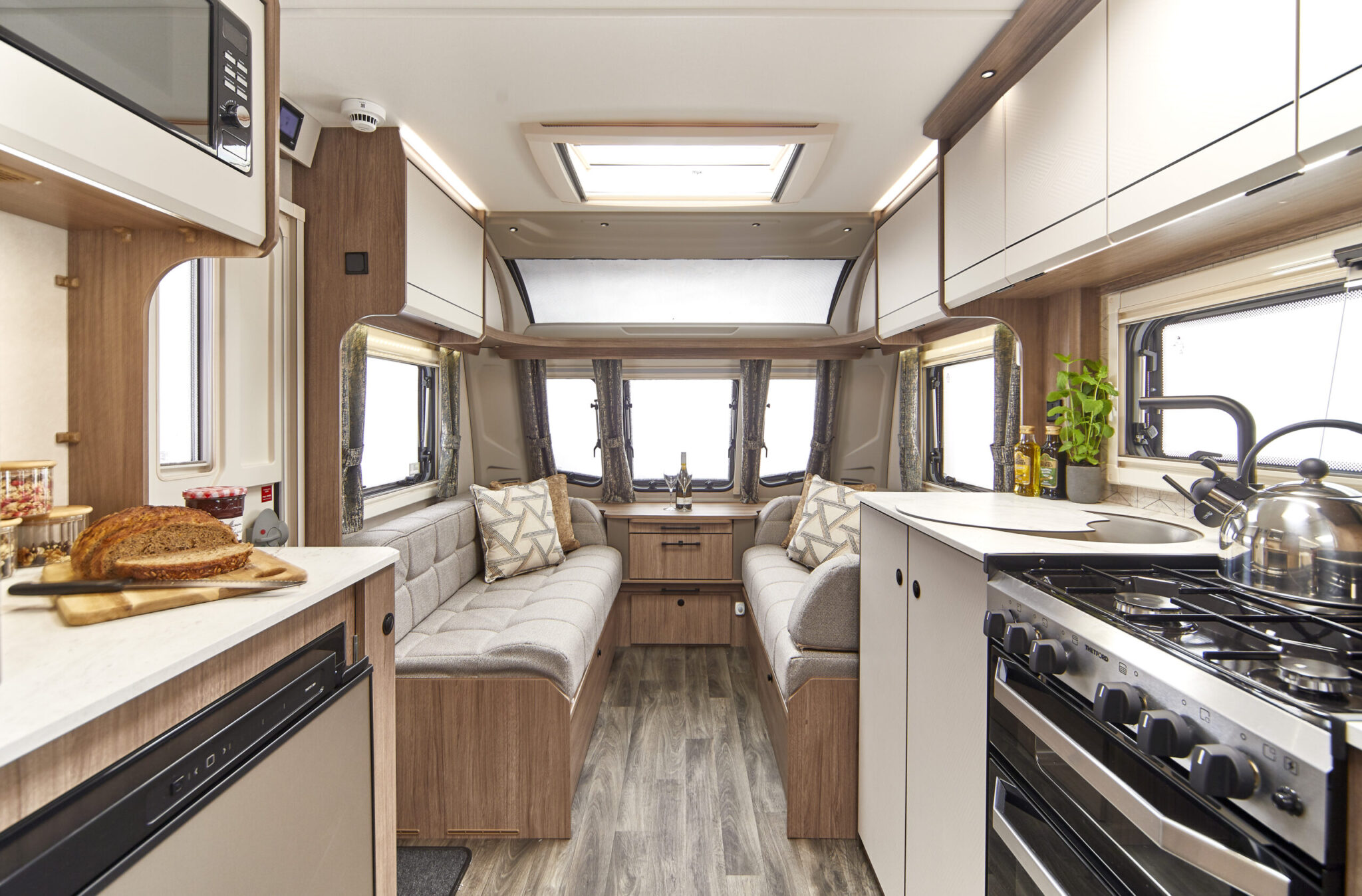 - Modern Kitchen: It’s great to have a fully equipped kitchen with a Thetford dual-fuel hob, oven, grill, and a 91-litre electronic fridge freezer.