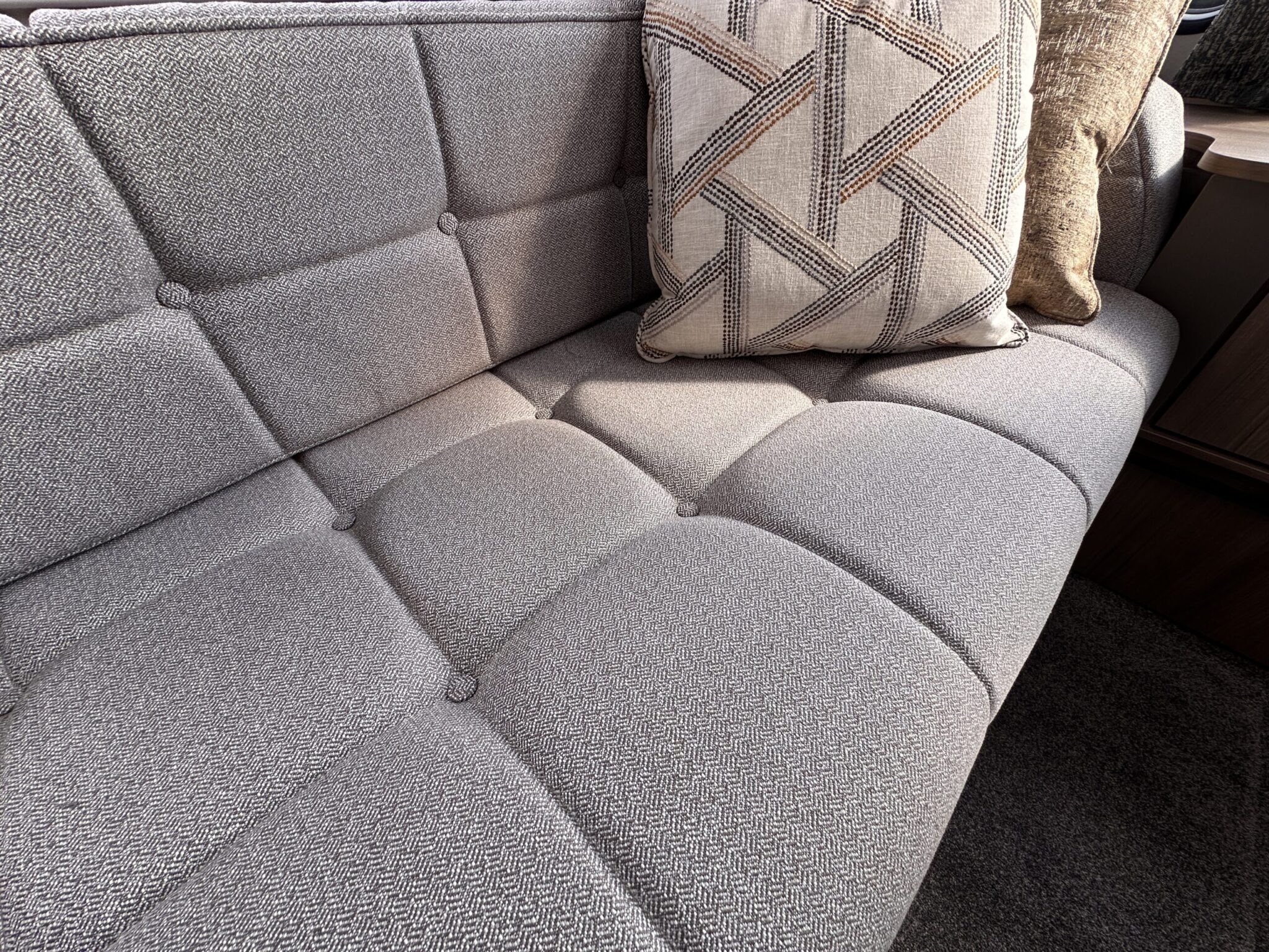 Coordinating scatter cushions, sculptured armrests, and deep pile carpets