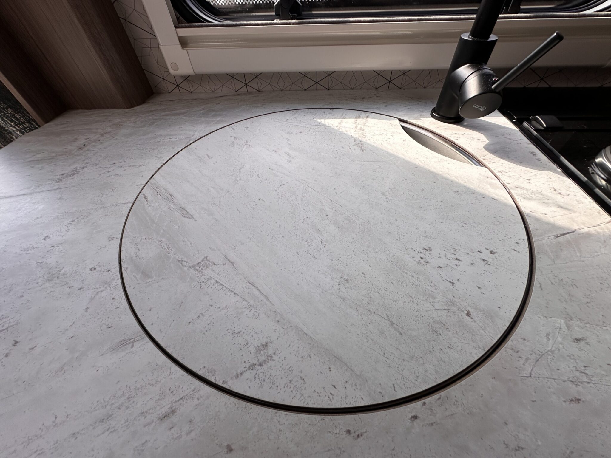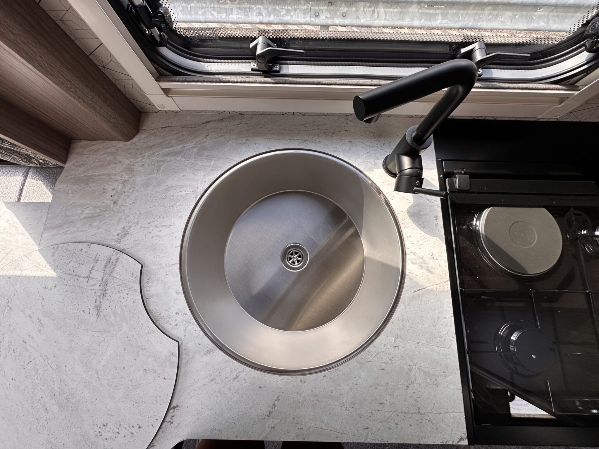 Flatbed microwave and underslung round sink