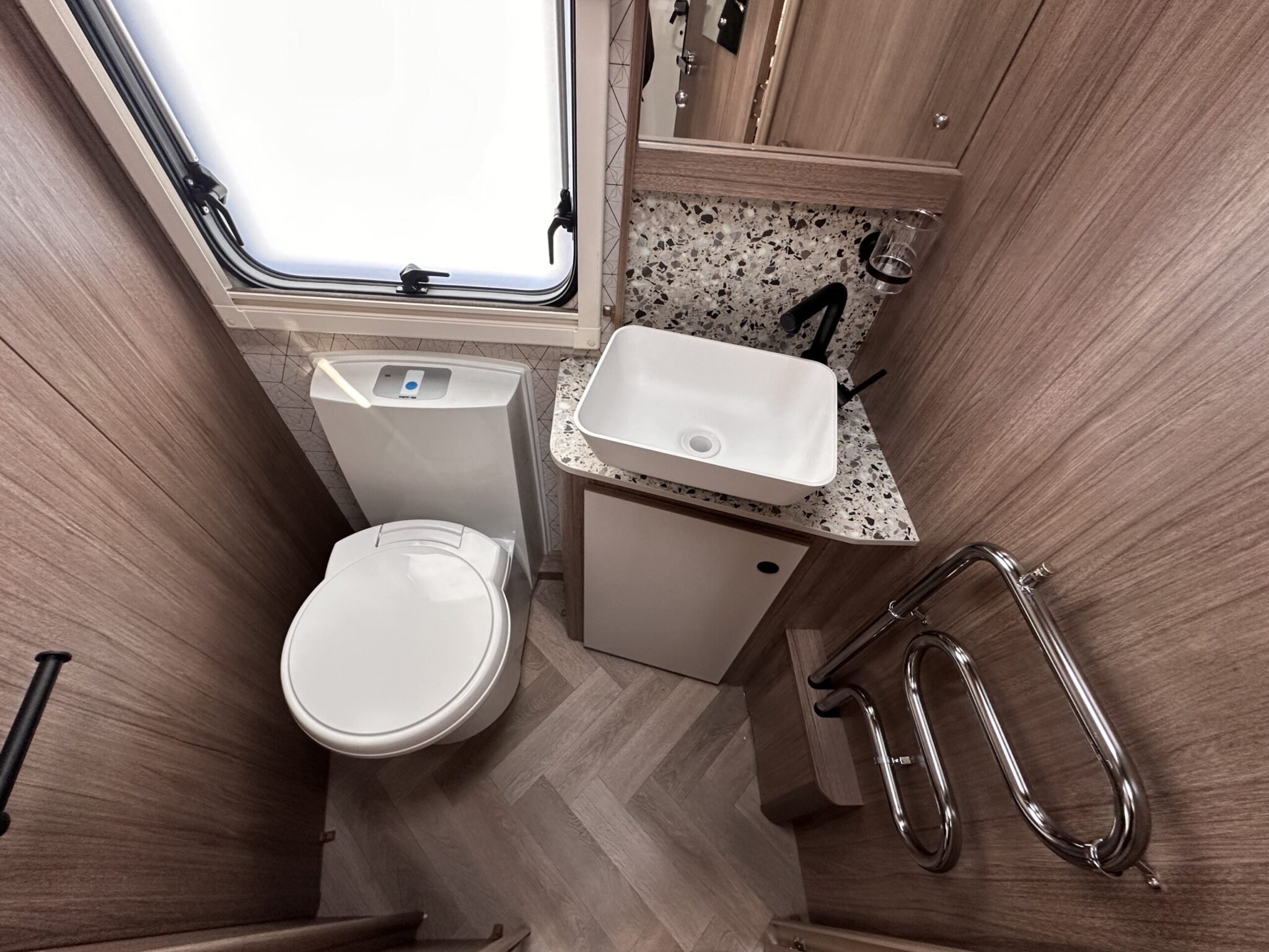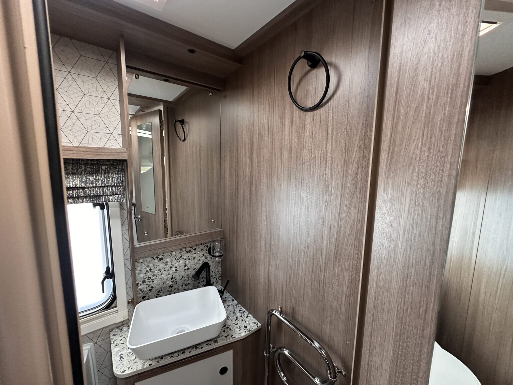 Central washroom with fully lined shower and heated towel rail