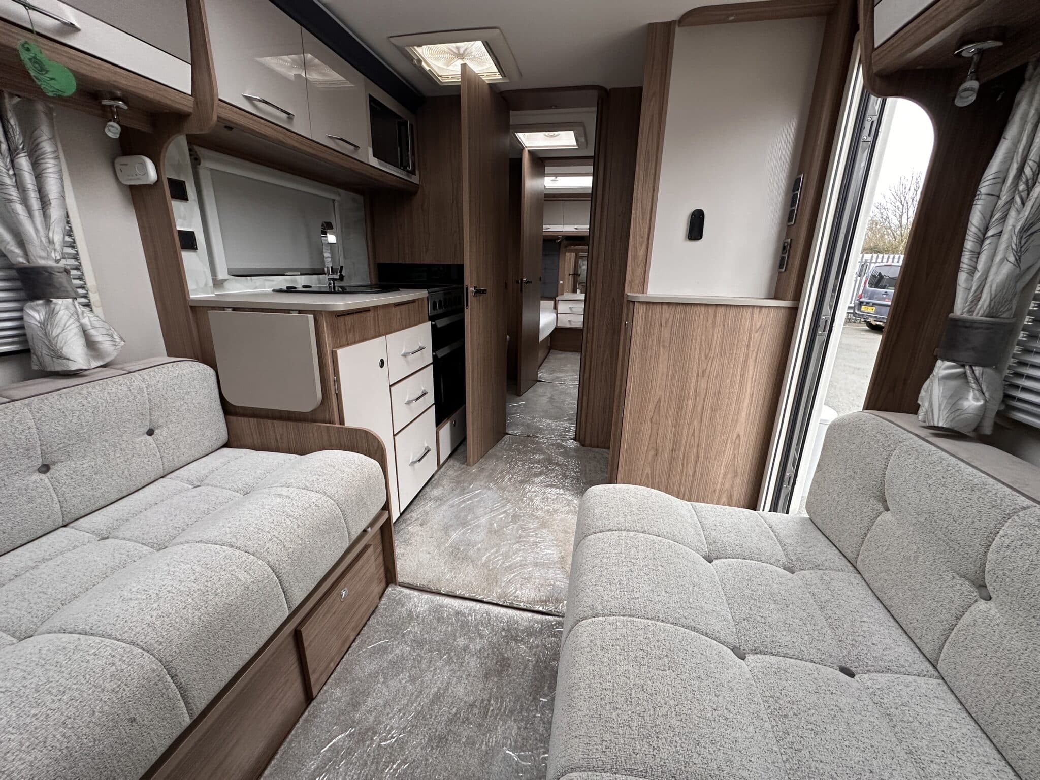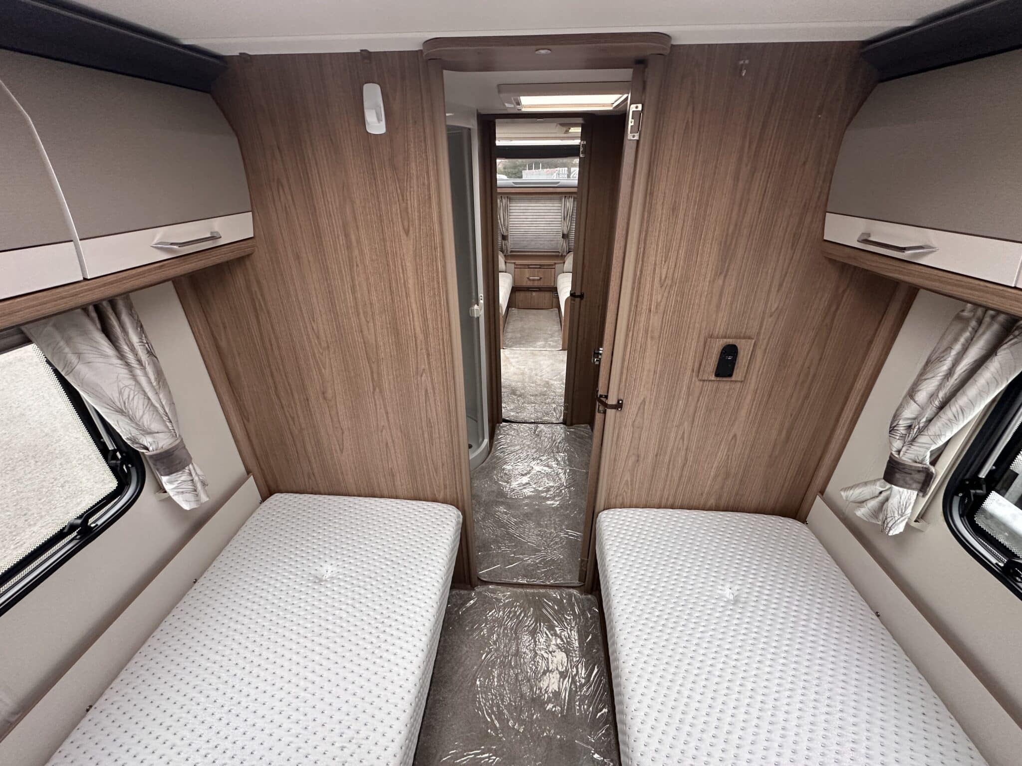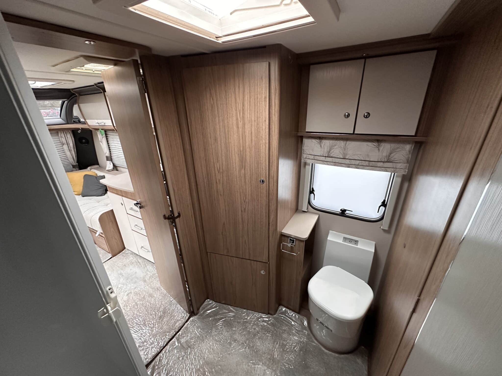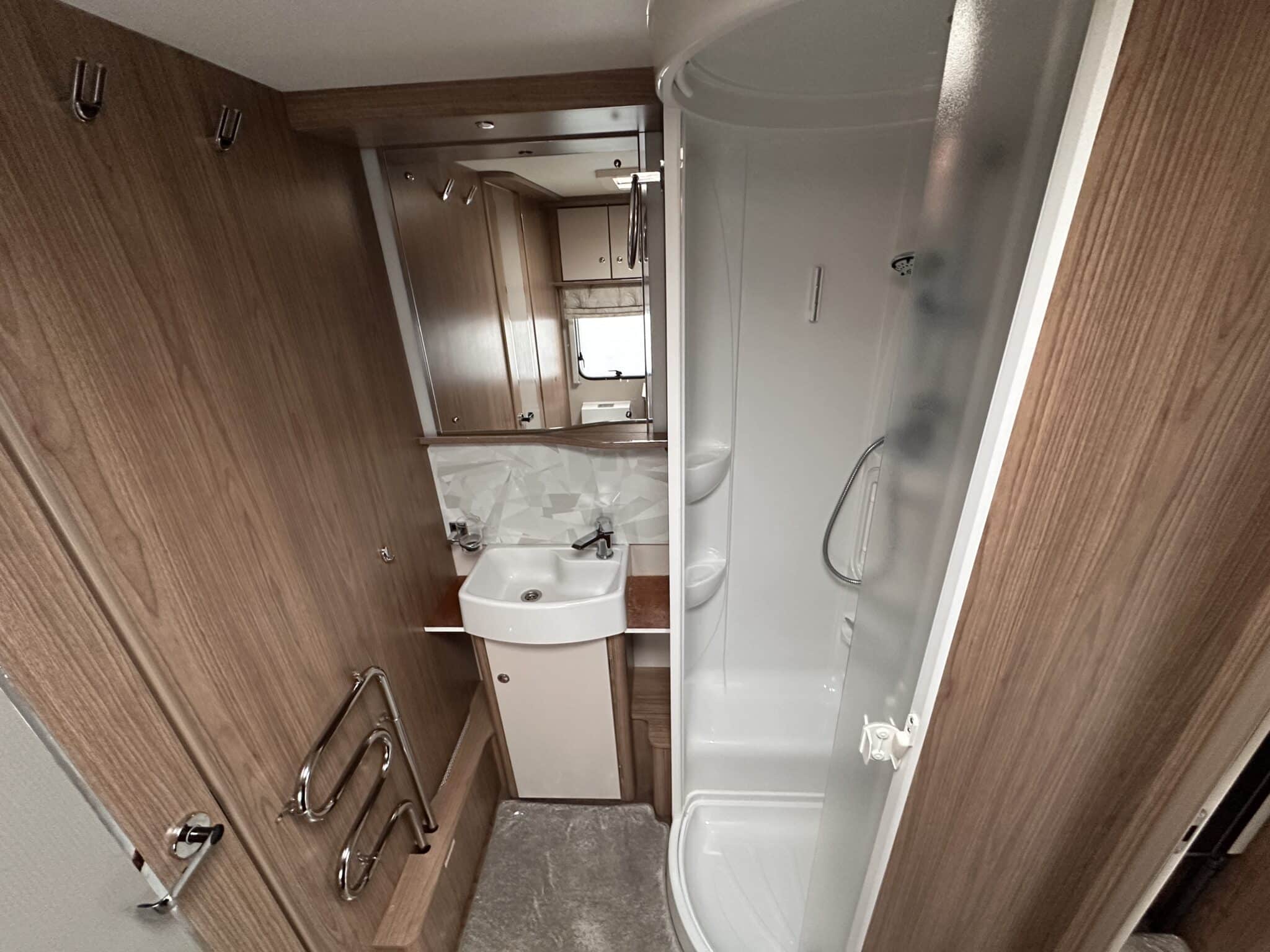 INTERIOR HIGHLIGHTSLounge The front lounge is generous in size, with comfortable seating that converts into a large double bed when needed. It’s a proper living space—not cramped—and the Pioneer stereo with Bluetooth and speakers in both the lounge and bedroom means you can have music wherever you are in the caravan.Kitchen The kitchen is well set up for longer trips. You get a dual-fuel hob (3 gas burners and 1 electric hotplate), a separate oven and grill, a microwave, and a Dometic 10-series tower fridge-freezer that can be opened from either side—a genuinely useful feature in a busy kitchen.Bedroom The rear bedroom has two fixed single beds, each 6ft 3in long—proper full-length beds, not the short ones you sometimes find in caravans. There’s good storage around them too, with wardrobes and overhead lockers keeping things tidy.Washroom The central washroom is one of the standout features of the 665. It’s genuinely spacious, with a fully-lined separate shower cubicle, vanity sink, and toilet. It also includes a heated towel rail, courtesy of the Alde heating system—a nice touch that makes a real difference.Heating The Alde wet heating system is fitted throughout, providing quiet, consistent warmth in every part of the caravan. It also heats the towel rail in the washroom and provides hot water on demand—ideal for year-round touring.Water System An onboard 36-litre fresh water tank is included, giving you independence from site water points and making this caravan well suited to off-grid stays.