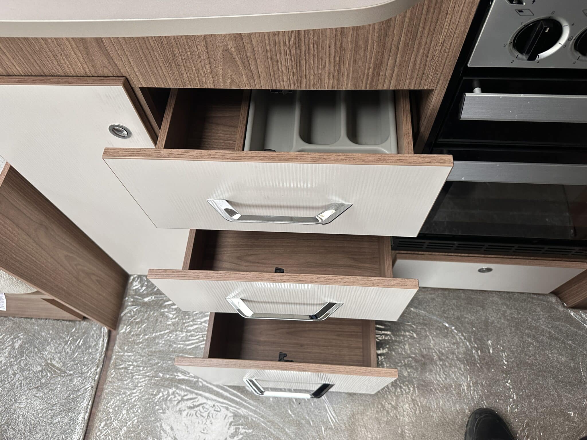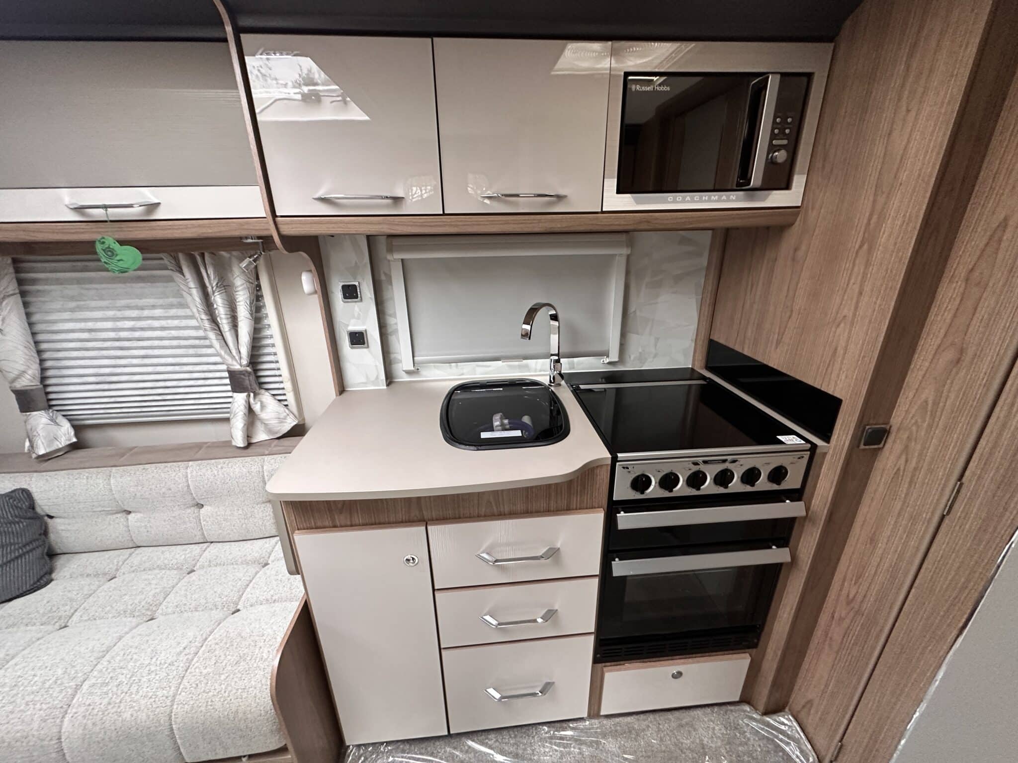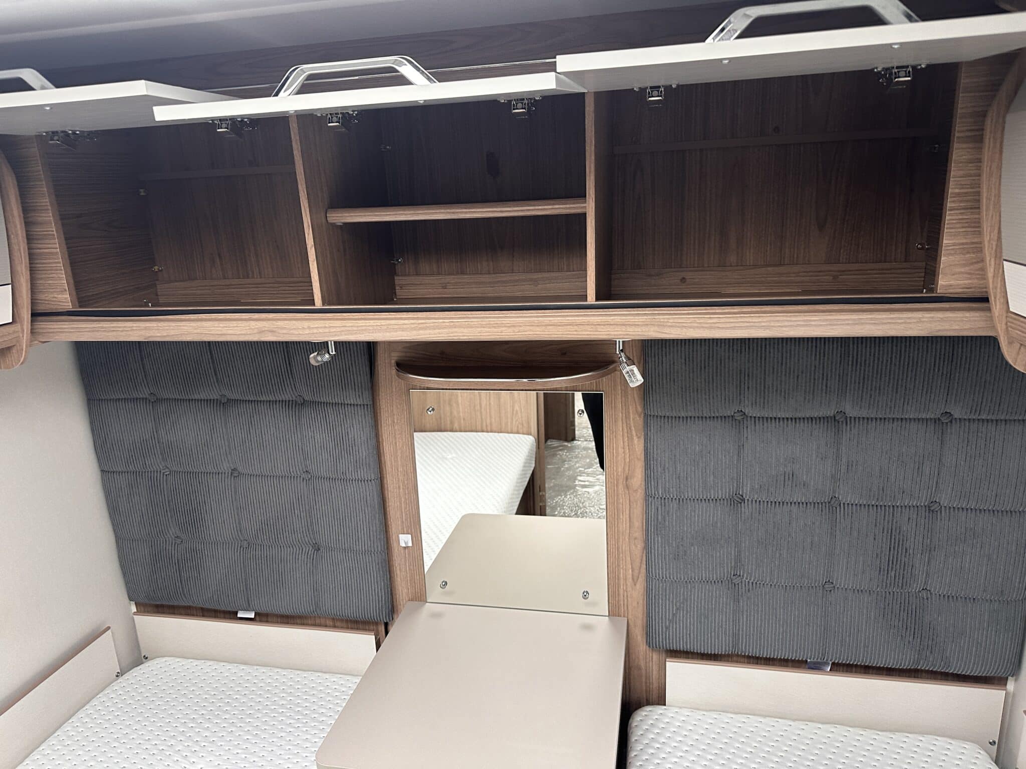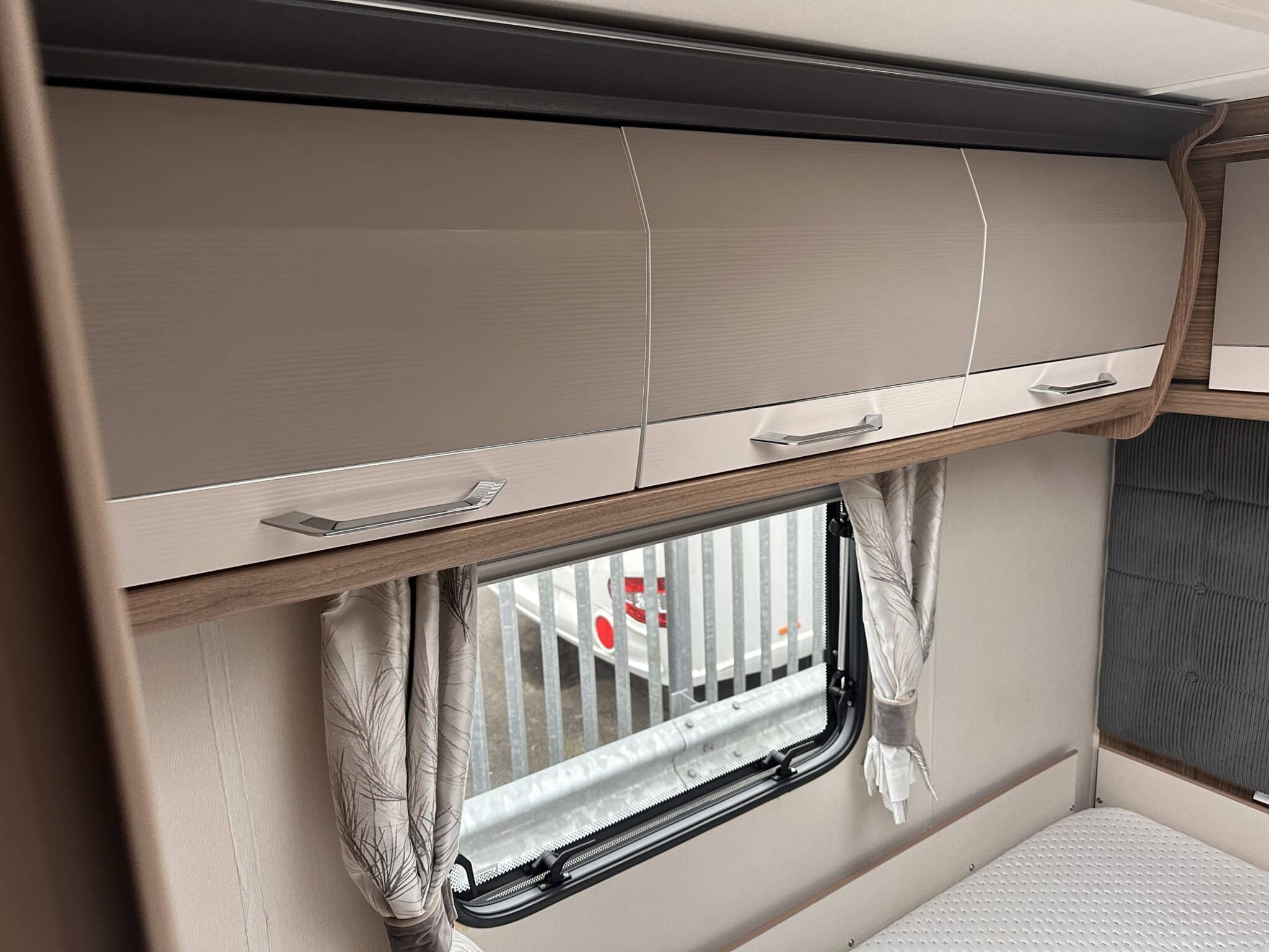 INTERIOR HIGHLIGHTSLounge The front lounge is generous in size, with comfortable seating that converts into a large double bed when needed. It’s a proper living space—not cramped—and the Pioneer stereo with Bluetooth and speakers in both the lounge and bedroom means you can have music wherever you are in the caravan.Kitchen The kitchen is well set up for longer trips. You get a dual-fuel hob (3 gas burners and 1 electric hotplate), a separate oven and grill, a microwave, and a Dometic 10-series tower fridge-freezer that can be opened from either side—a genuinely useful feature in a busy kitchen.Bedroom The rear bedroom has two fixed single beds, each 6ft 3in long—proper full-length beds, not the short ones you sometimes find in caravans. There’s good storage around them too, with wardrobes and overhead lockers keeping things tidy.Washroom The central washroom is one of the standout features of the 665. It’s genuinely spacious, with a fully-lined separate shower cubicle, vanity sink, and toilet. It also includes a heated towel rail, courtesy of the Alde heating system—a nice touch that makes a real difference.Heating The Alde wet heating system is fitted throughout, providing quiet, consistent warmth in every part of the caravan. It also heats the towel rail in the washroom and provides hot water on demand—ideal for year-round touring.Water System An onboard 36-litre fresh water tank is included, giving you independence from site water points and making this caravan well suited to off-grid stays.