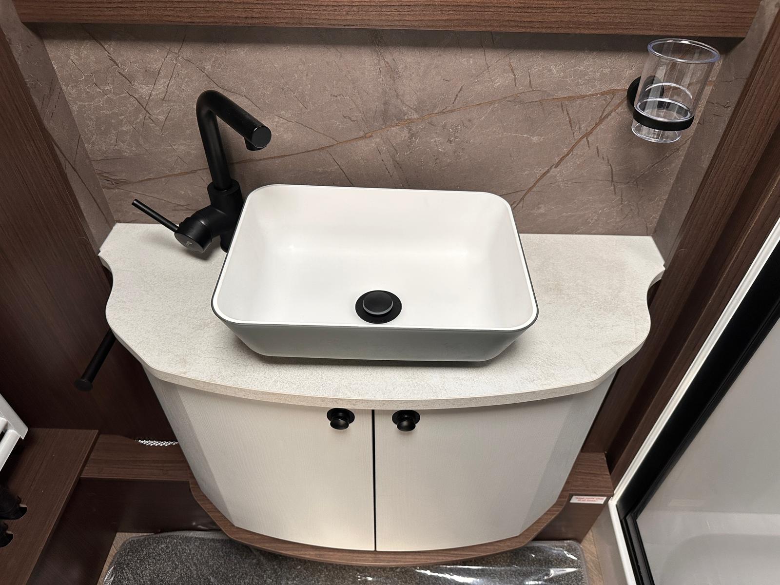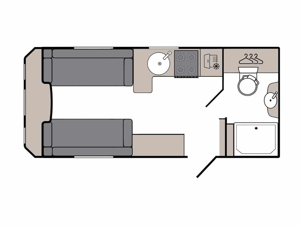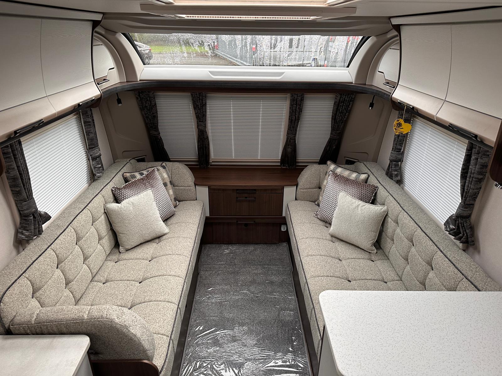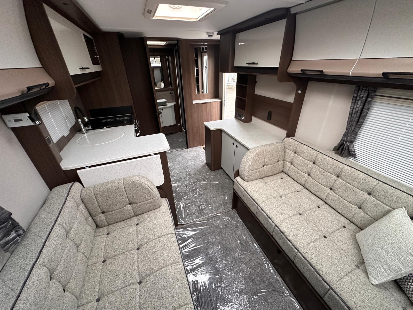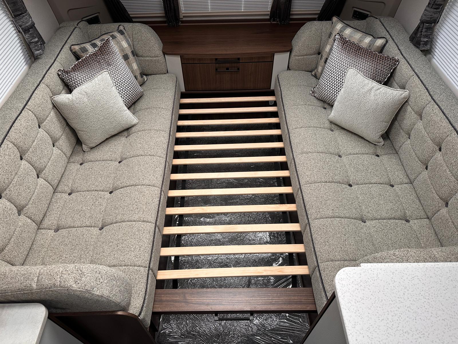 - An Impressive Layout: The brand-new layout features parallel front seating, which easily converts into a large double bed or two single beds for the night. In the middle, there is a central, well-equipped kitchen and a media wall, which leads back to a large, spacious end washroom.
