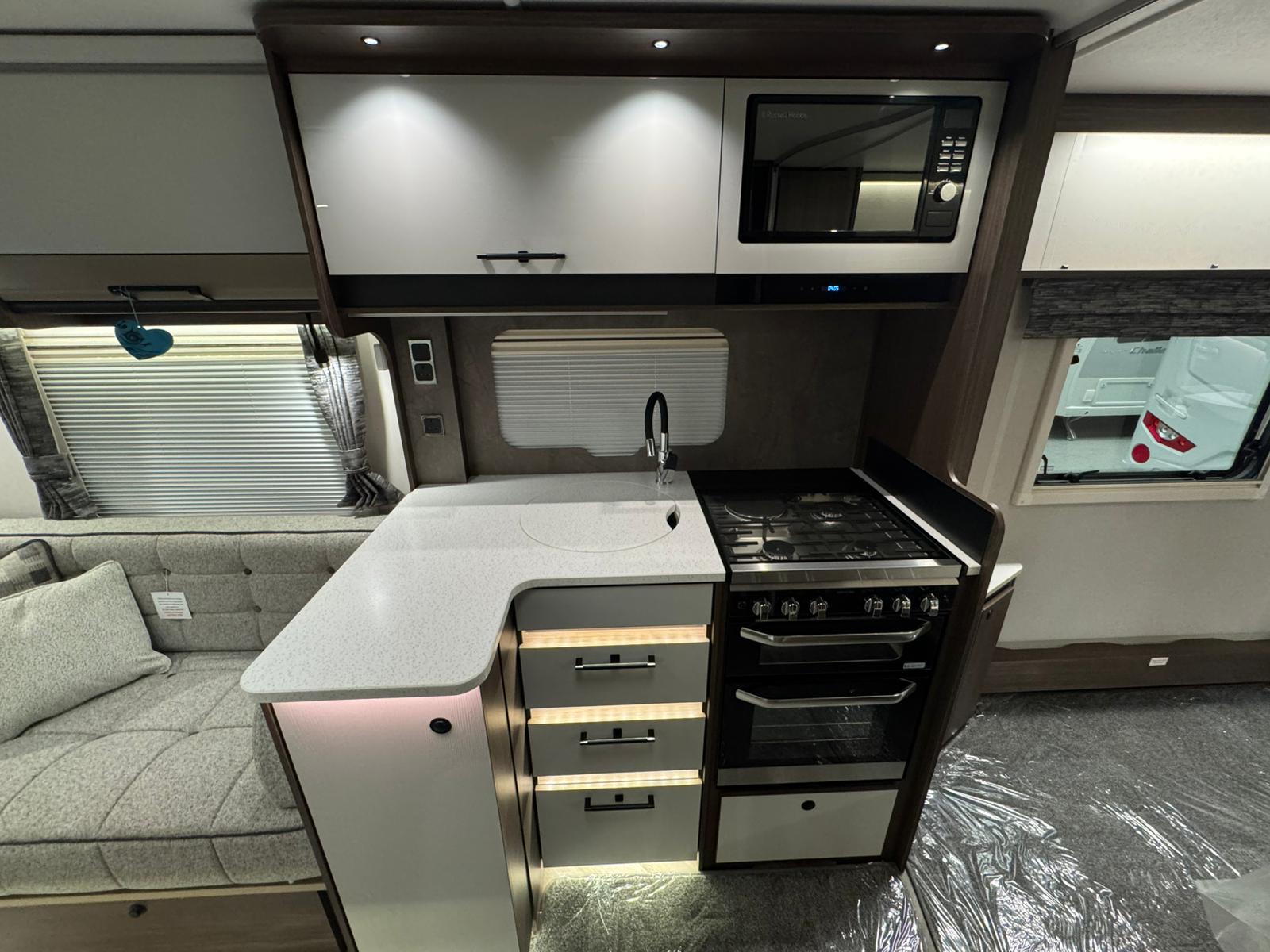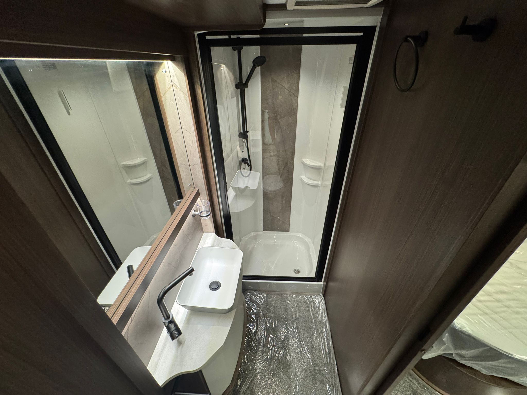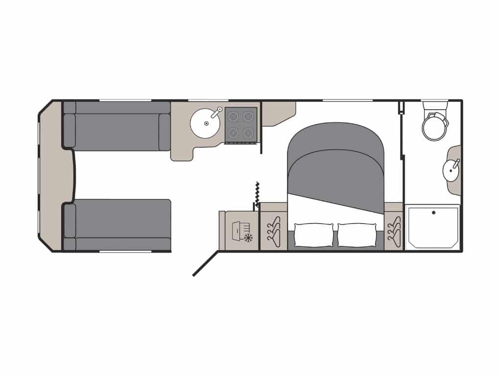 - An Impressive Layout: The front lounge provides a sociable and comfortable space, while a central, fully-equipped kitchen leads back to a private rear bedroom featuring a transverse island bed and a dedicated end washroom. The retractable bed gives you even more freedom to walk around during the day.