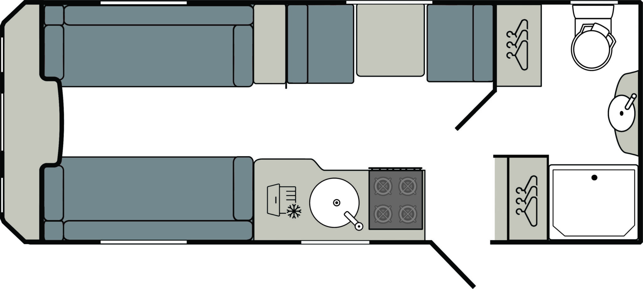 - Bed Sizes: Front Double 6′ 9″ x 5′ 8″ (2075 mm x 1720 mm) OR 2 x Front Singles 6′ 0 ” x 2′ 4″ (1845 mm x 730 mm) | Offside Middle Bunk 6′ 0″ x 2′ 4″ (1845 mm x 730 mm)