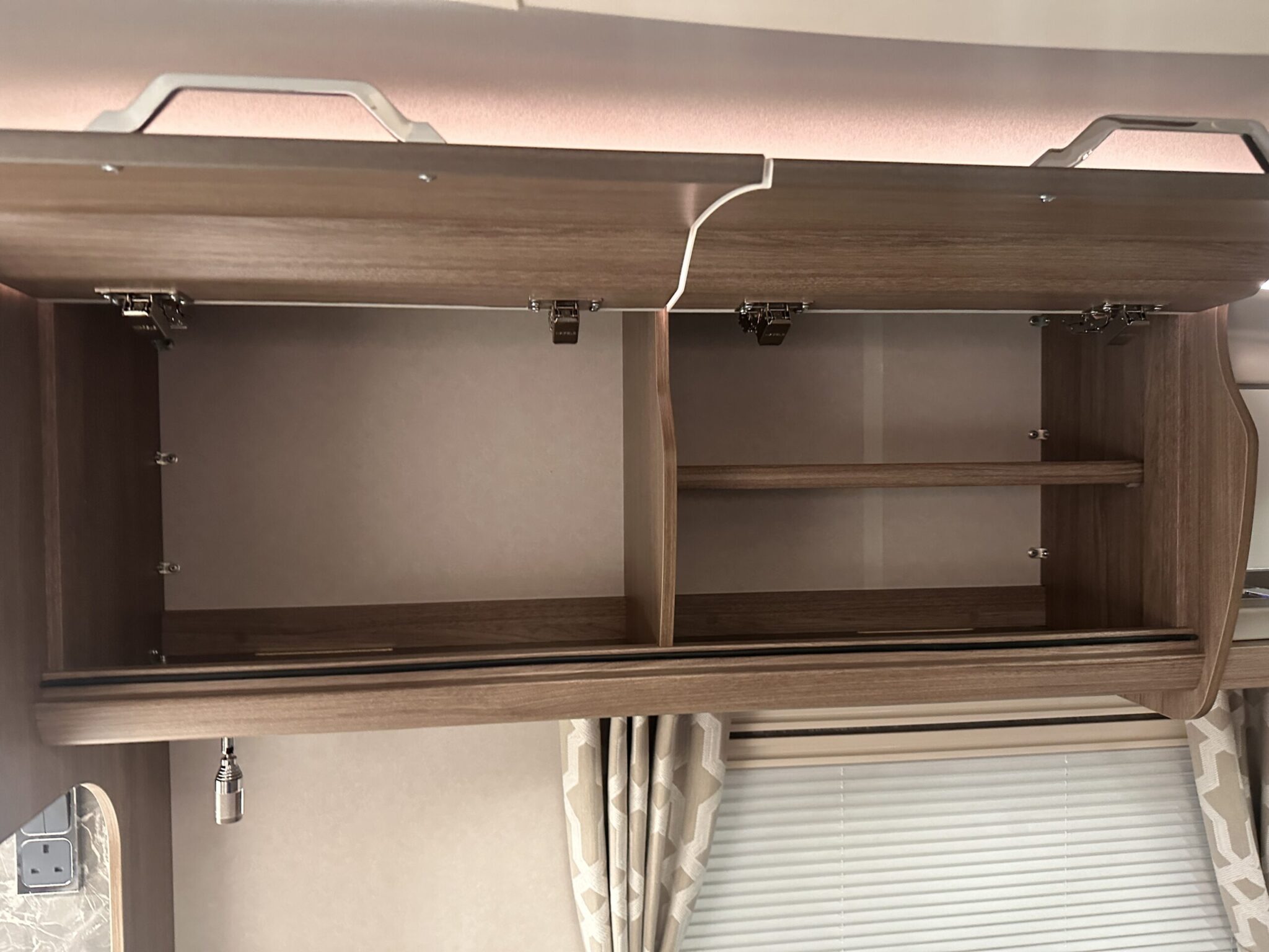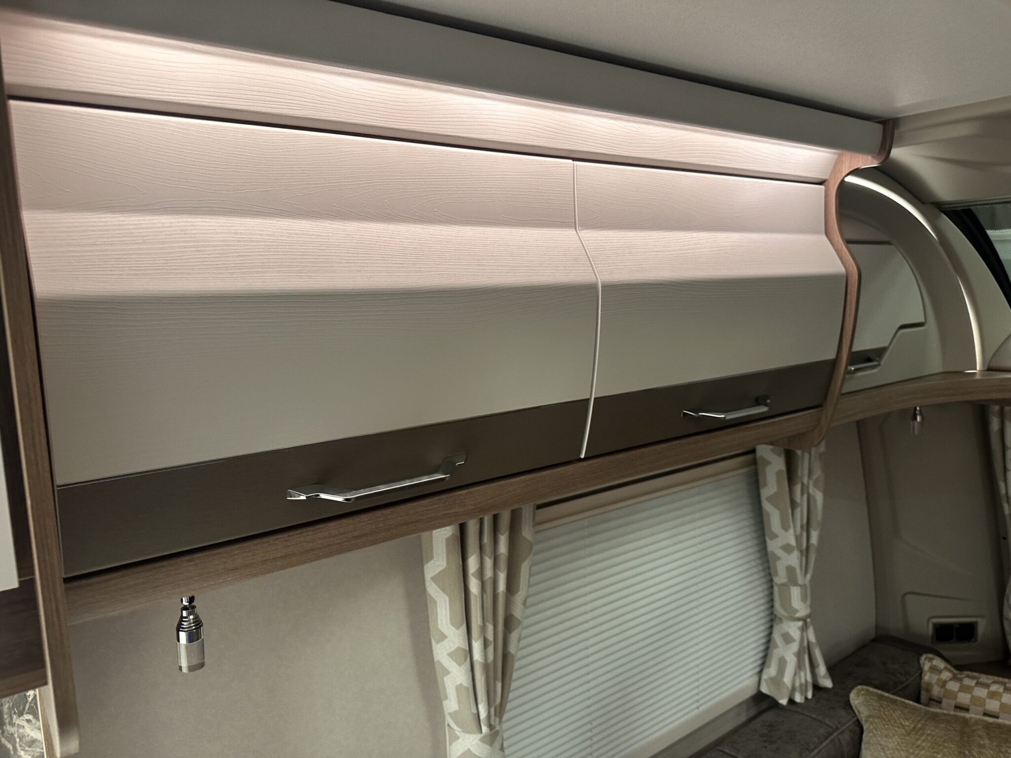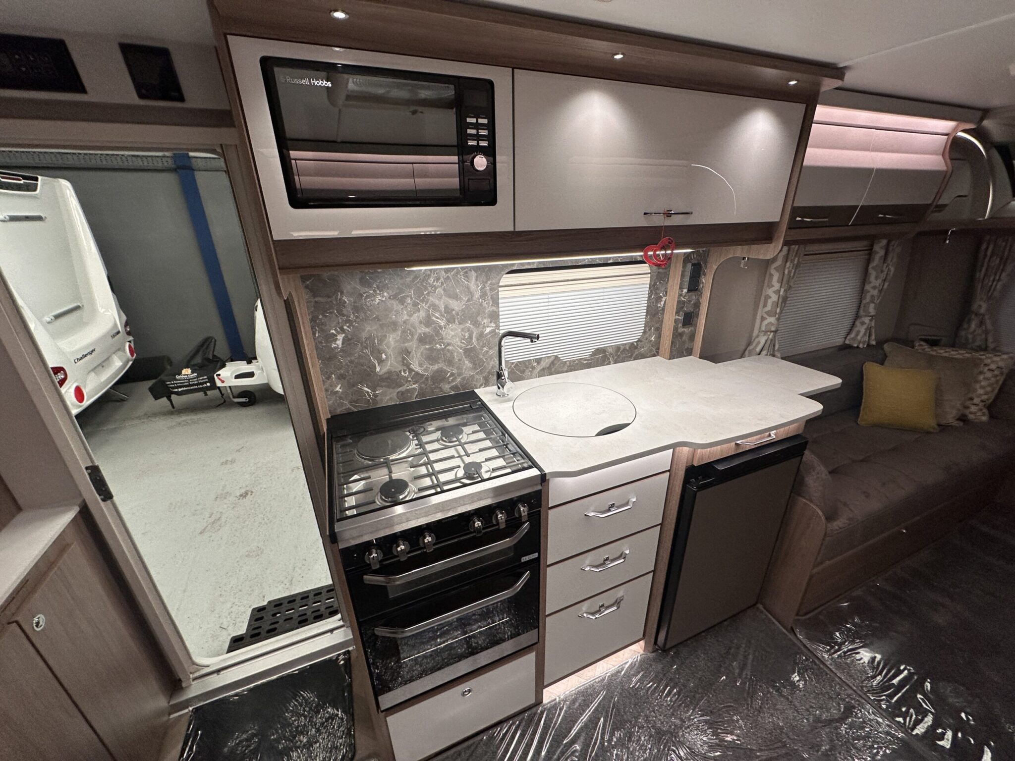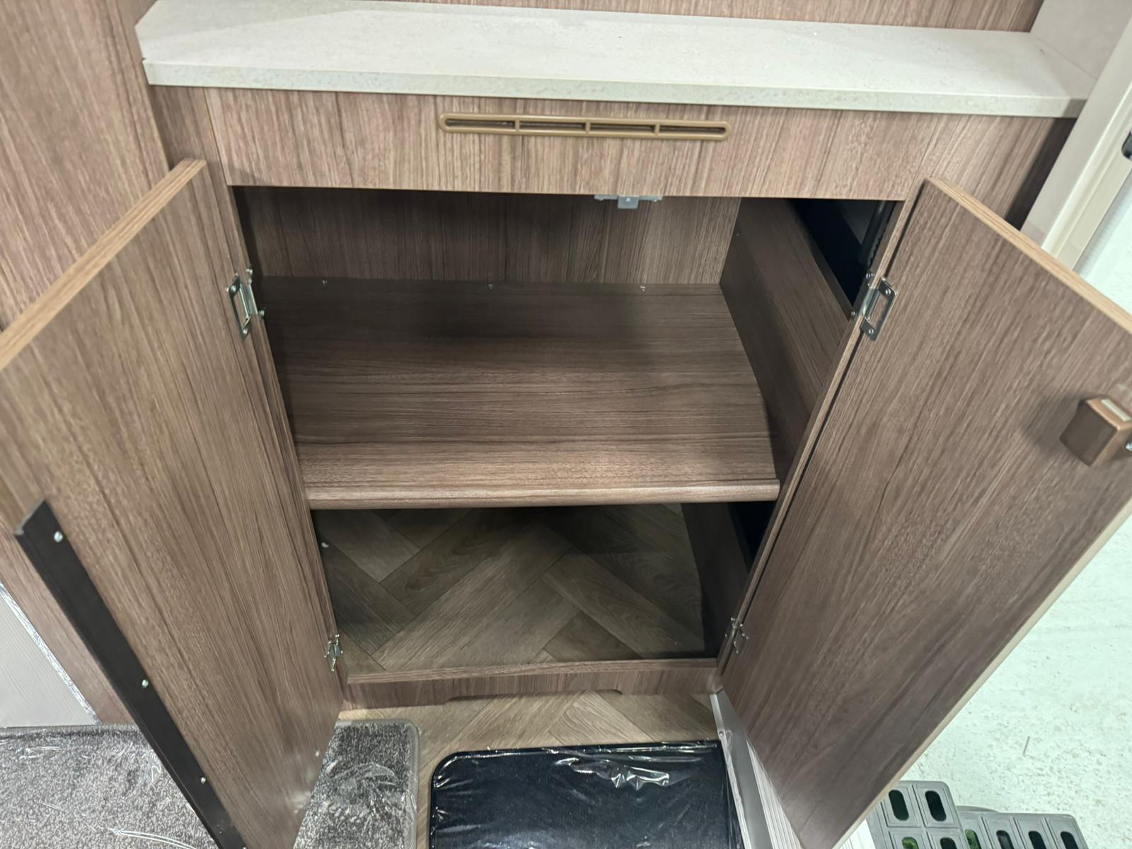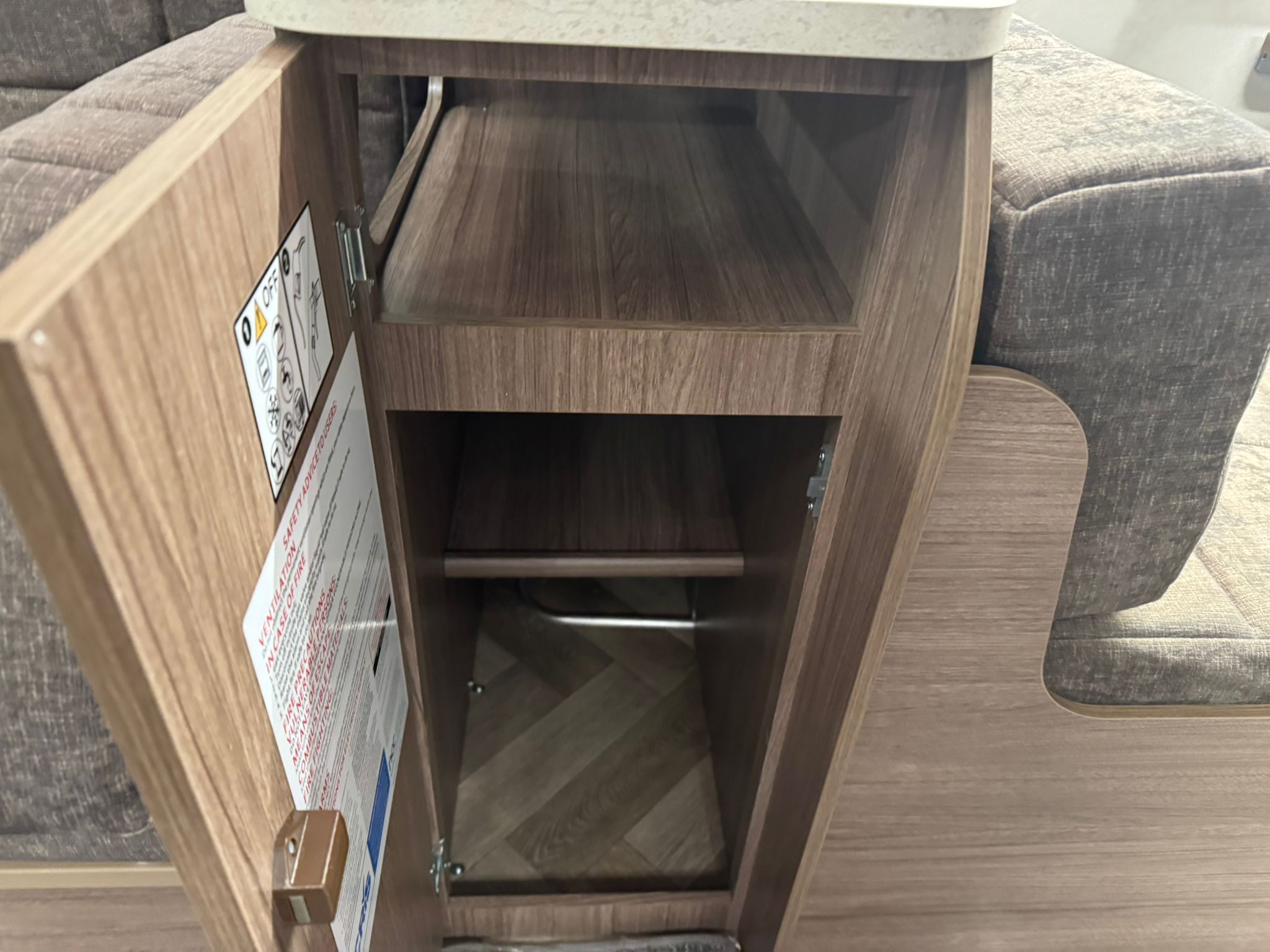 - Modern Kitchen: It’s great to have a fully equipped kitchen with a Thetford dual-fuel hob, oven, grill, and a 91-litre electronic fridge freezer. The NEW pull out Black wire baskets to lower kitchen cupboards are a smart addition.