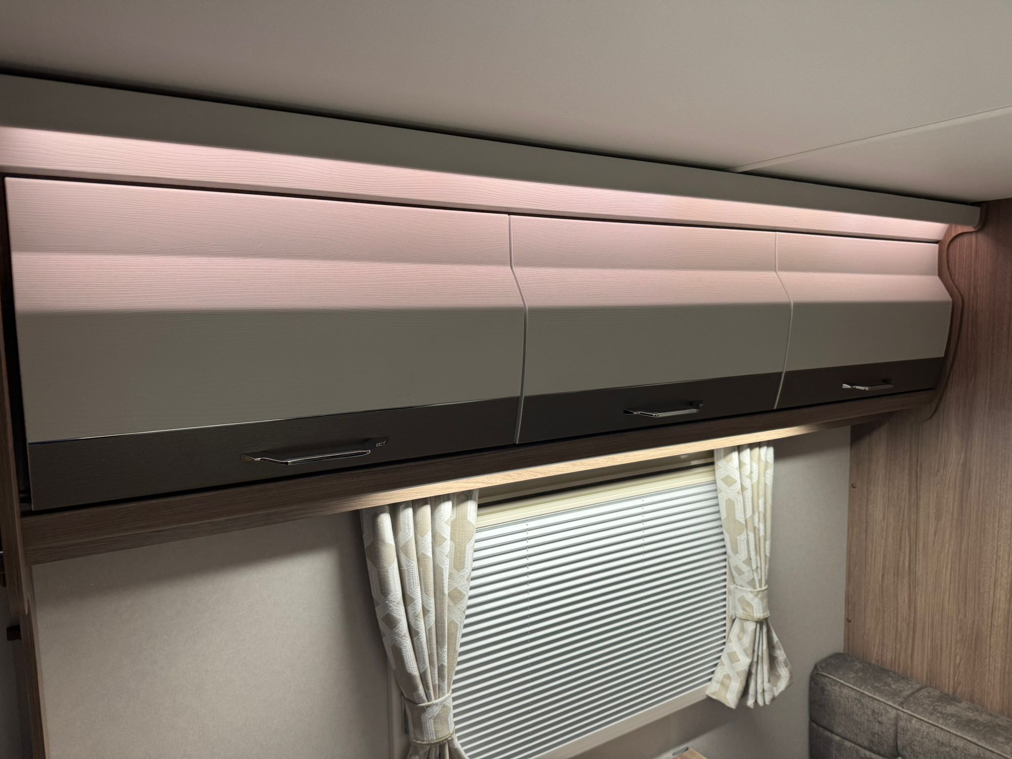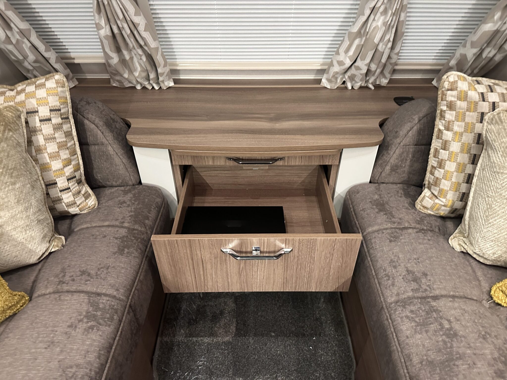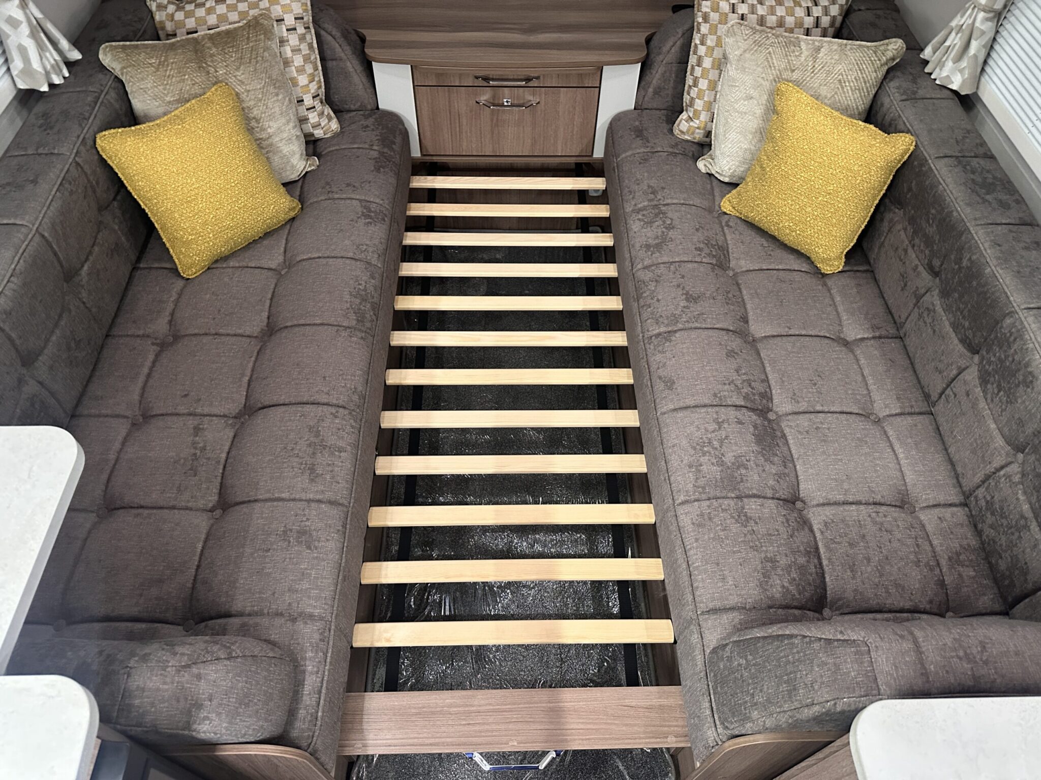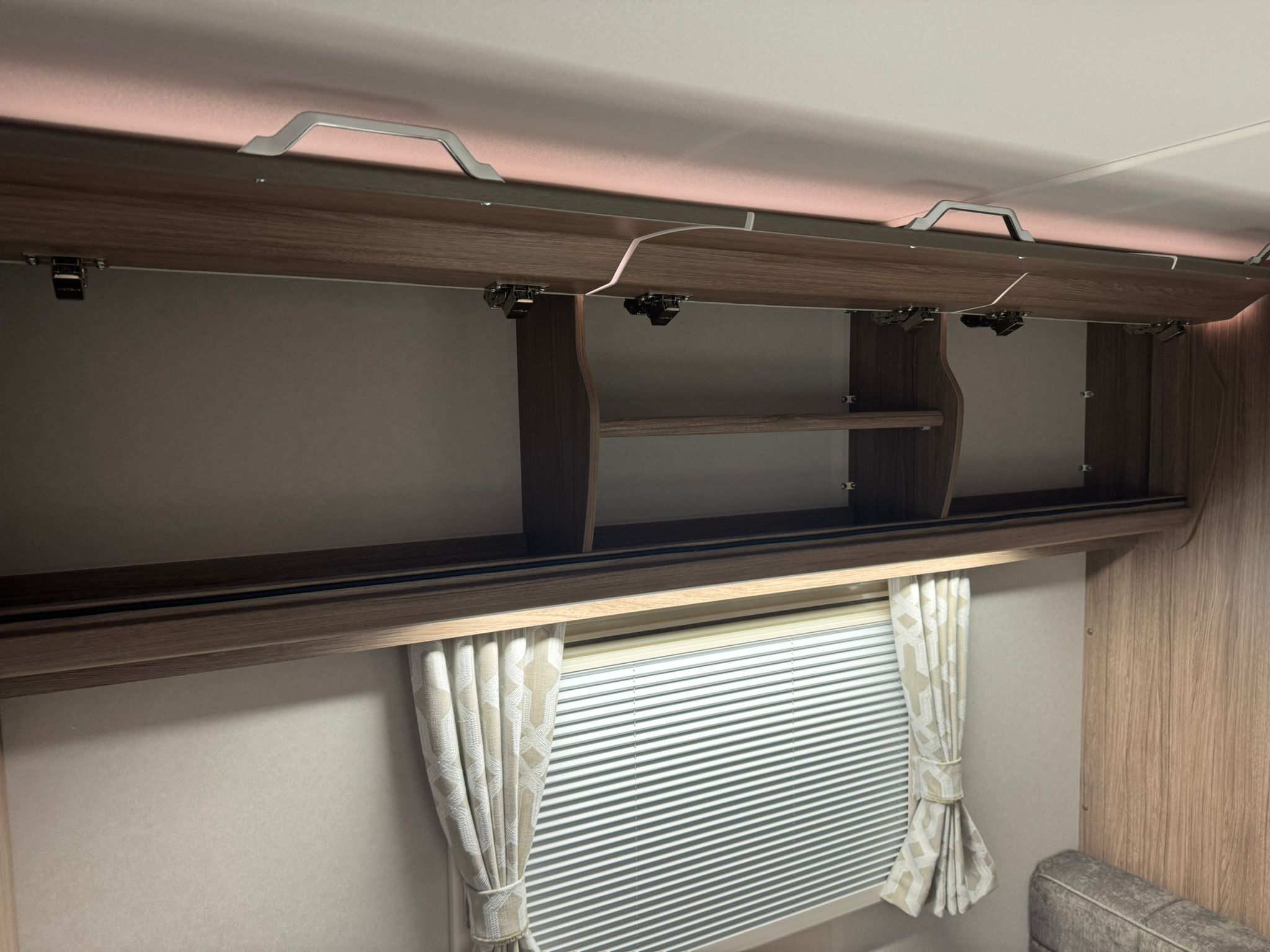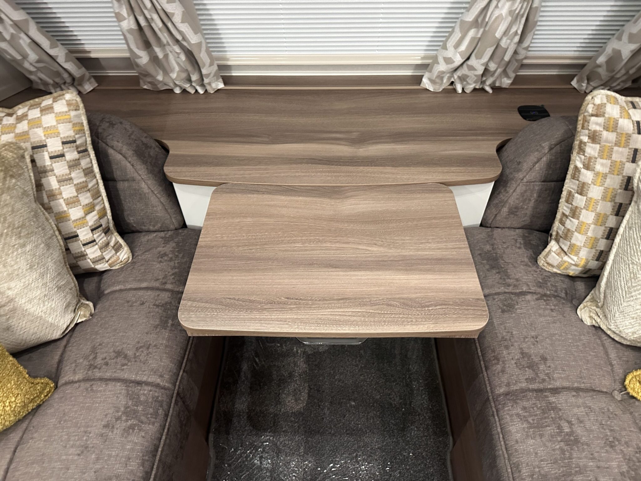 - Modern Kitchen: It’s great to have a fully equipped kitchen with a Thetford dual-fuel hob, oven, grill, and a 91-litre electronic fridge freezer. The NEW pull out Black wire baskets to lower kitchen cupboards are a smart addition.