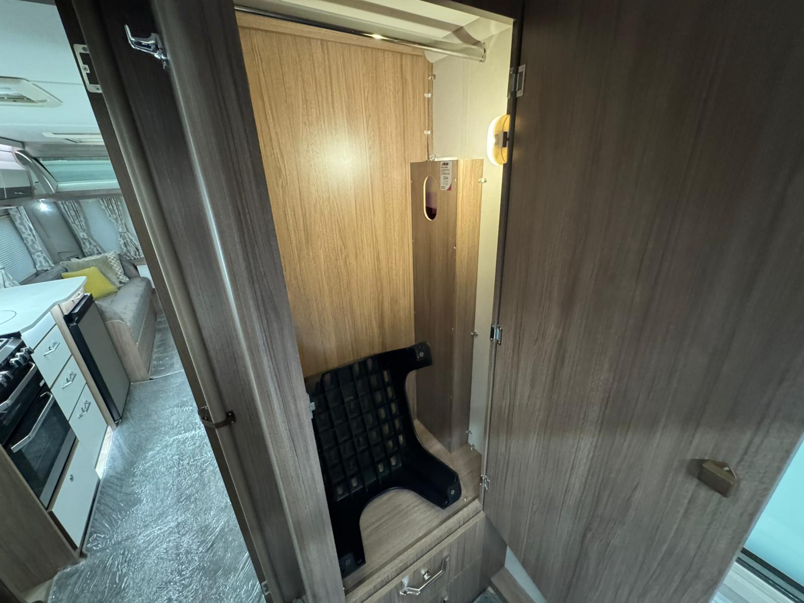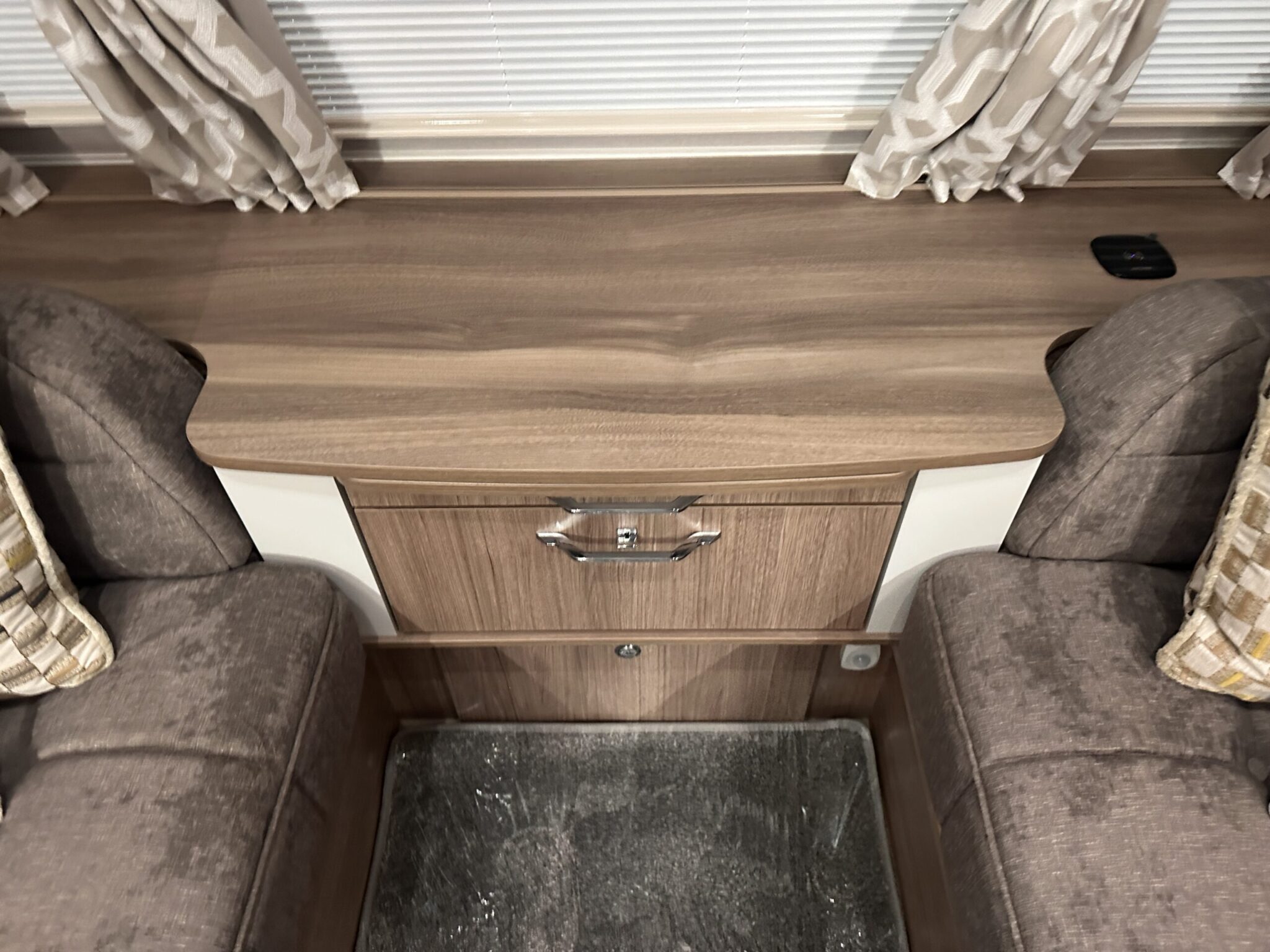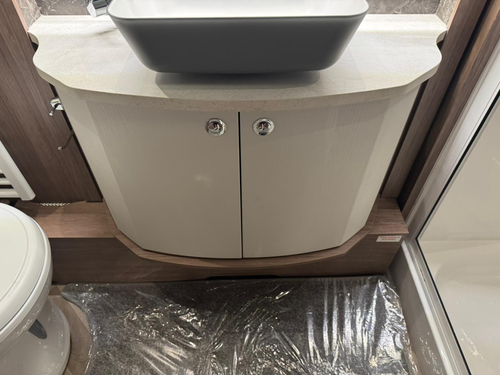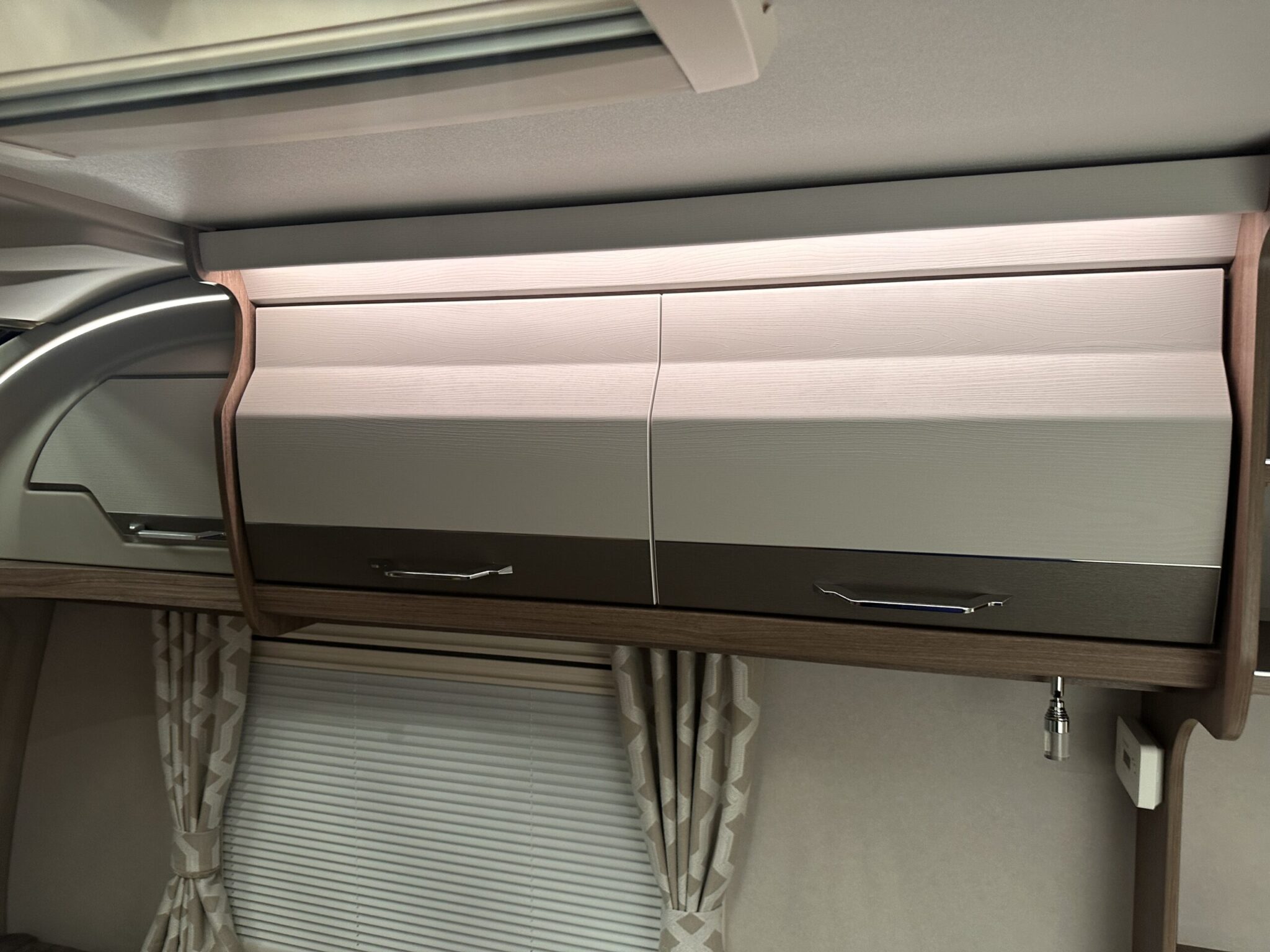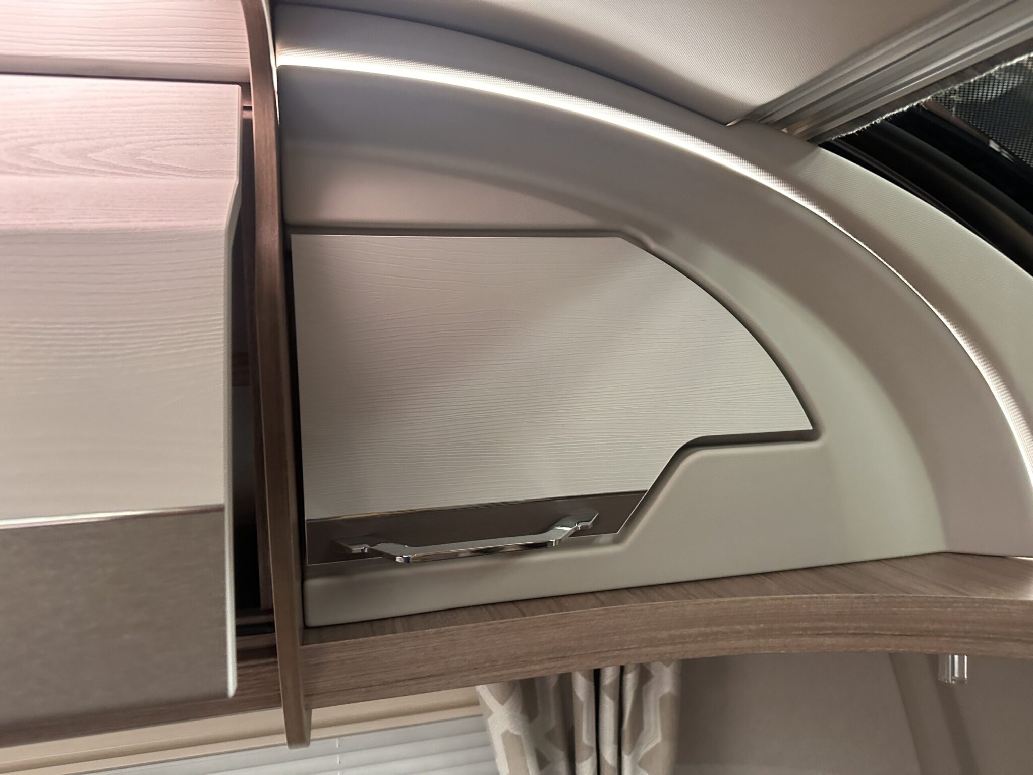 - Modern Kitchen: It’s great to have a fully equipped kitchen with a Thetford dual-fuel hob, oven, grill, and a 91-litre electronic fridge freezer. The NEW pull out Black wire baskets to lower kitchen cupboards are a smart addition.
