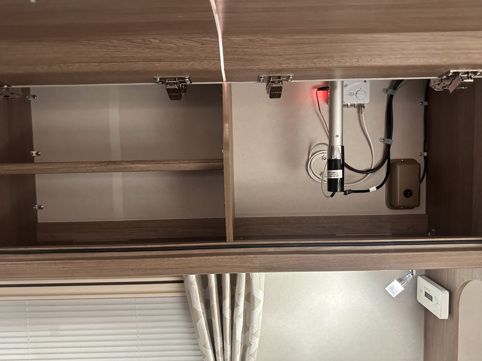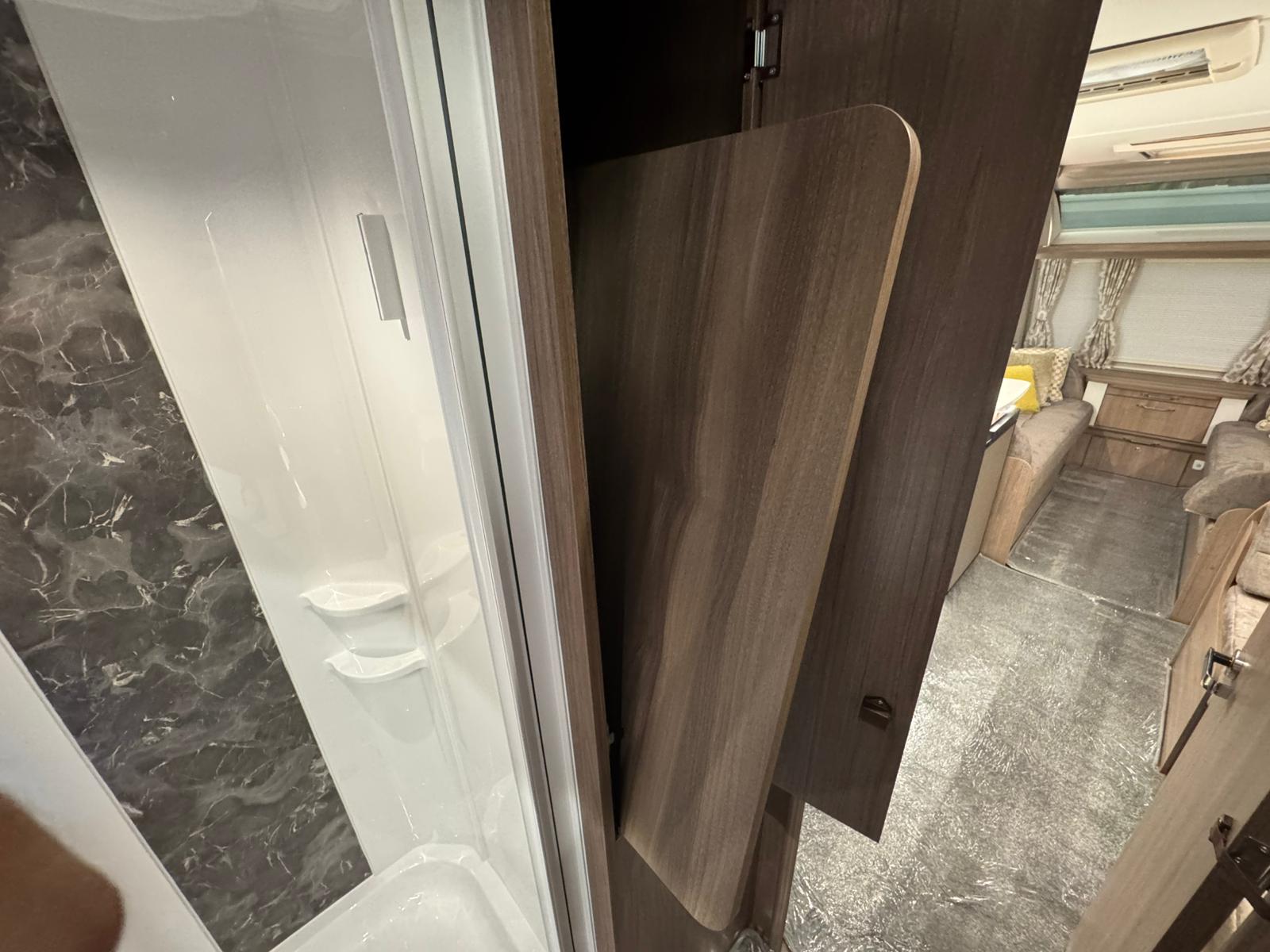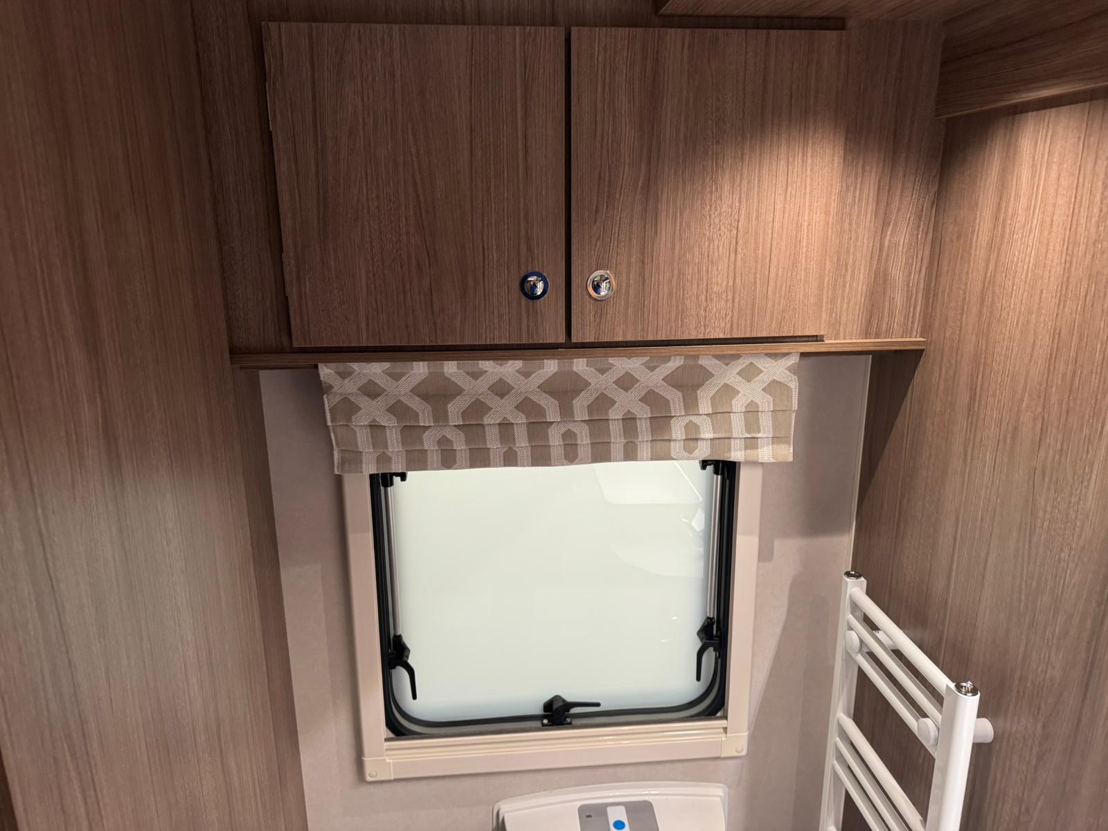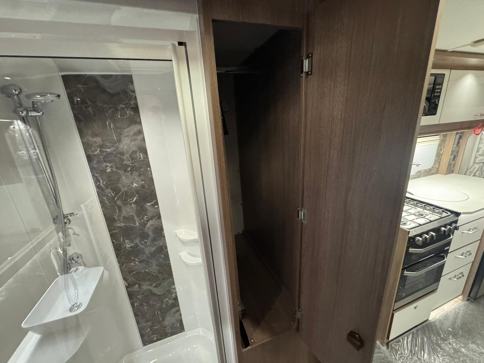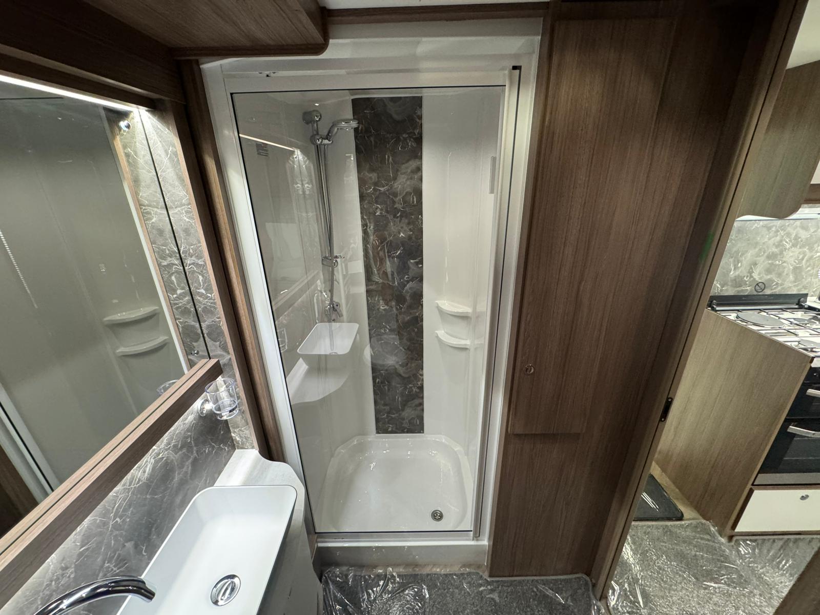 - Modern Kitchen: It’s great to have a fully equipped kitchen with a Thetford dual-fuel hob, oven, grill, and a 91-litre electronic fridge freezer. The NEW pull out Black wire baskets to lower kitchen cupboards are a smart addition.