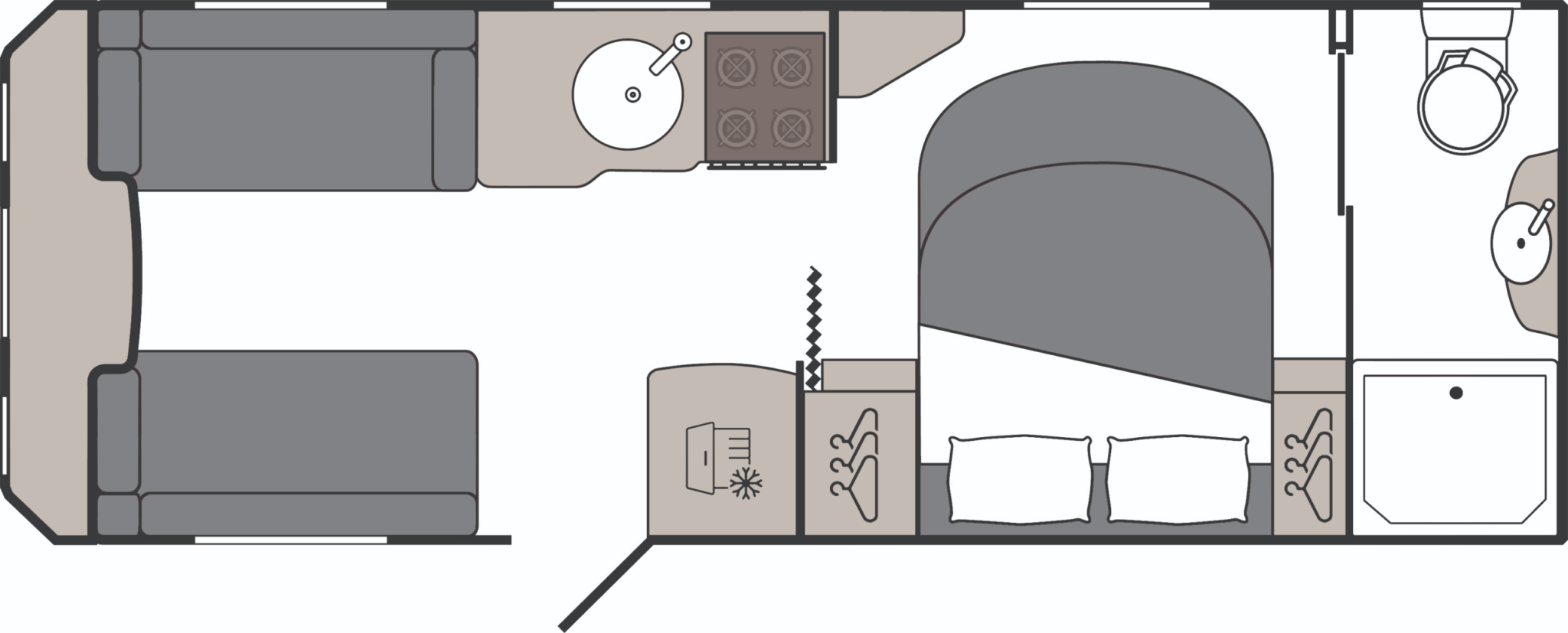 End Washroom: The full-width rear washroom feels spacious and modern. It includes a separate lined shower cubicle, a cassette toilet, and a stylish ‘Pebble’ design curved vanity unit.