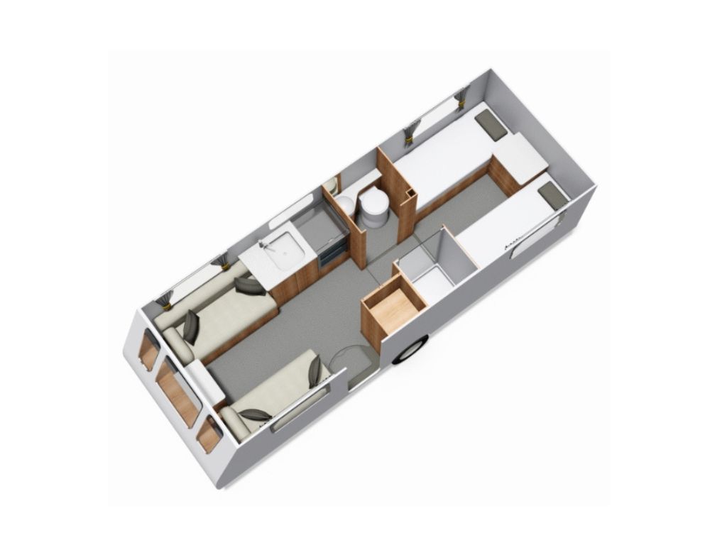 1. What is the bed layout? This model features the highly requested twin fixed single beds layout at the rear alongside a centre washroom. The front lounge area also quickly converts into a second comfortable double bed for guests.