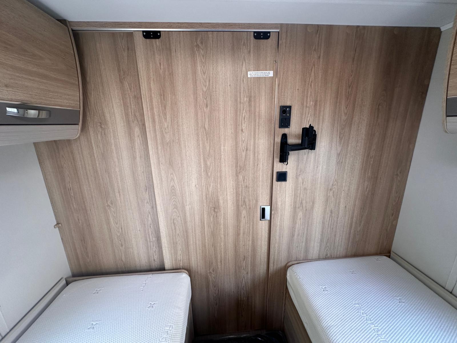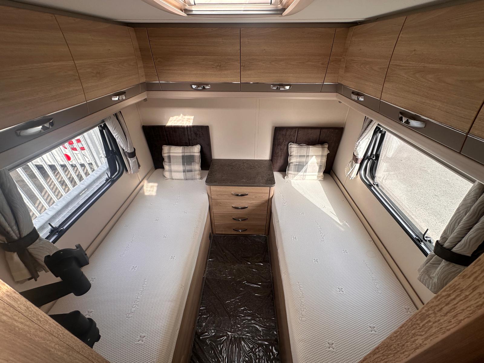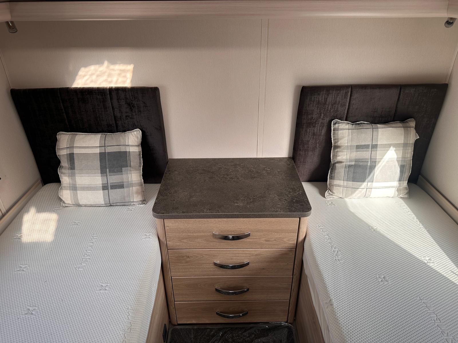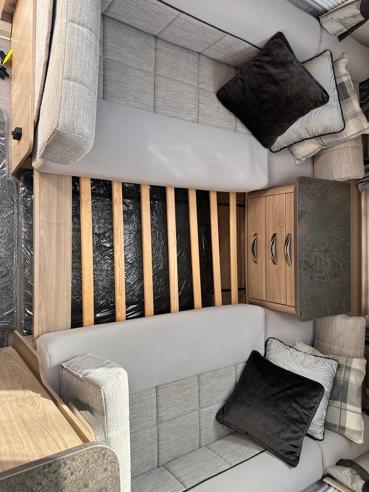 Bedroom: Features a dedicated rear bedroom with two fixed single beds, complete with headboards. The beds lift to provide excellent under-bed storage access.