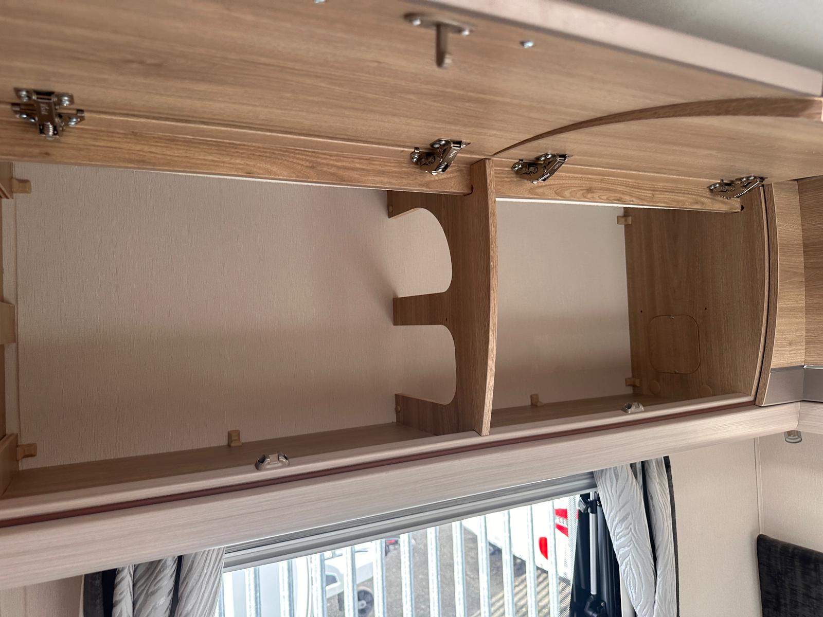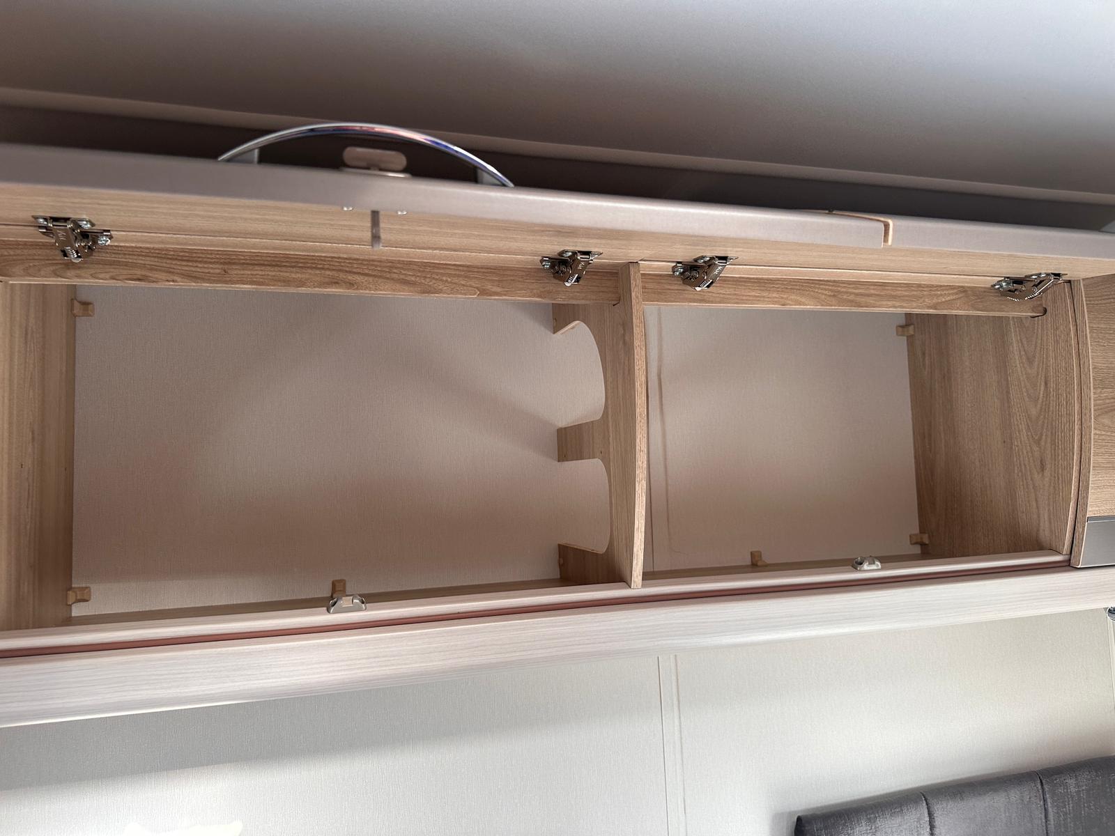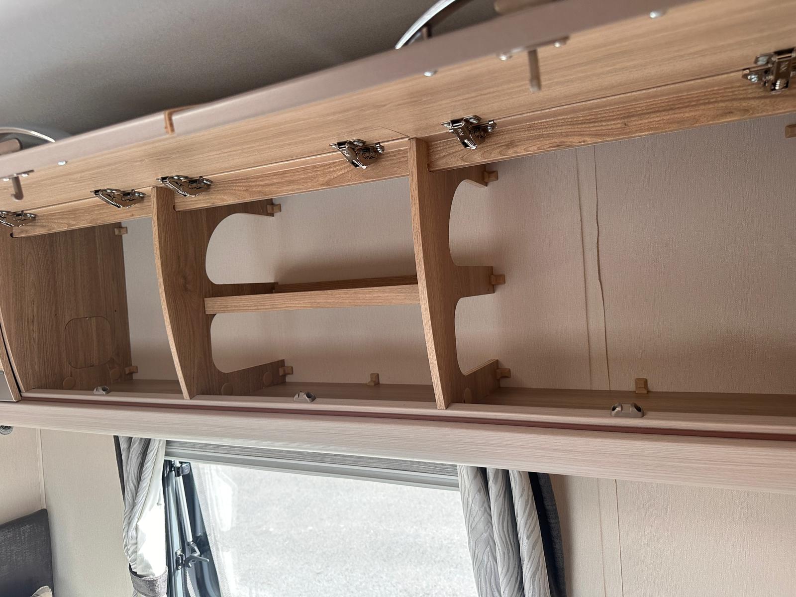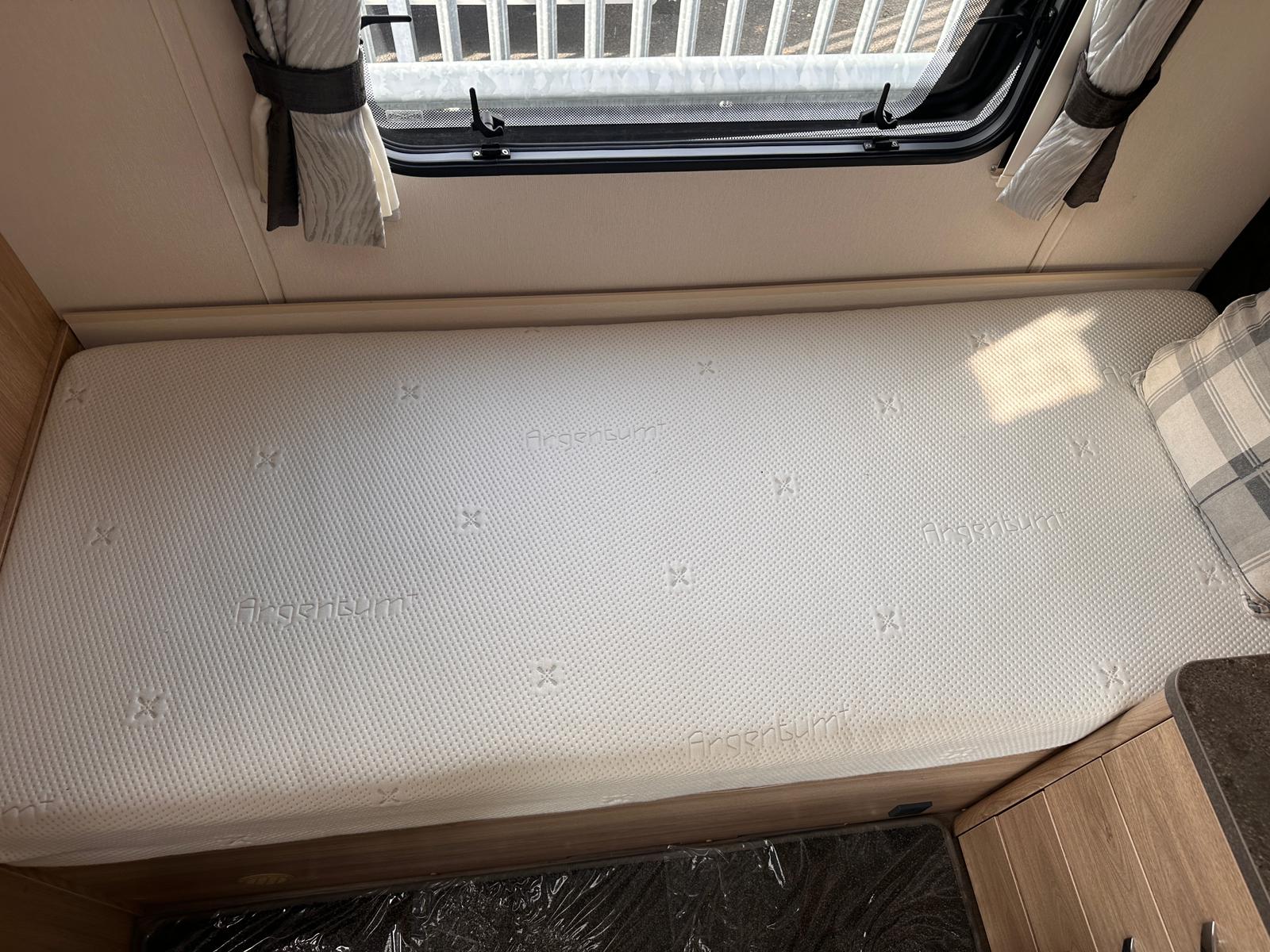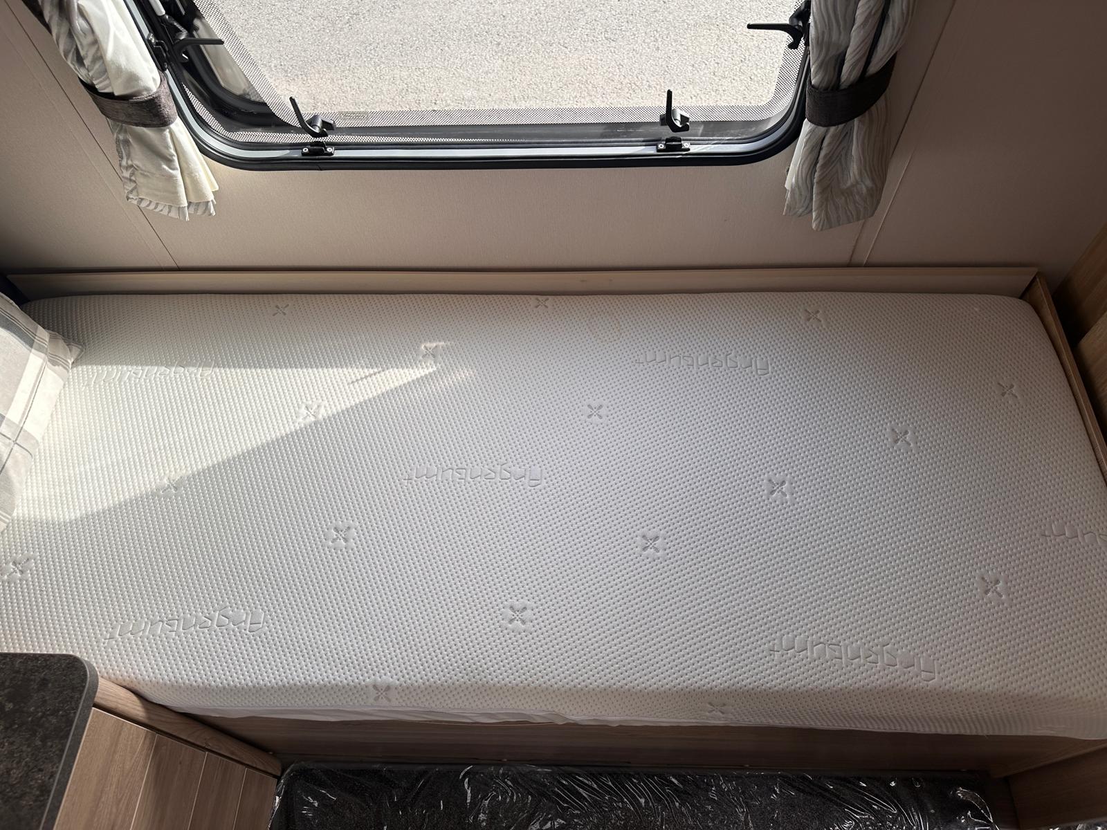 Bedroom: Features a dedicated rear bedroom with two fixed single beds, complete with headboards. The beds lift to provide excellent under-bed storage access.