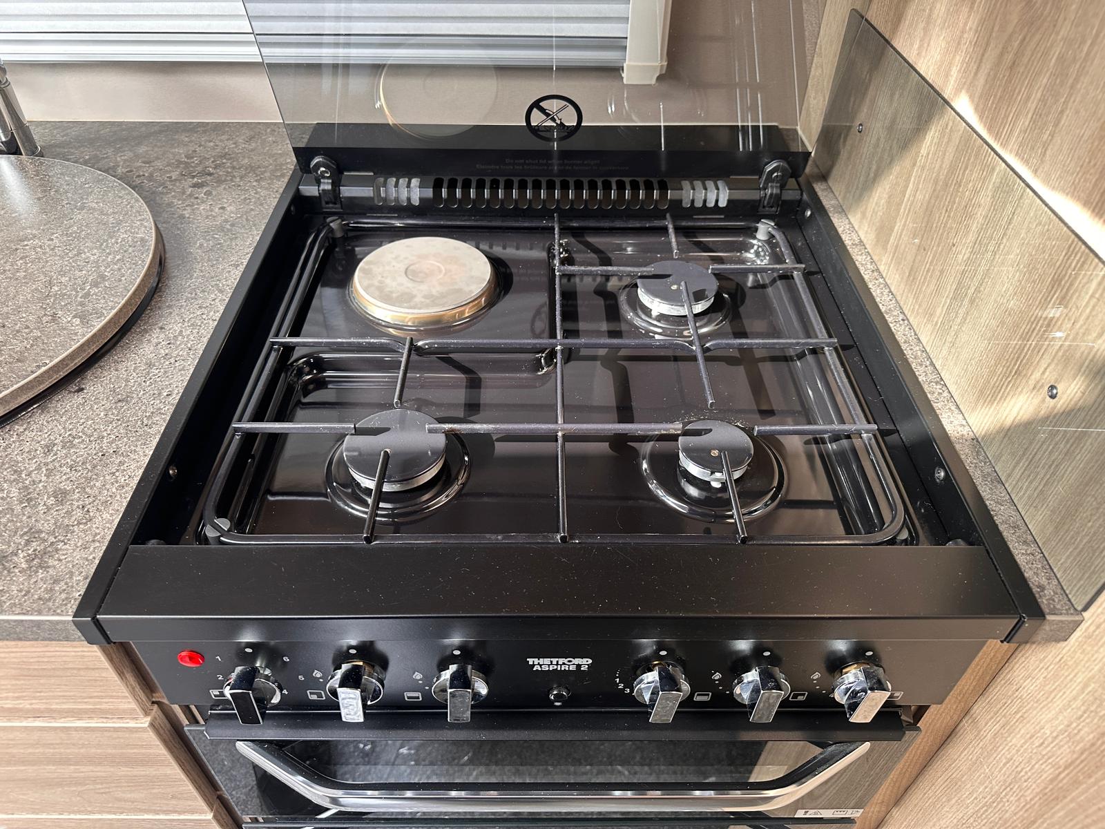 Kitchen: Fully equipped for all your cooking needs with a three-burner gas hob, an electric hot plate, a separate grill and oven, a microwave, and a Dometic fridge-freezer.