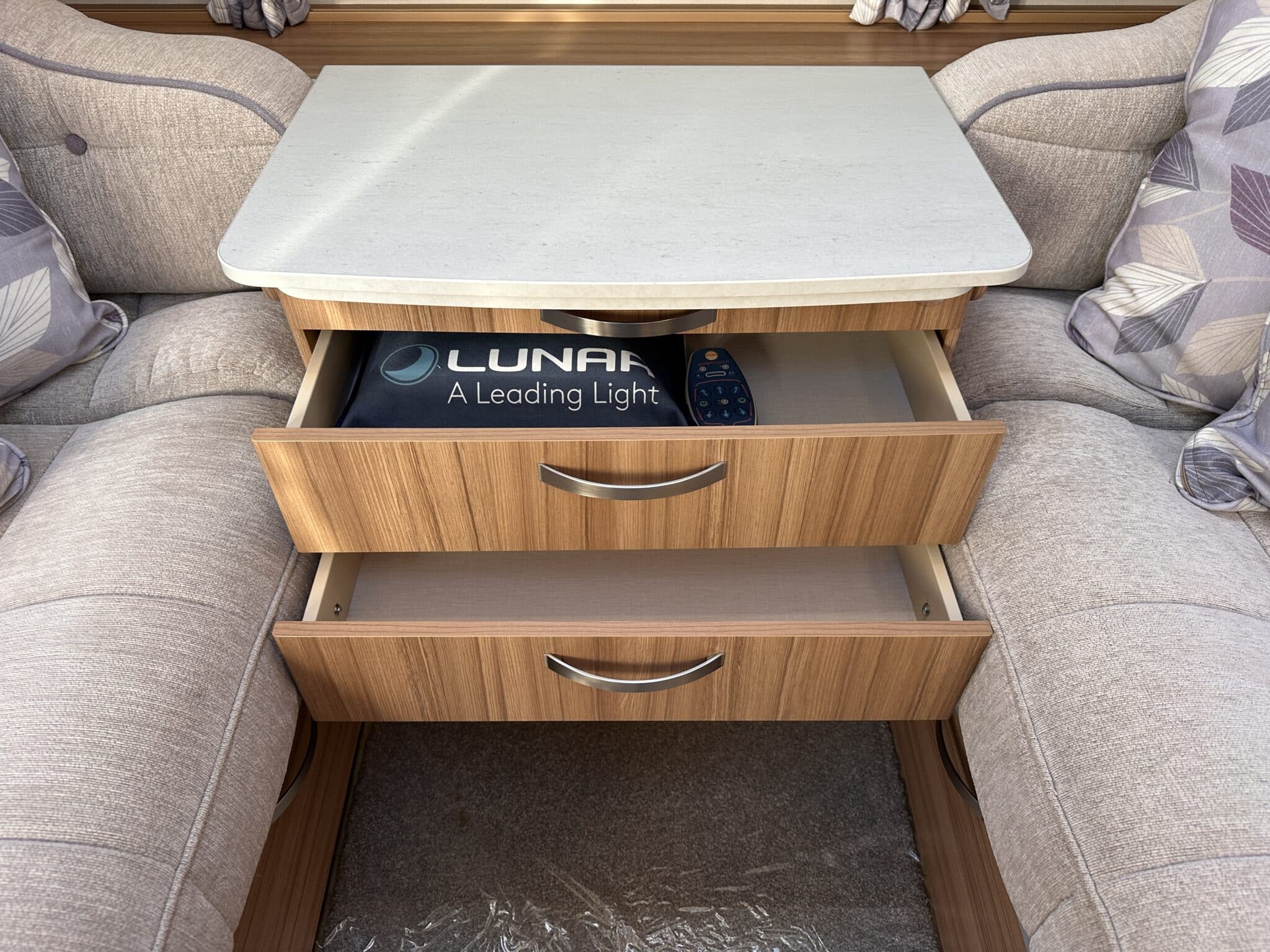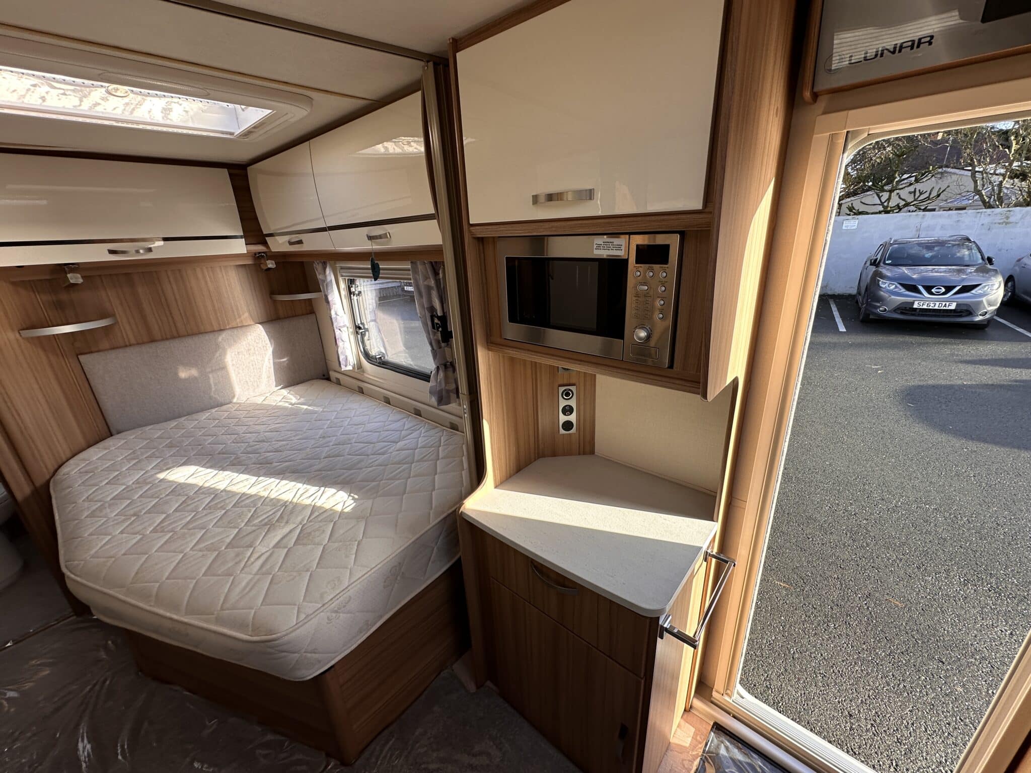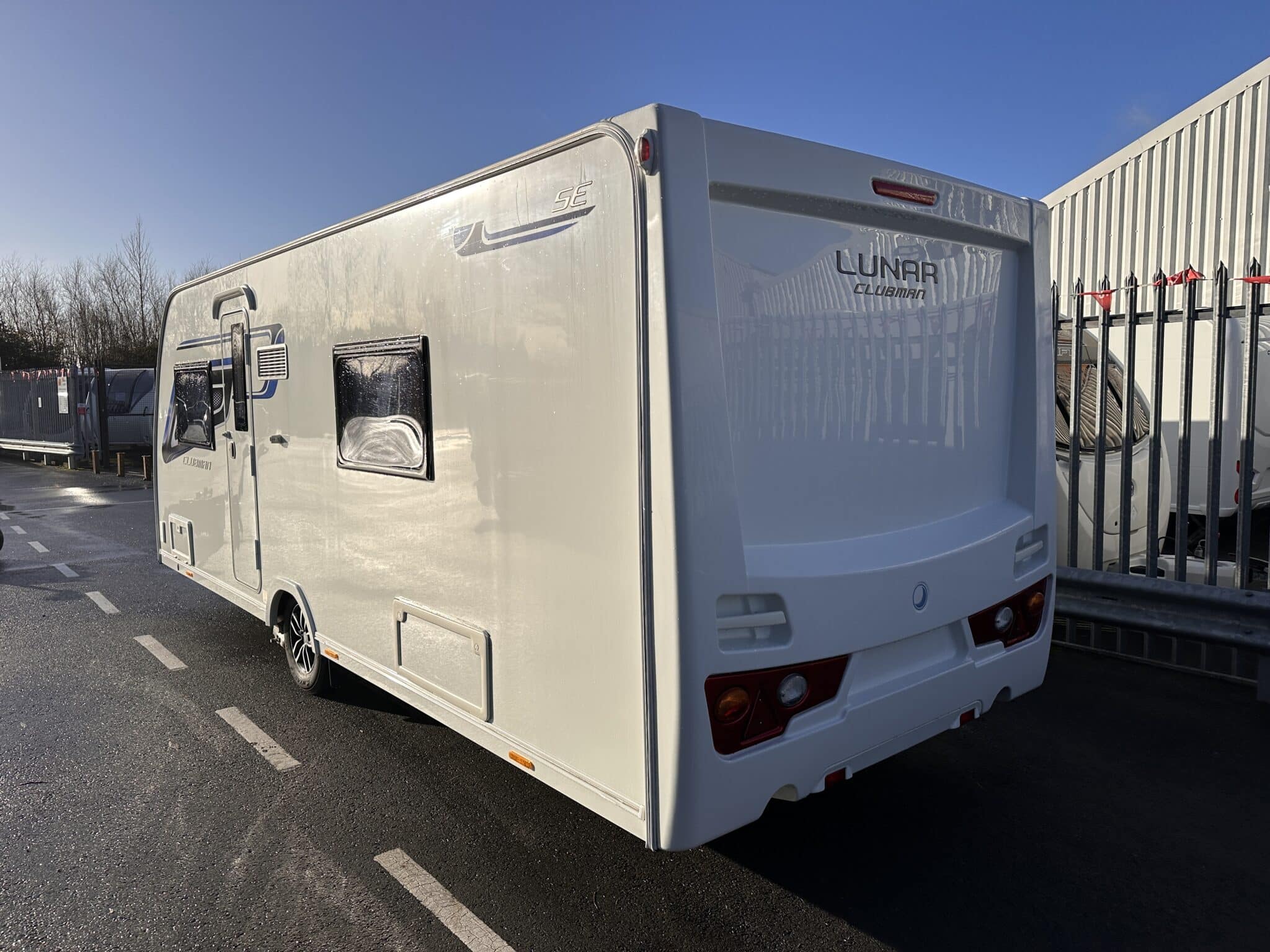The 2019 Lunar Clubman SE is a high-specification touring caravan that remains relatively lightweight for its class. It features the classic fixed French bed layout with a full-width end washroom, which we find is a very practical setup for couples who want permanent sleeping arrangements and a good-sized washroom. This model is fitted with Alde wet central heating and has a Powrtouch motor mover and ATC Trailer Control already installed. As with all our used caravans, it has undergone a comprehensive workshop inspection and full damp check.