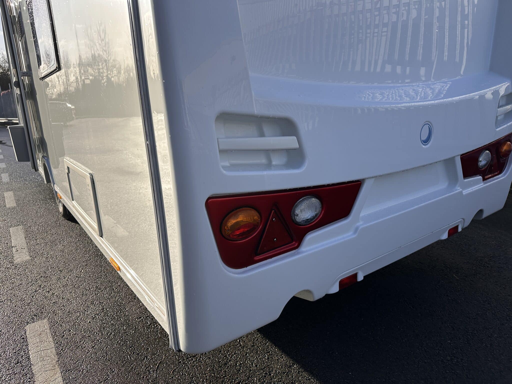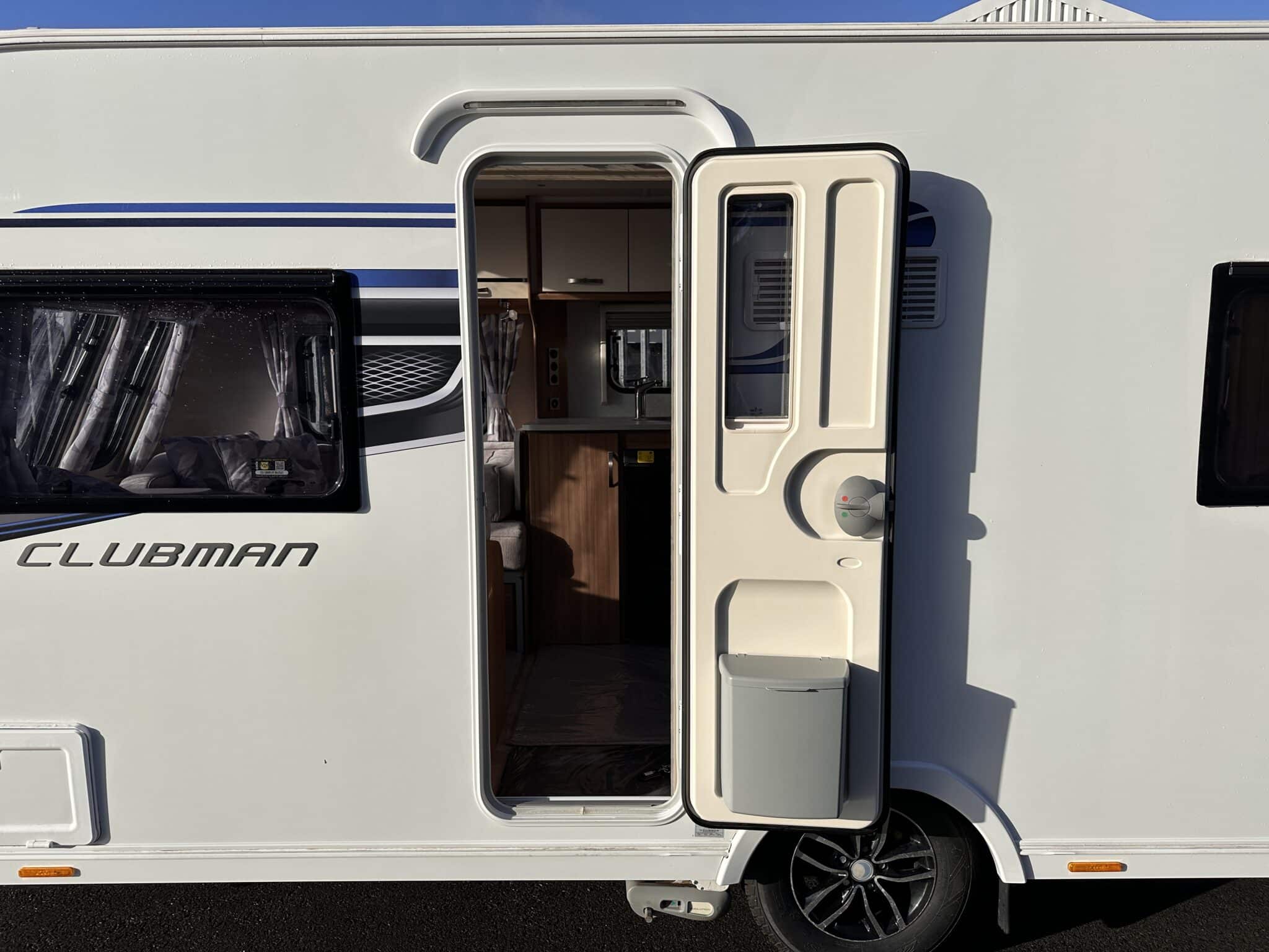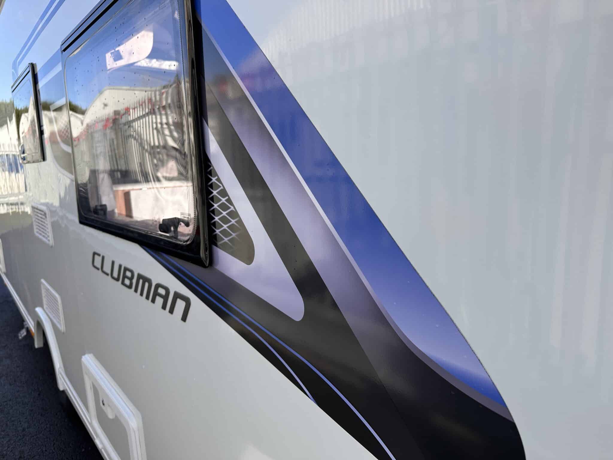 1. What is the layout of the Clubman SE? This model features a fixed French bed in the rear corner. This setup offers a permanent bed while keeping the rest of the caravan open-plan. At the rear is a full-width washroom with a separate shower cubicle.