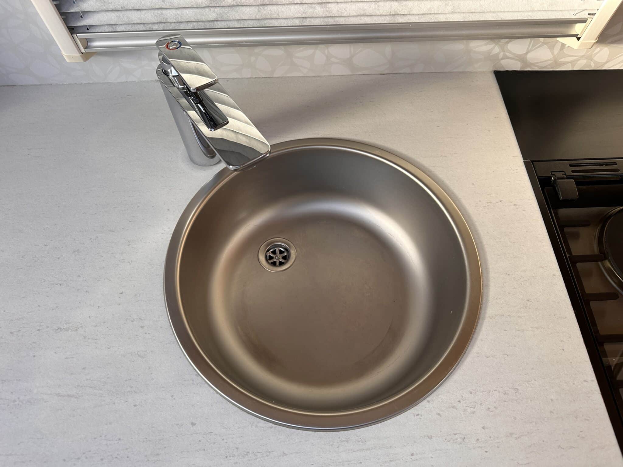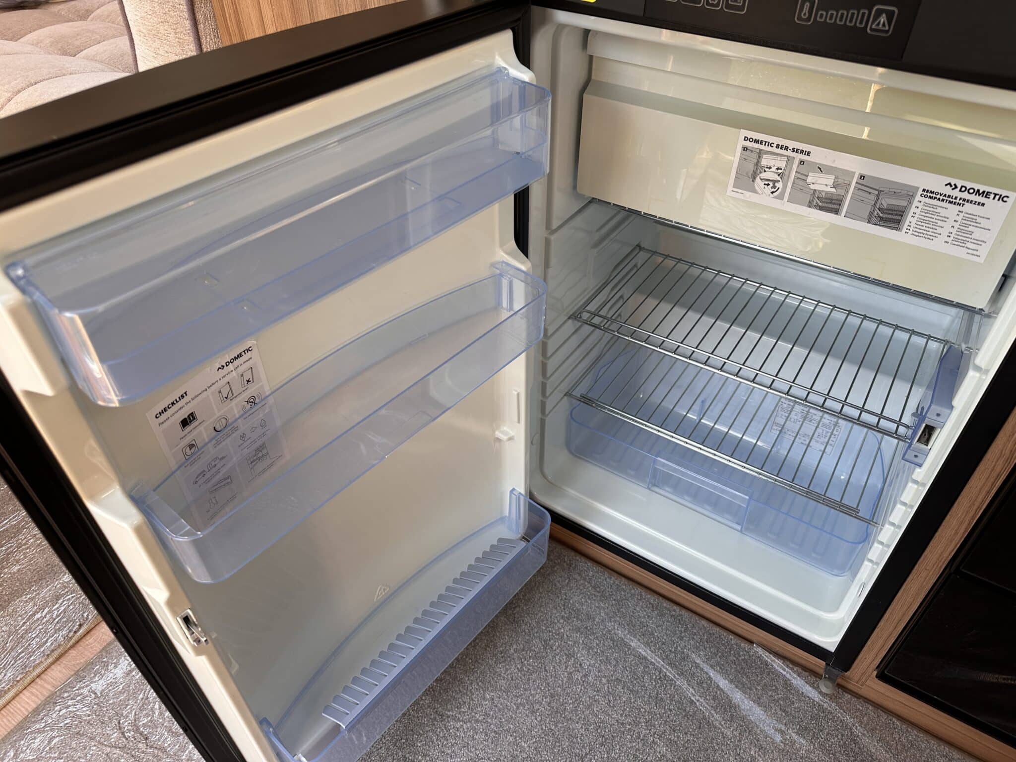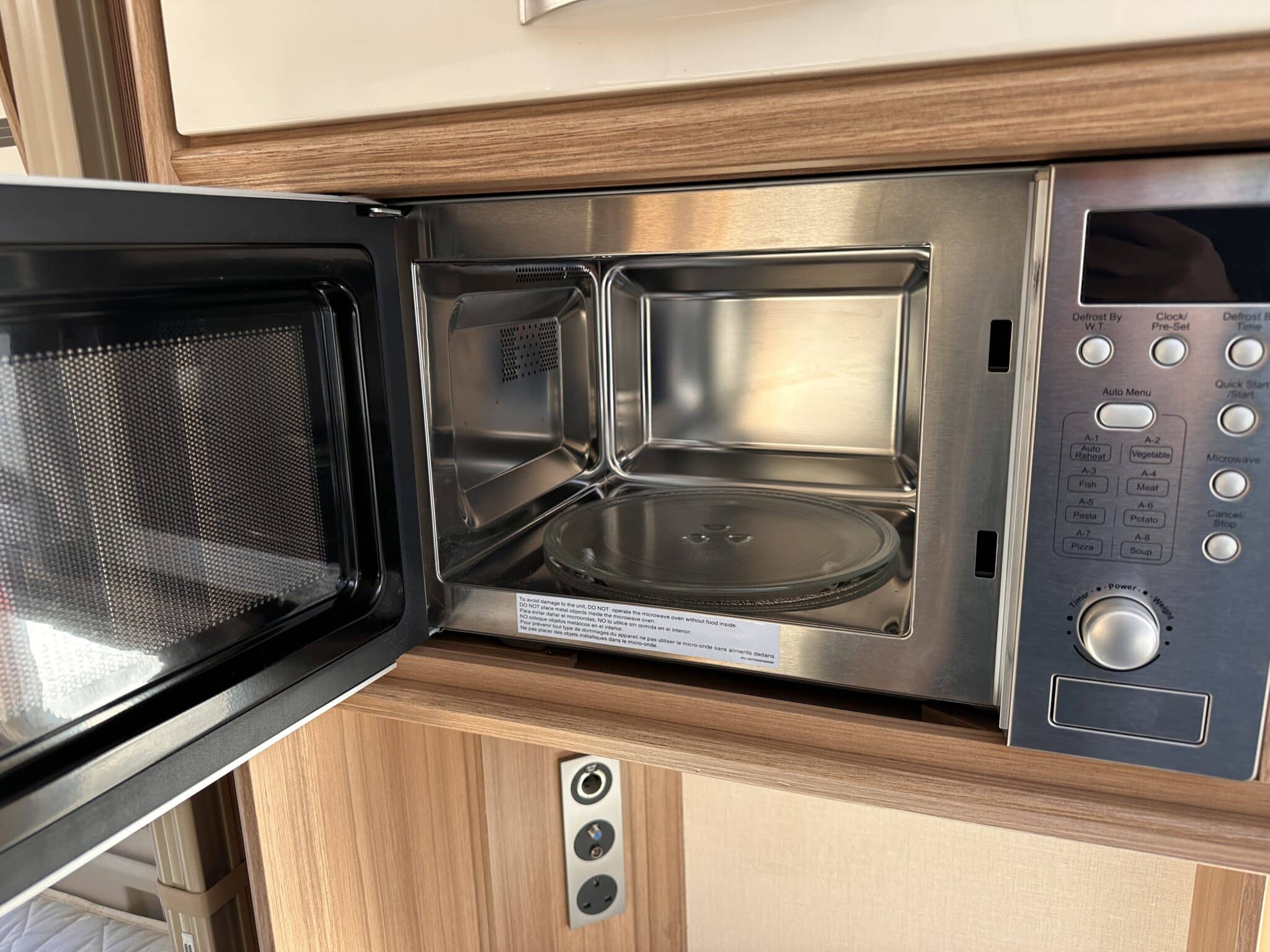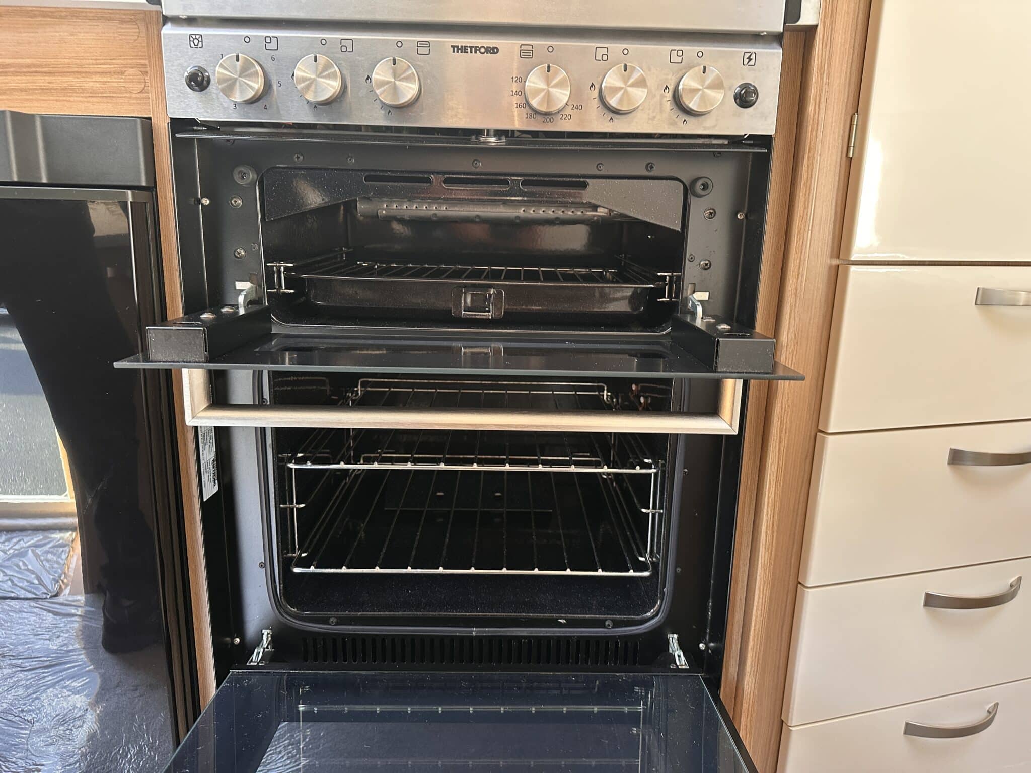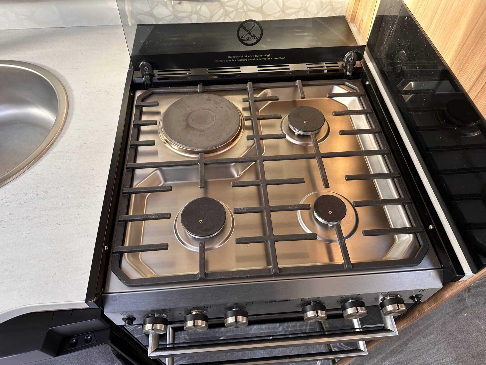 Kitchen: The kitchen area is practical, with a good amount of worktop space including a lift-up flap. It is equipped with a Thetford oven and separate grill, a dual-fuel hob (3 gas, 1 electric), a microwave, and a Dometic fridge/freezer.