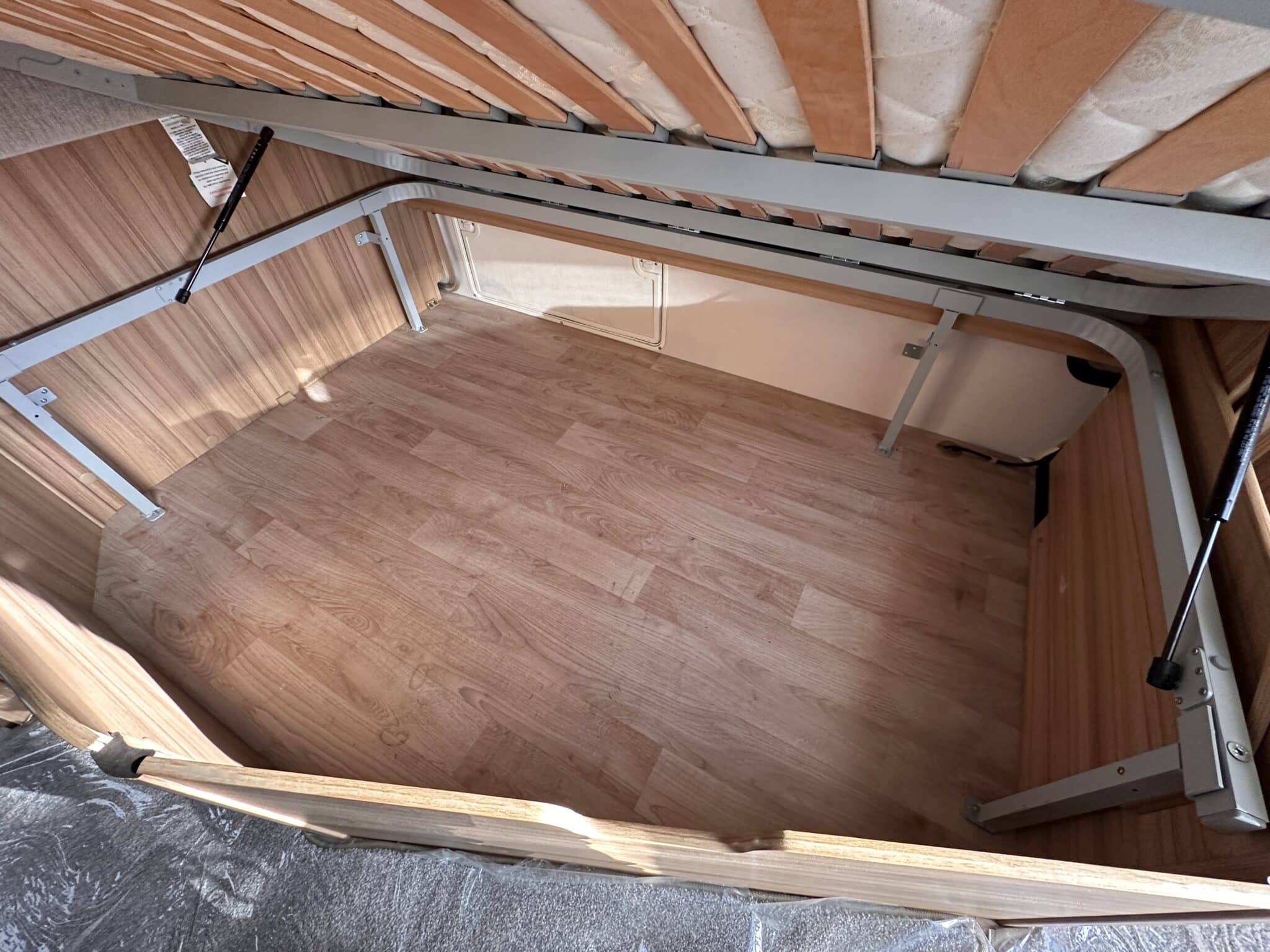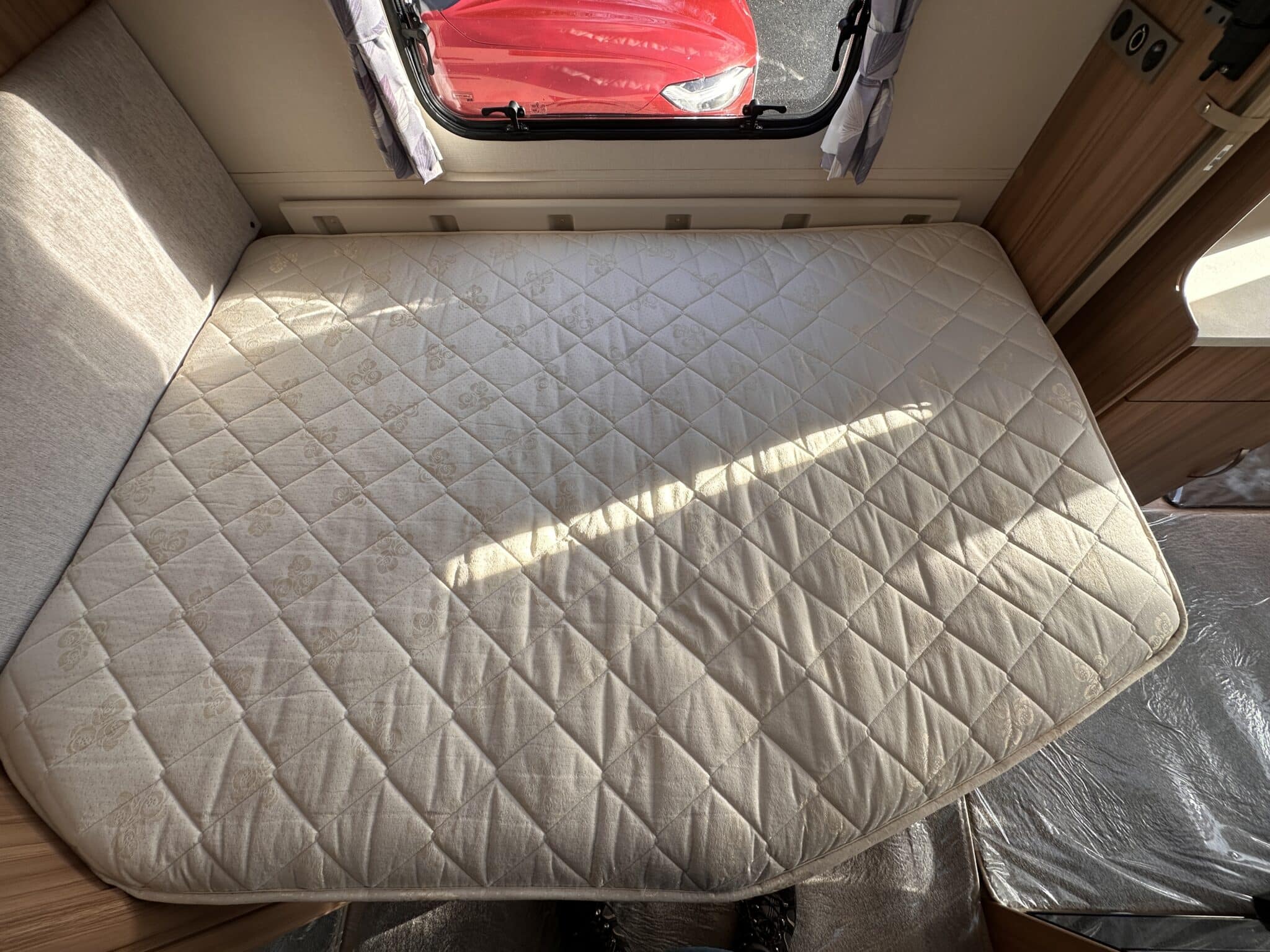 Bedroom: The rear bedroom features a fixed French bed. This layout provides a permanent bed with a large storage area underneath, which is easy to access.