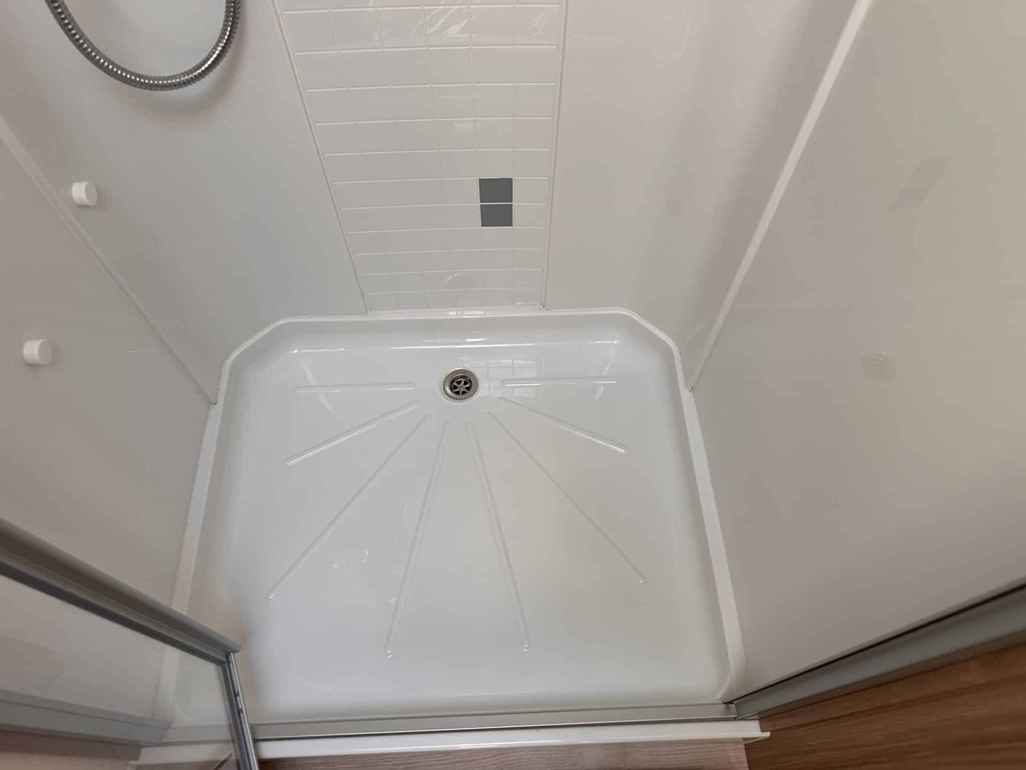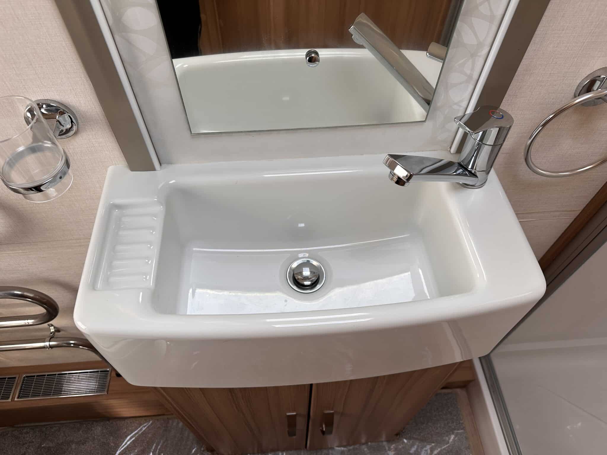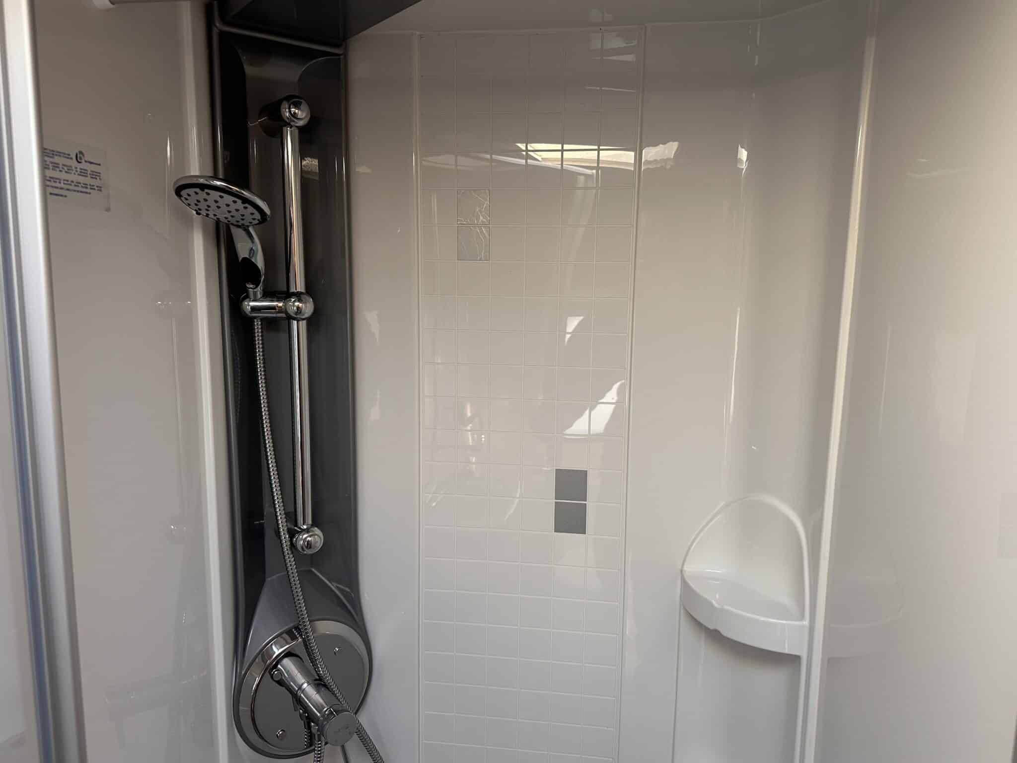 End Washroom: At the rear, there is a full-width washroom. It includes a separate lined shower cubicle, a cassette toilet, and a vanity unit with a top-mounted sink.