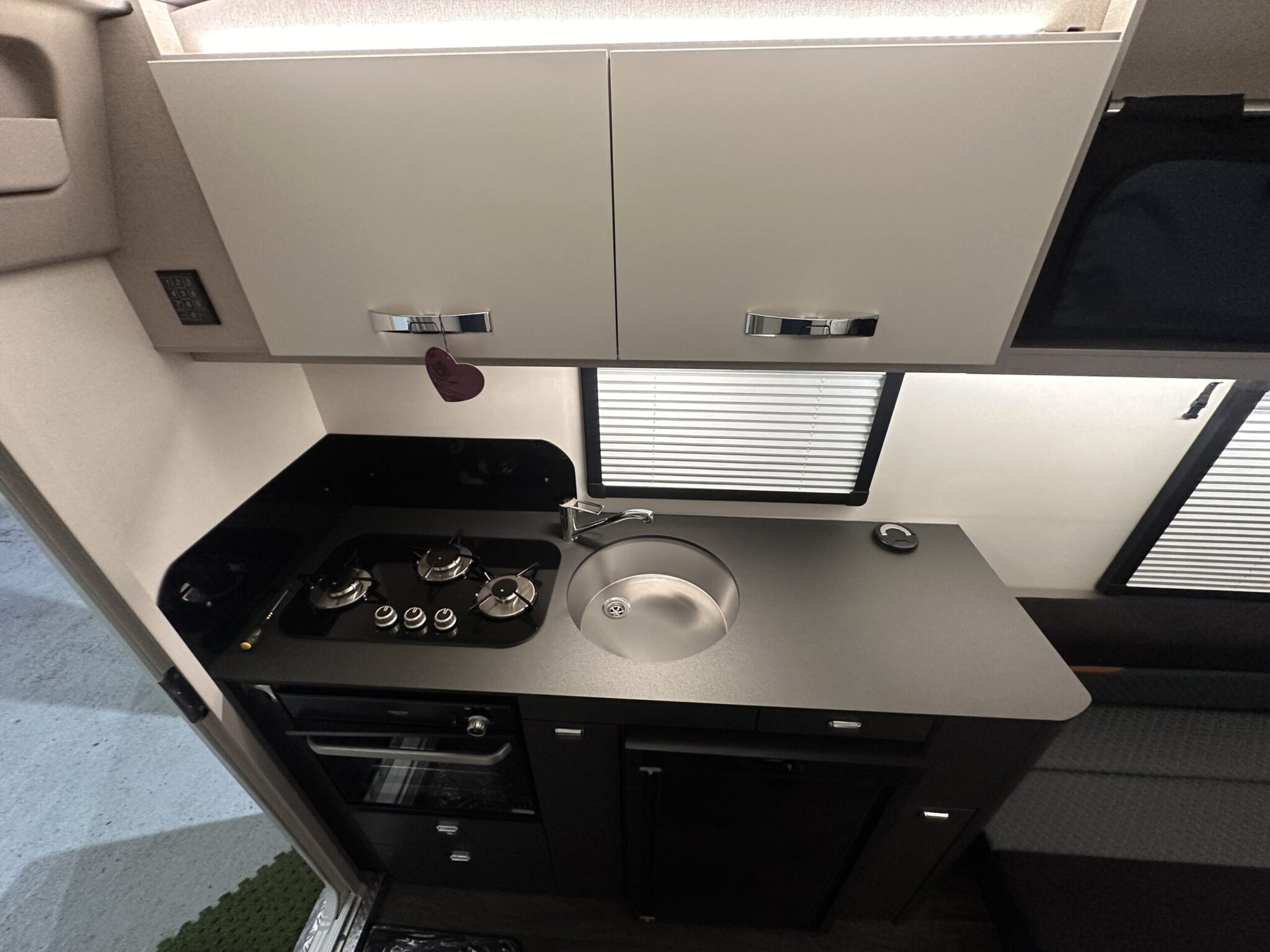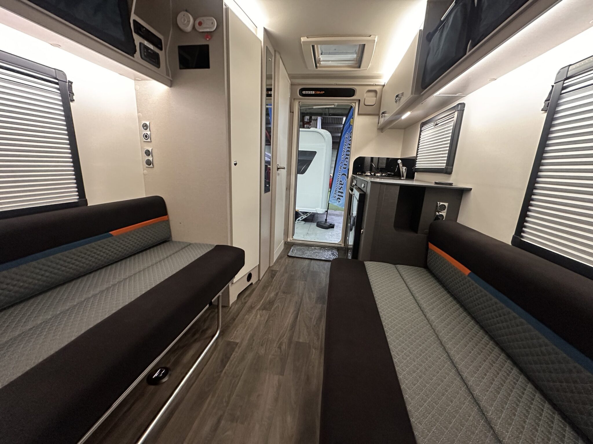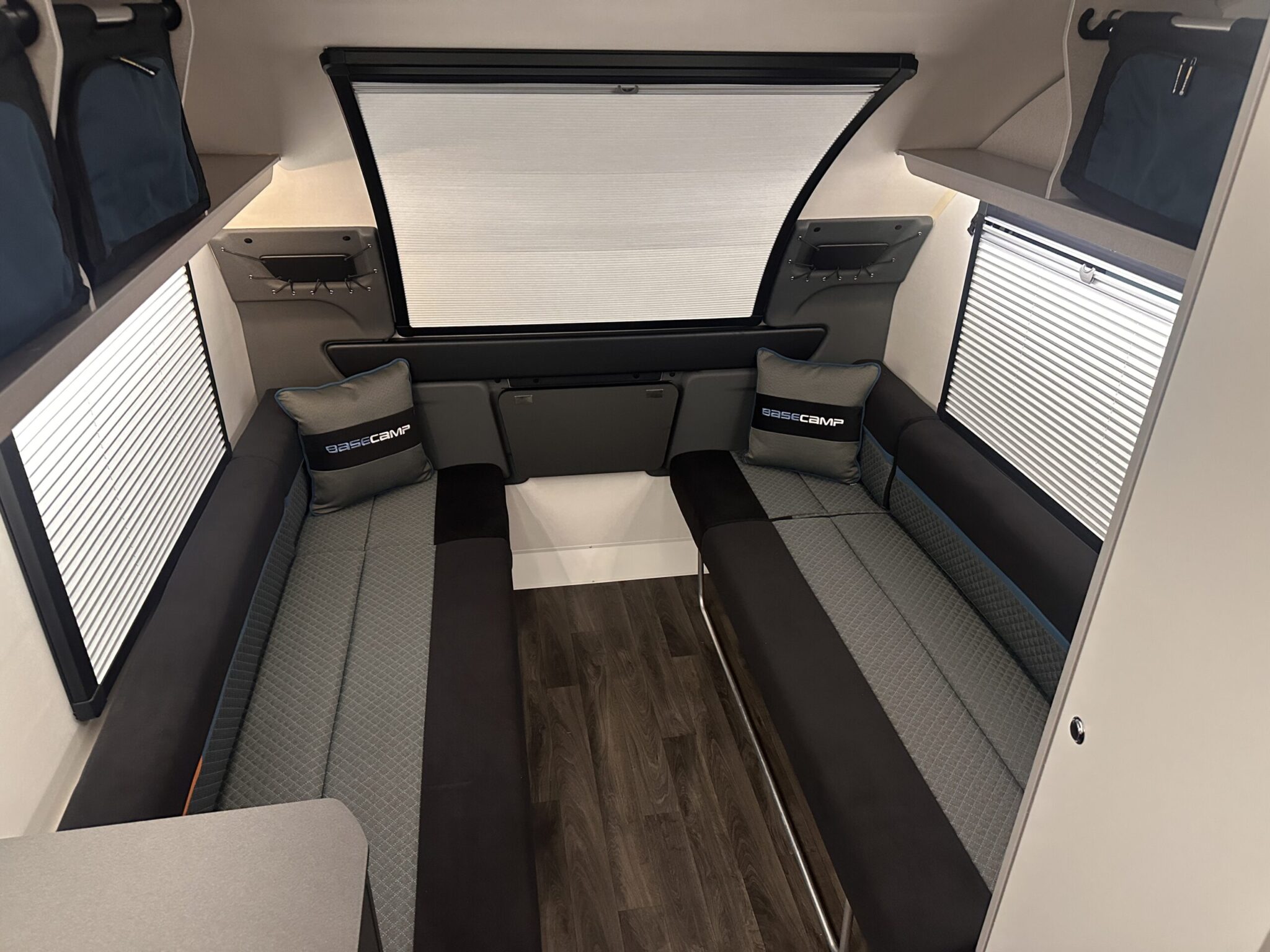 Front seating easily converts to a  spacious and comfy double bed — plus cassette pleated blinds to all windows