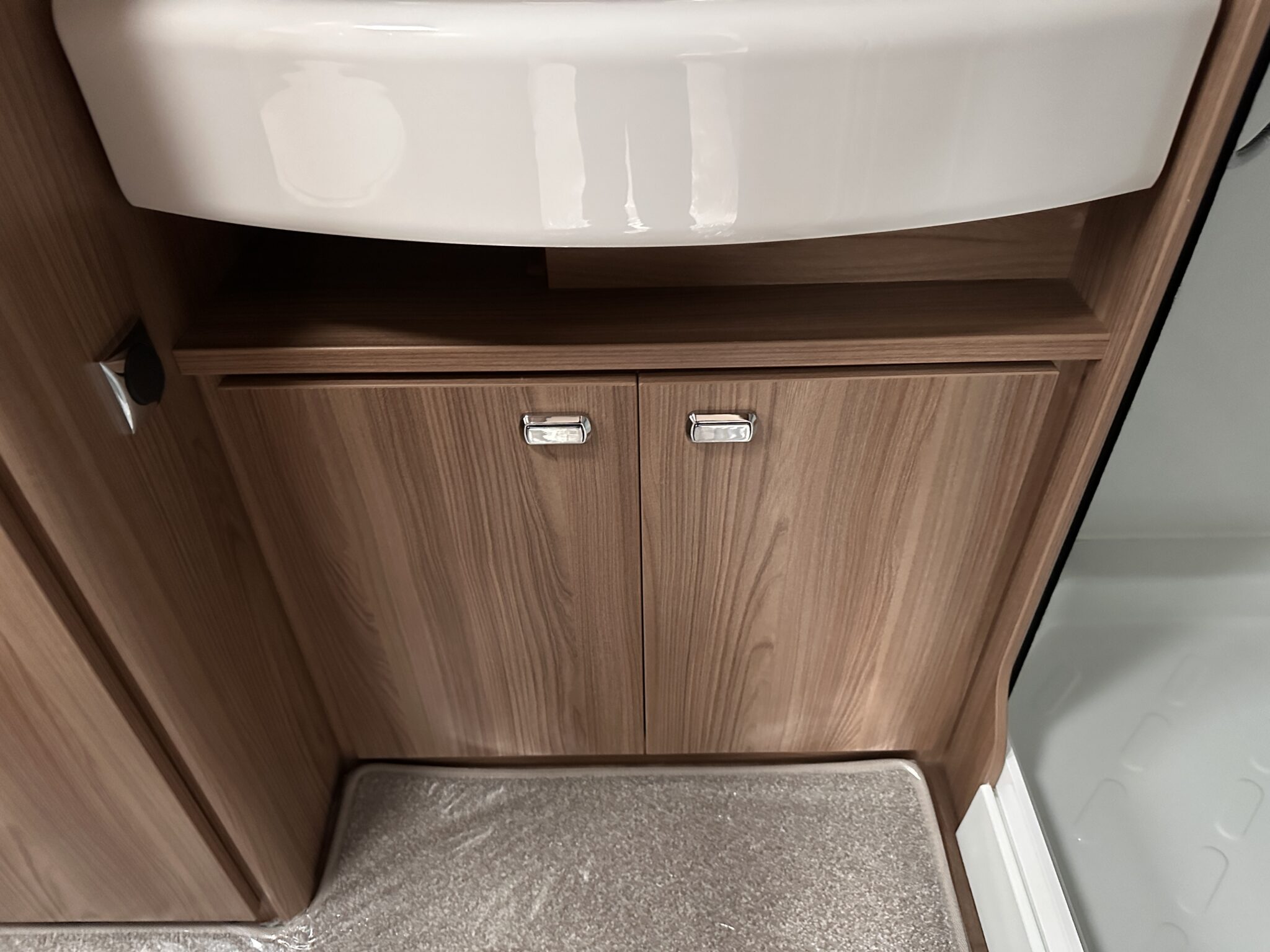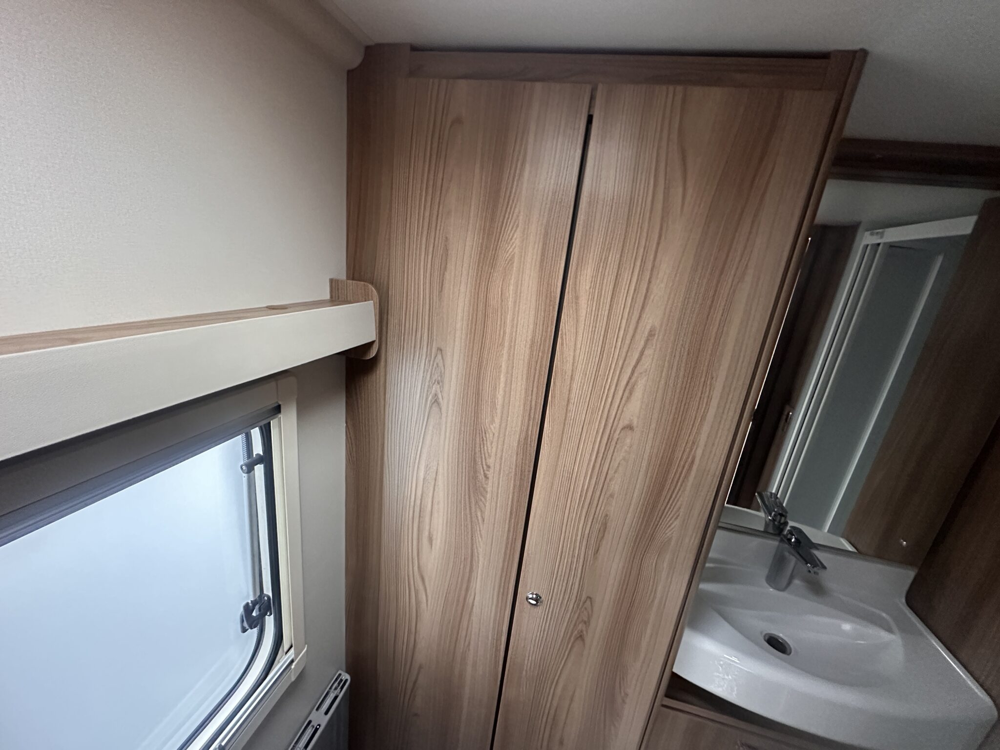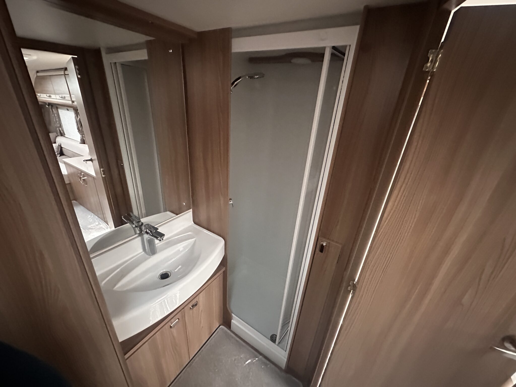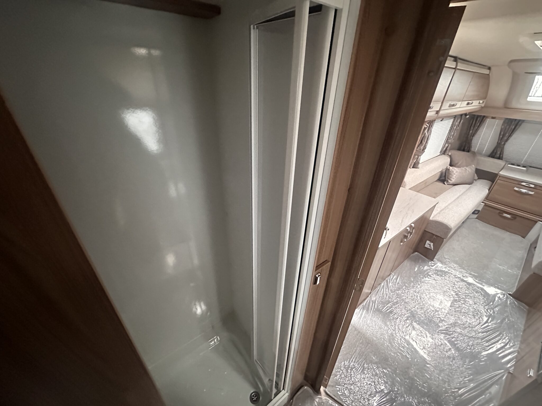 The full-width end washroom is notably spacious for a 2-berth caravan, featuring a separate lined shower cubicle, vanity unit with mirror, and swivel cassette toilet—all finished to a high standard.Heating