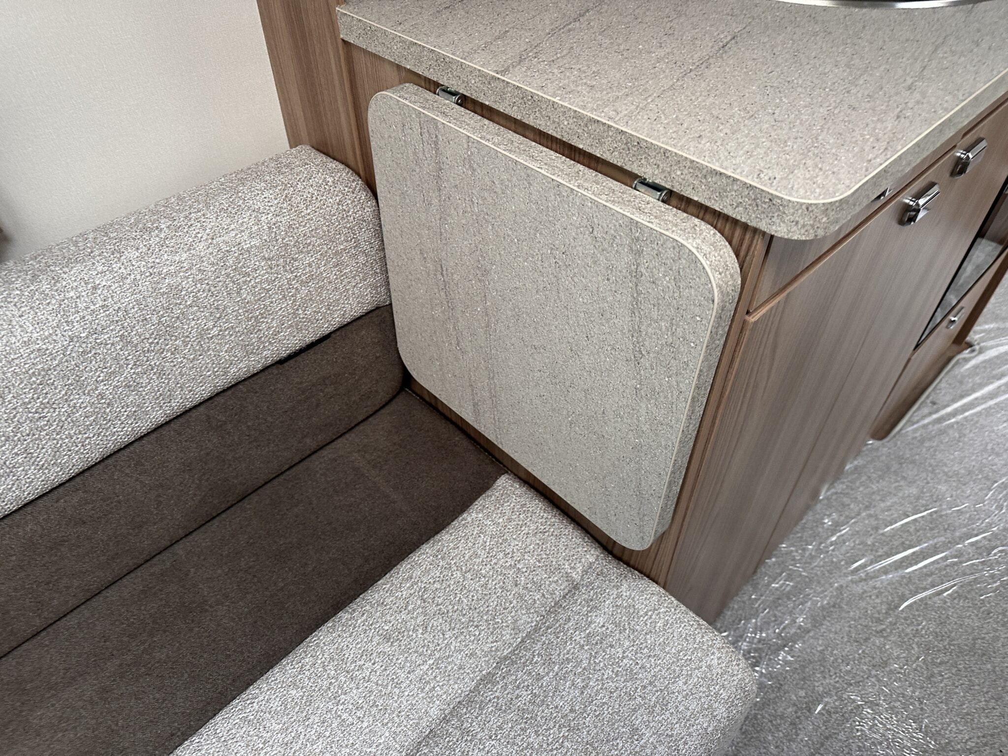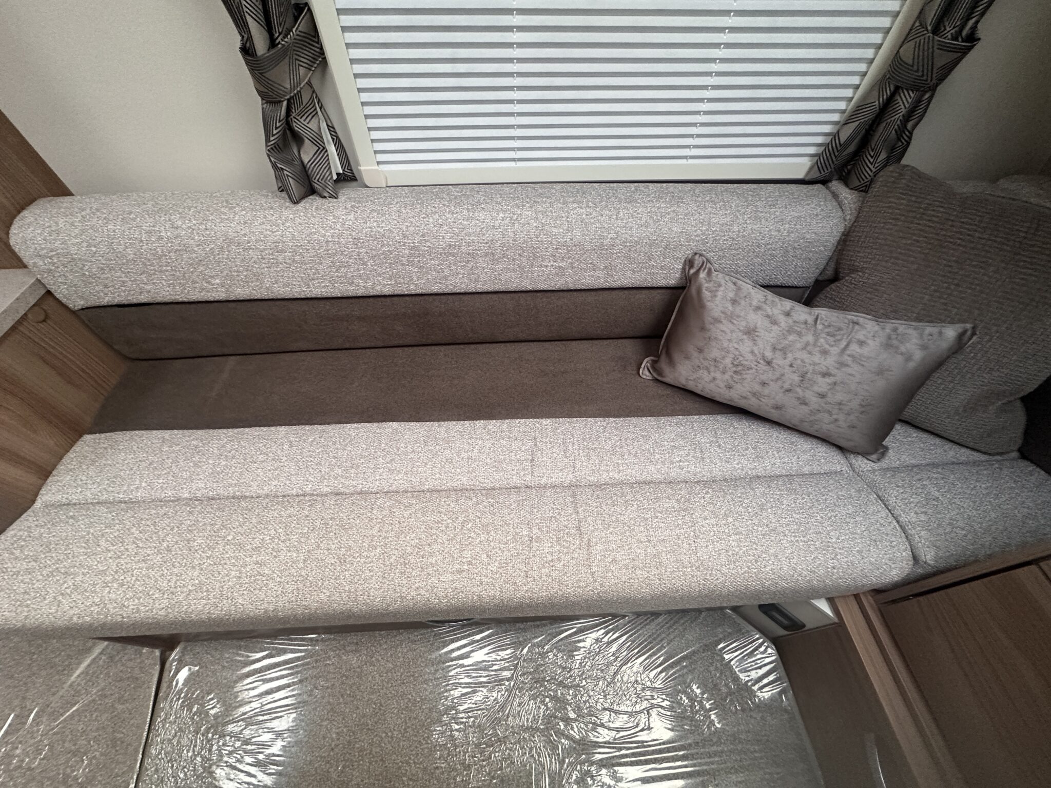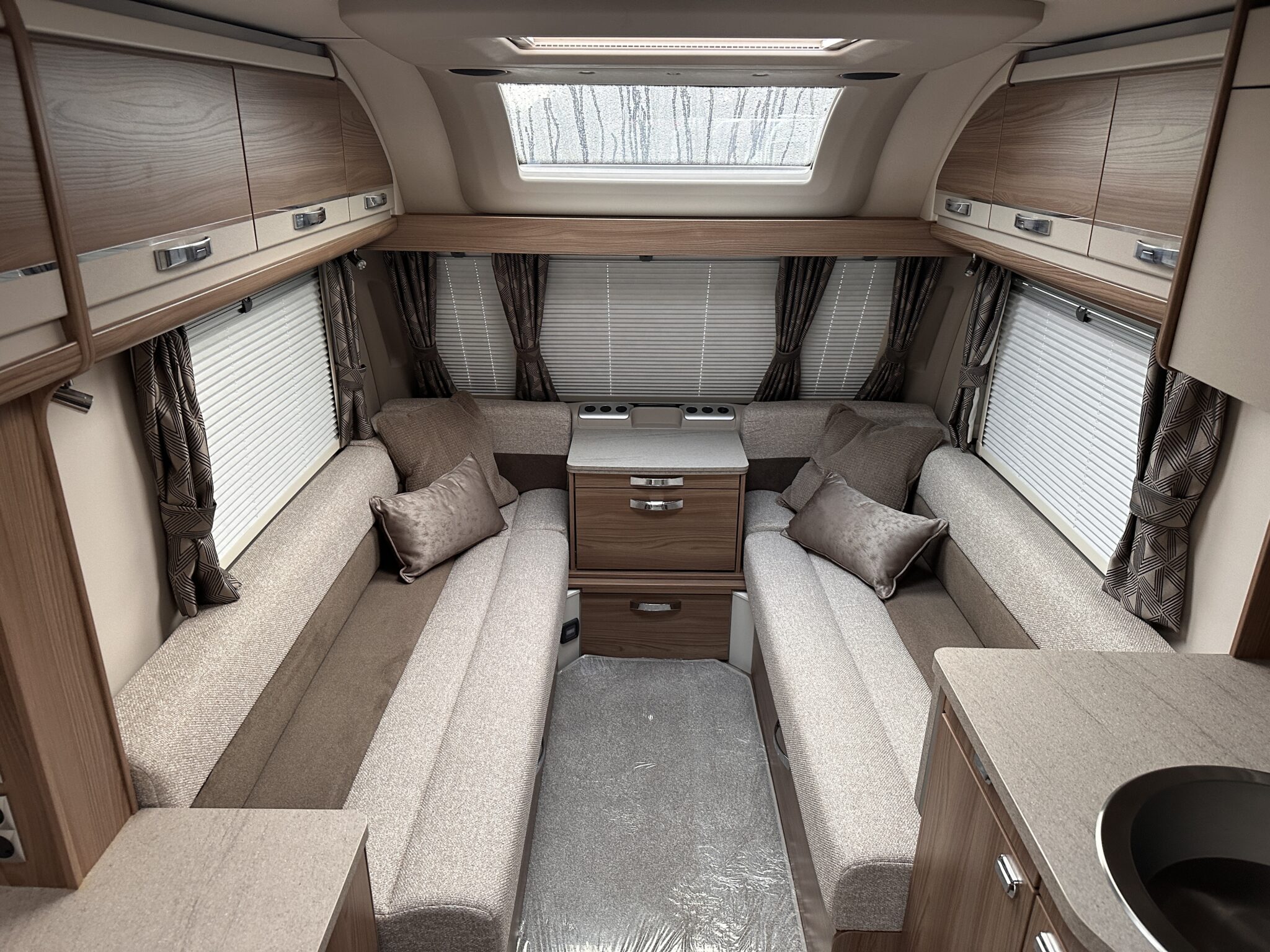 The full-width end washroom is notably spacious for a 2-berth caravan, featuring a separate lined shower cubicle, vanity unit with mirror, and swivel cassette toilet—all finished to a high standard.Heating