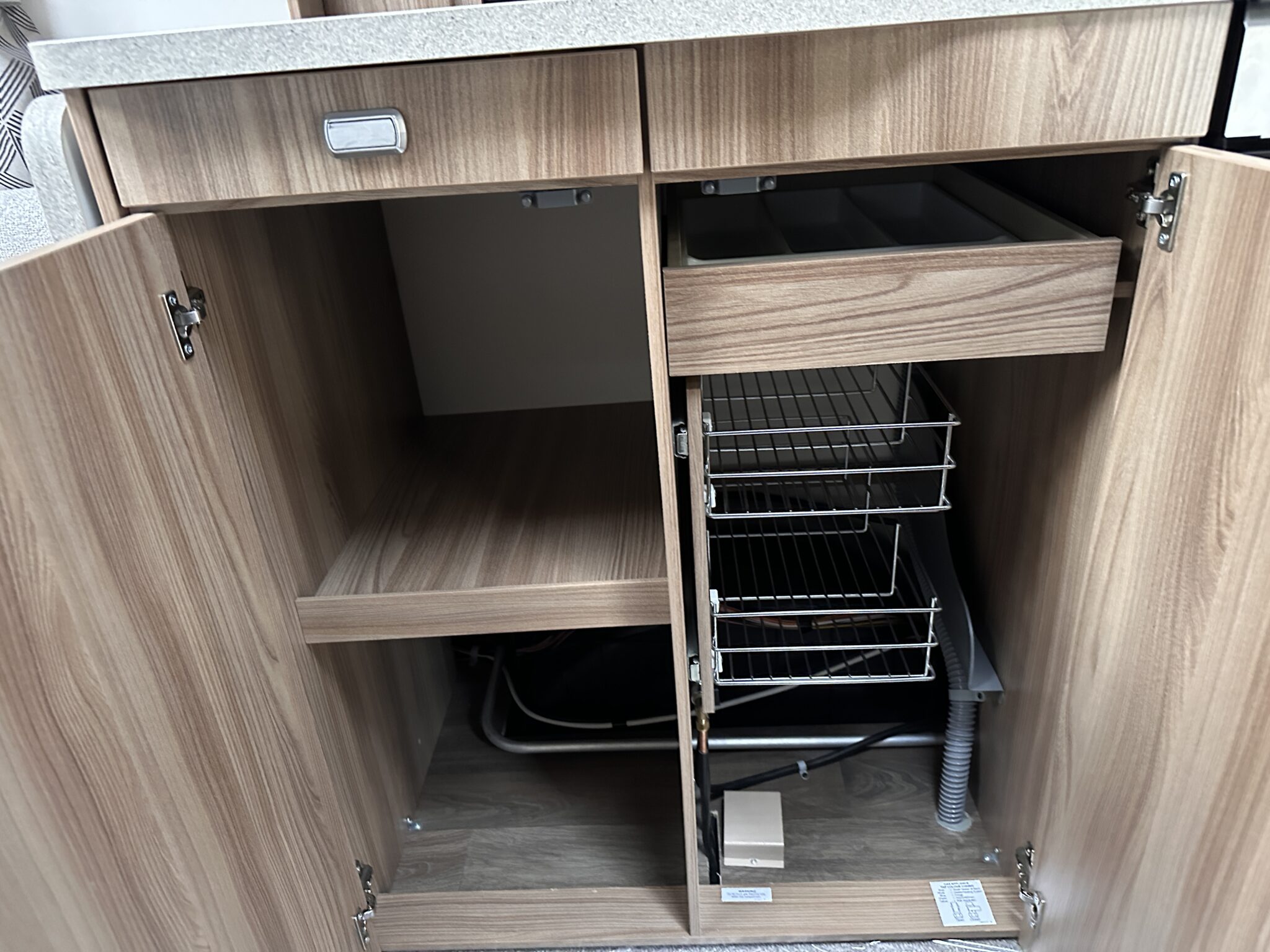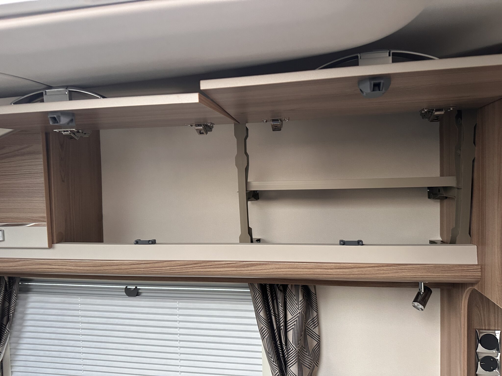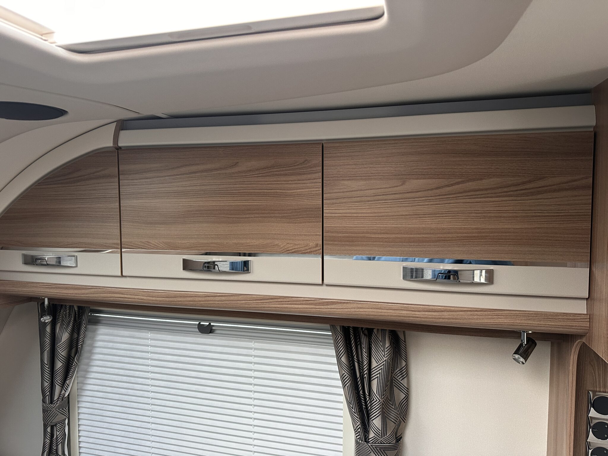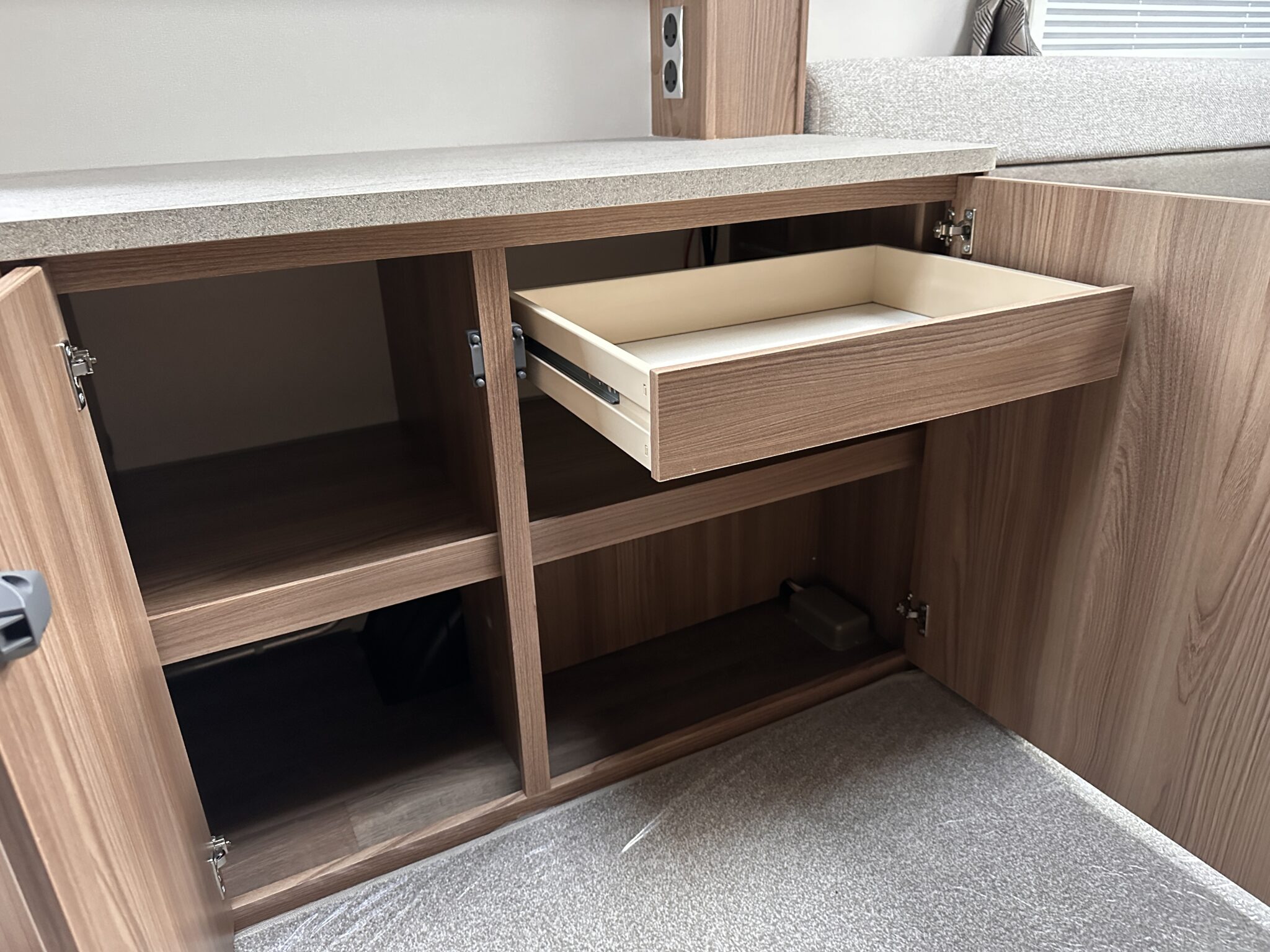 The full-width end washroom is notably spacious for a 2-berth caravan, featuring a separate lined shower cubicle, vanity unit with mirror, and swivel cassette toilet—all finished to a high standard.Heating