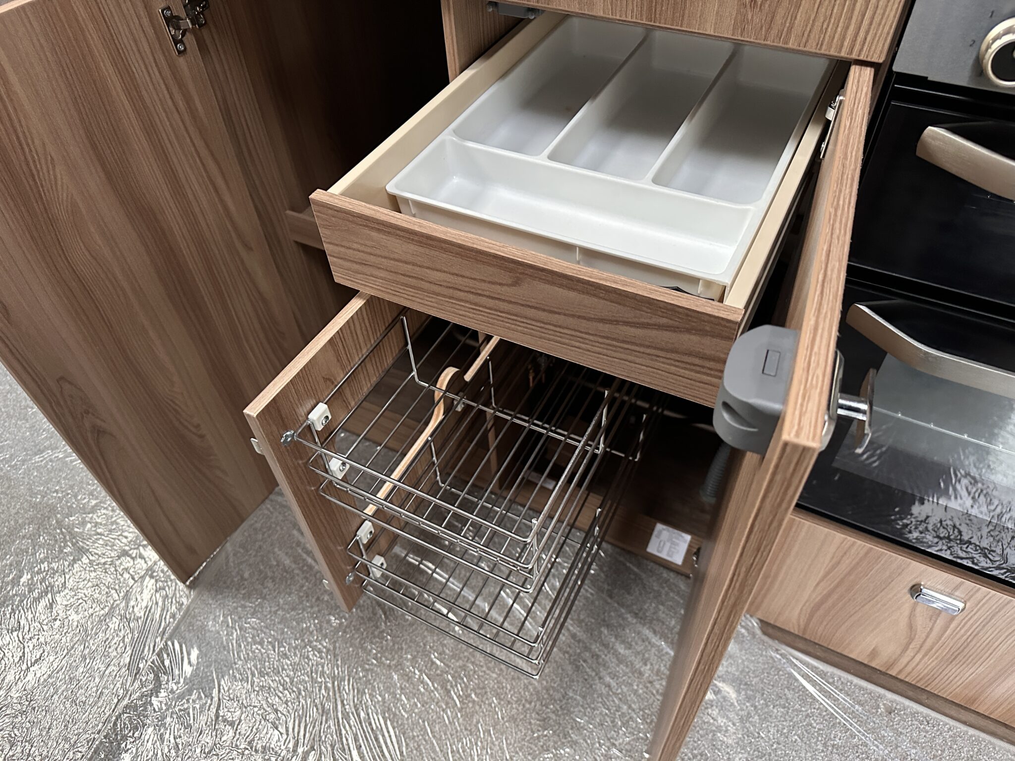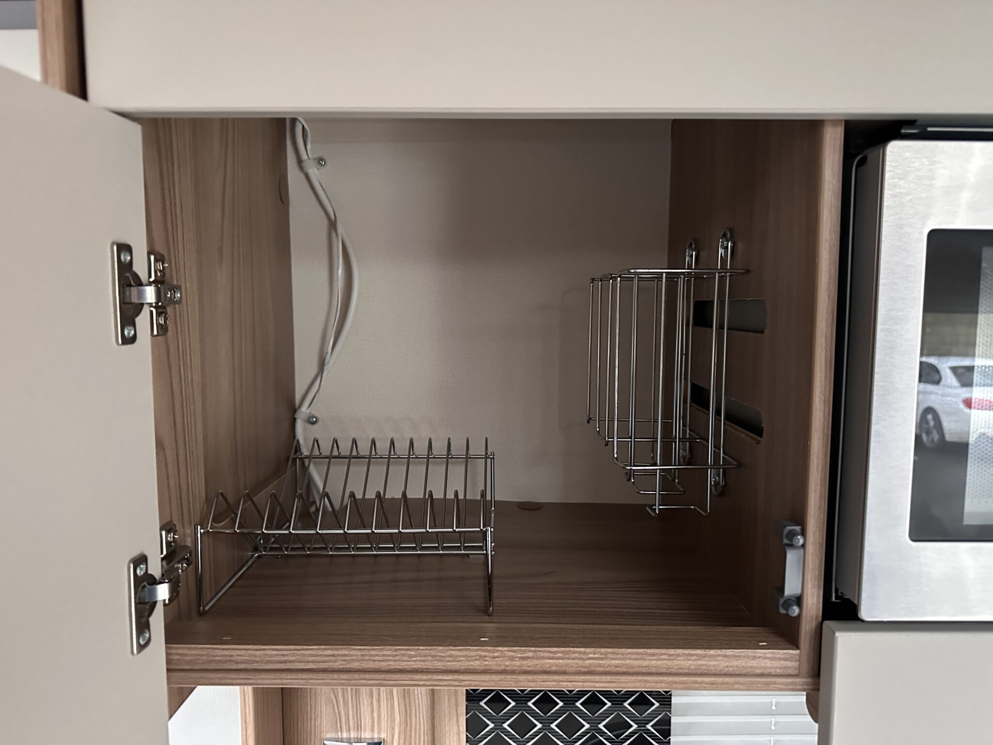 The front lounge features comfortable parallel sofas that convert into either a spacious double bed or two single beds, offering flexible sleeping arrangements. Large windows flood the space with natural light, creating a bright and welcoming atmosphere.Kitchen