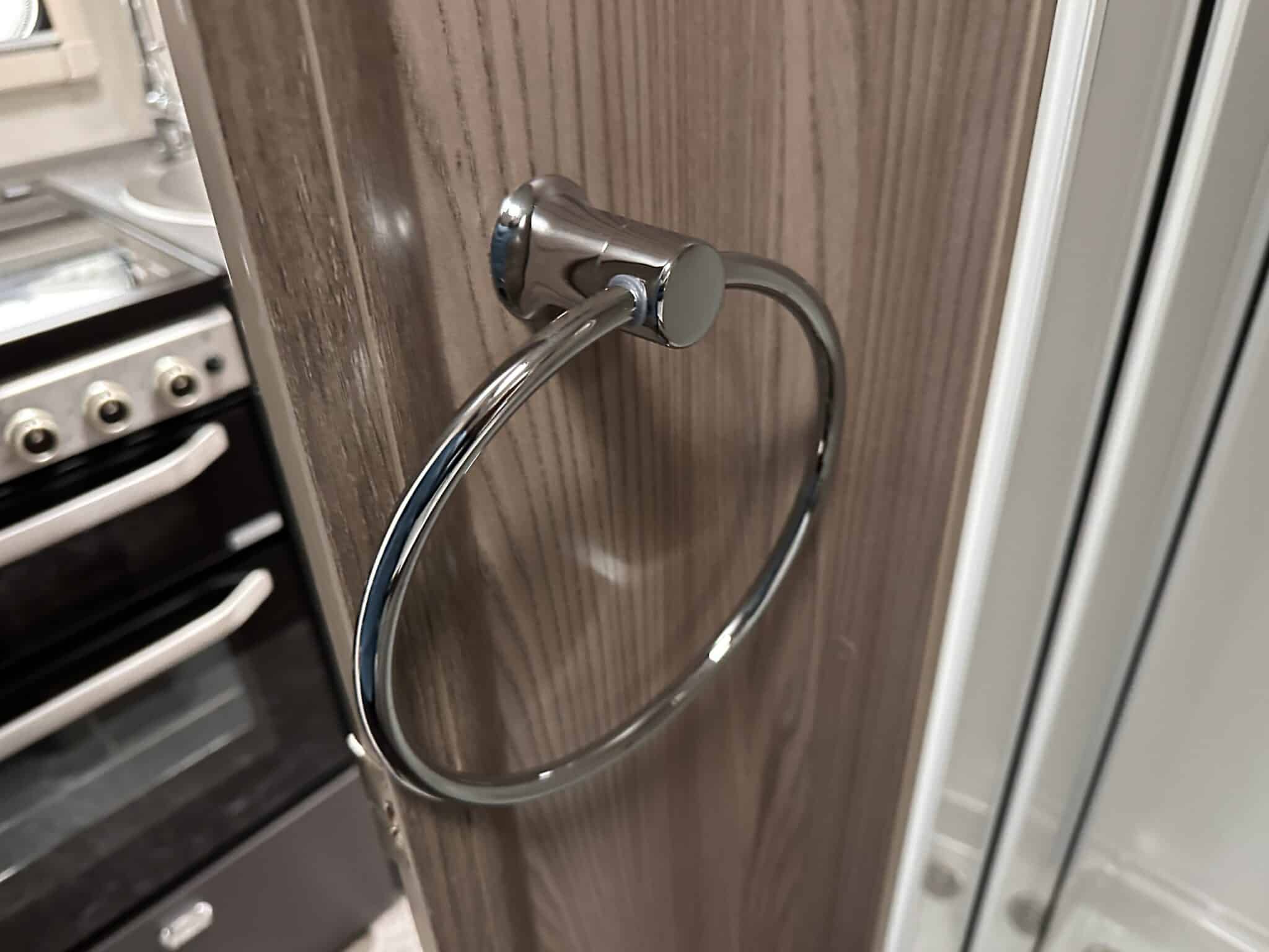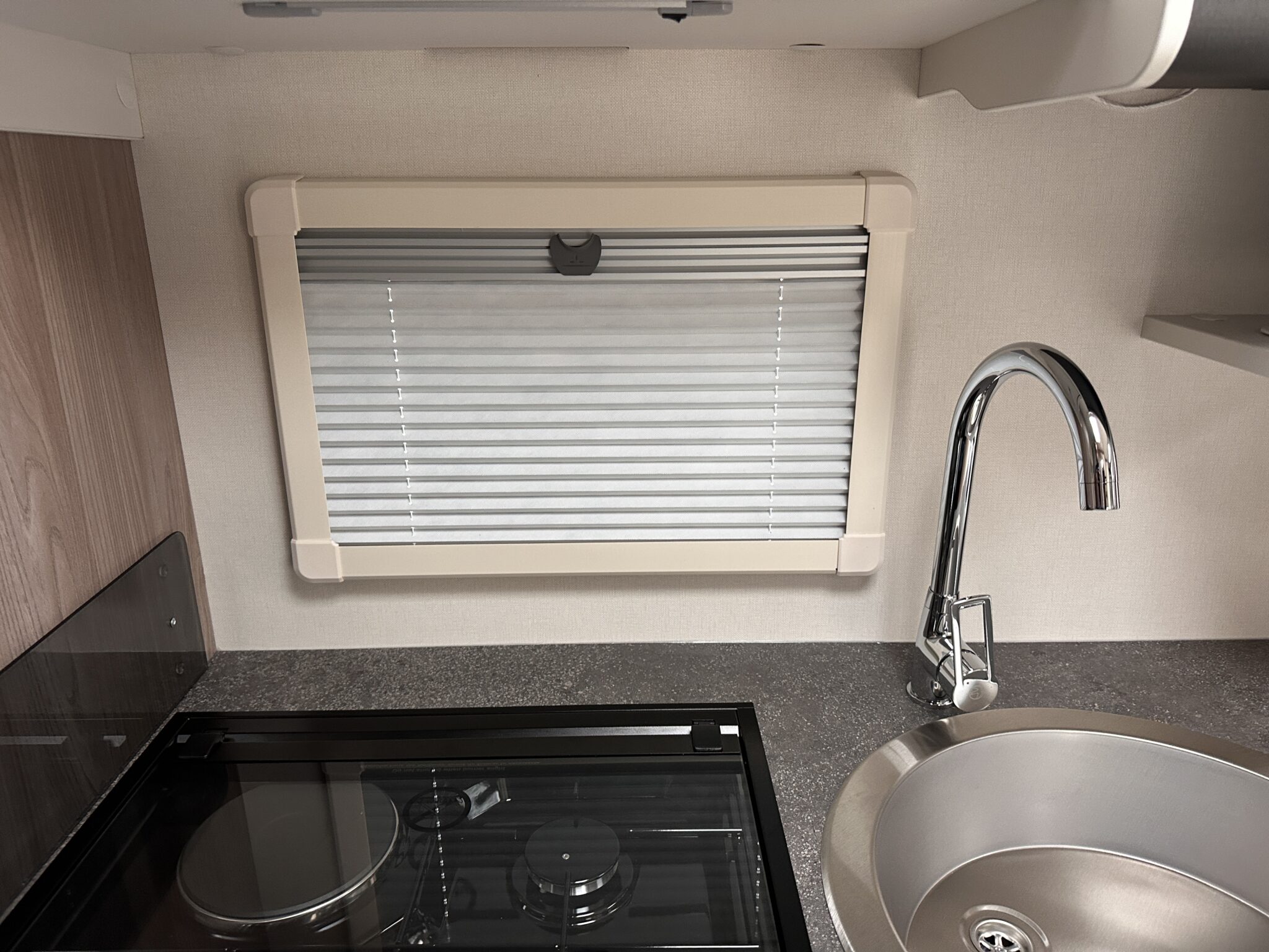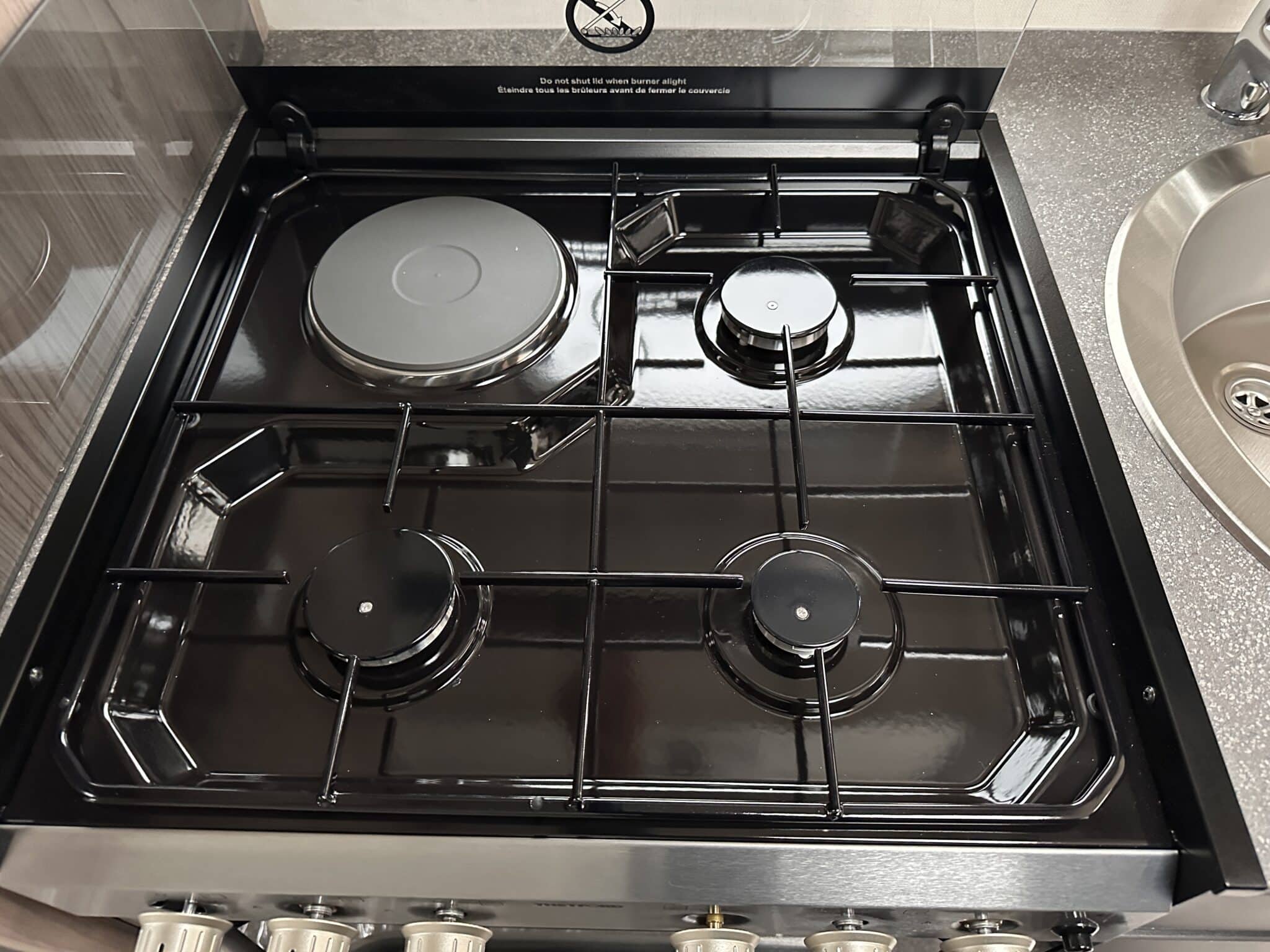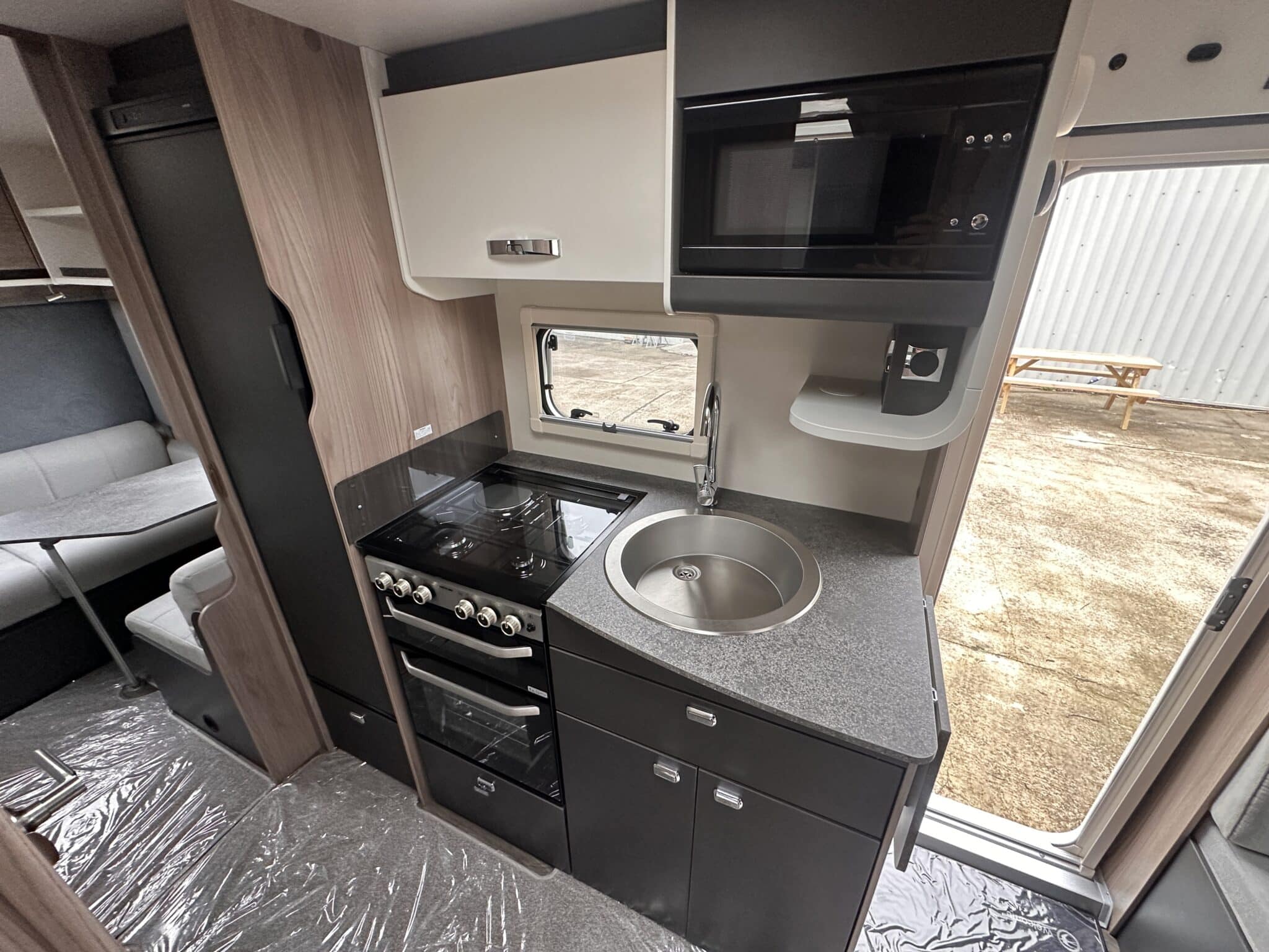Kitchen with Thetford oven, grill, three-burner hob, and fridge